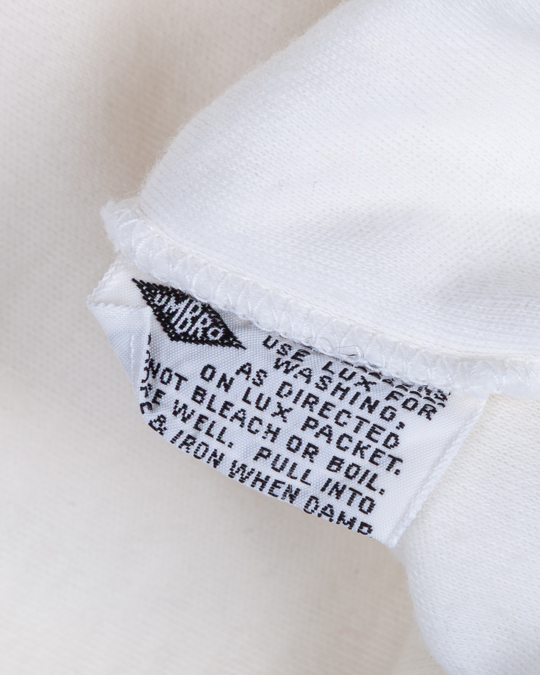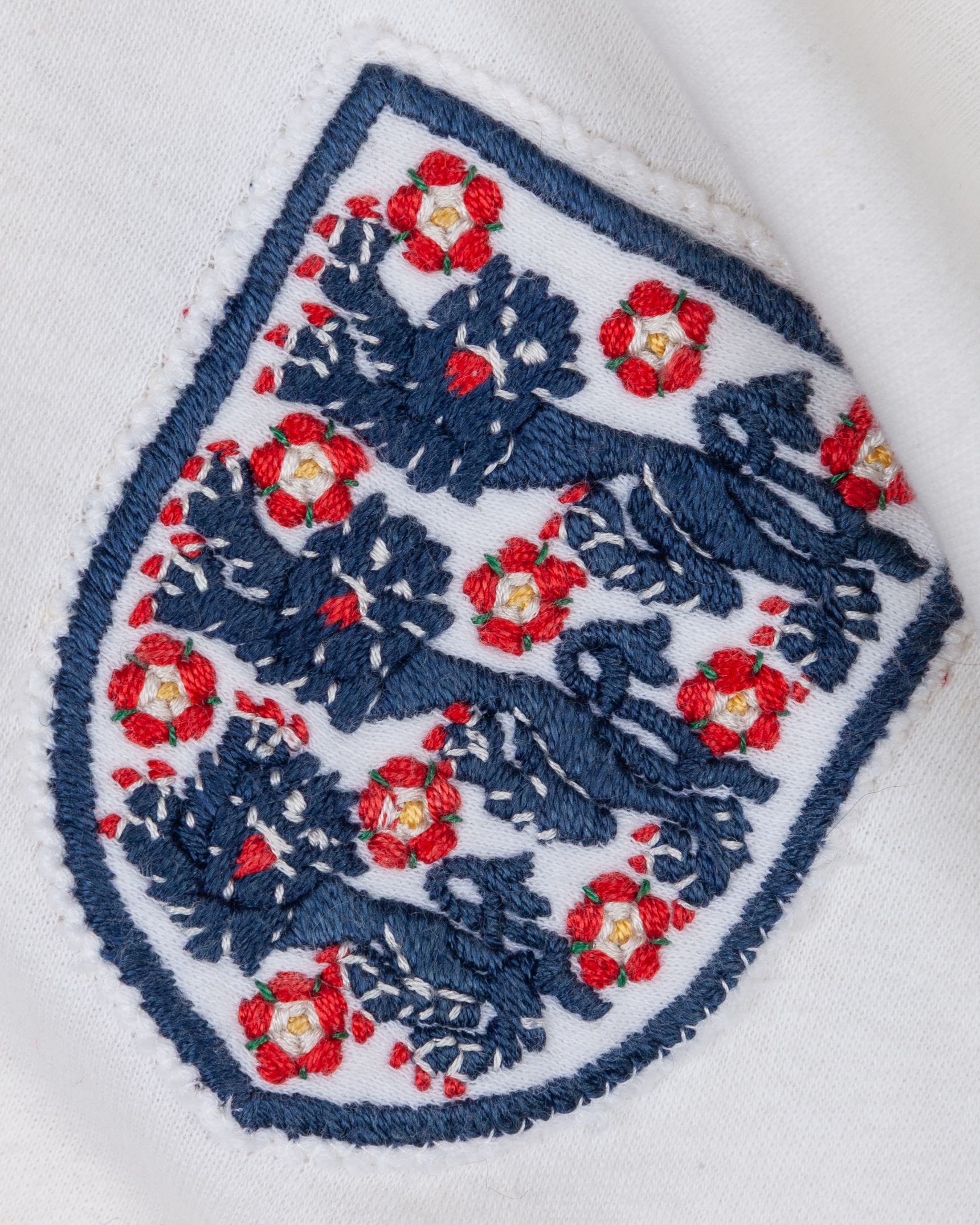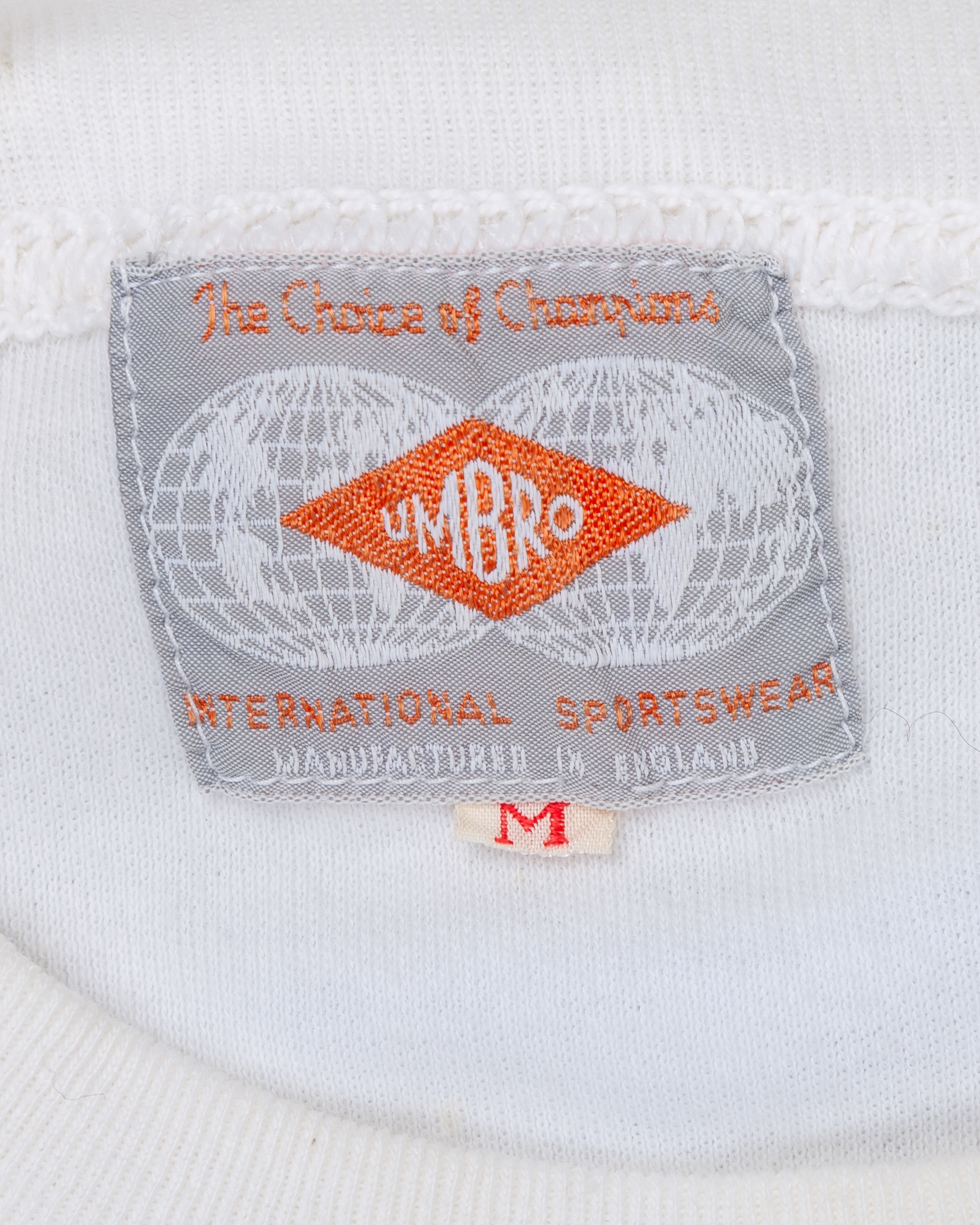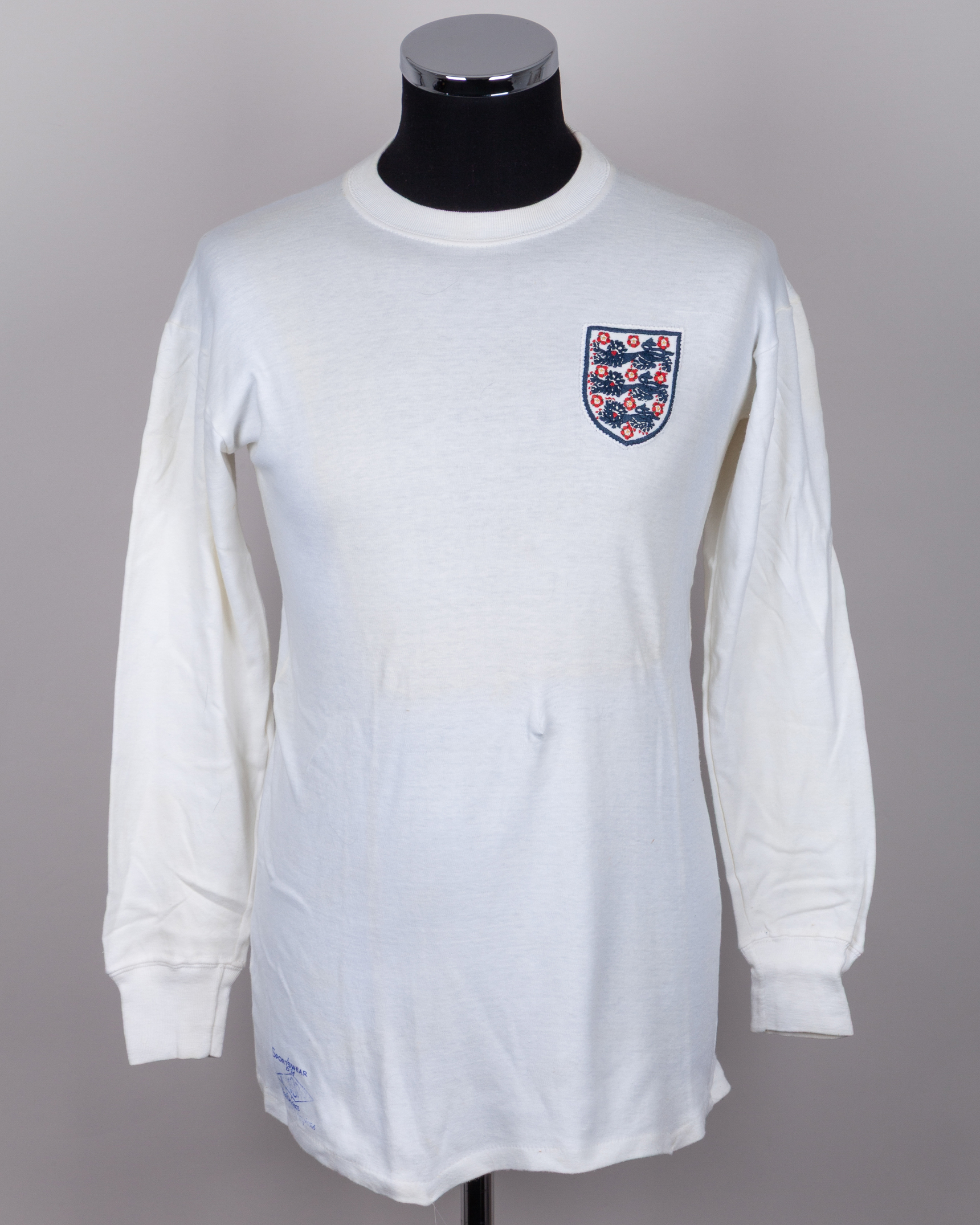 Nobby Stiles white No.4 England match worn long-sleeved shirt, mid 1960s, Umbro, M, with crew-neck collar and embroidered badge, some fading due to framing, holed were pinned and cat gut residue