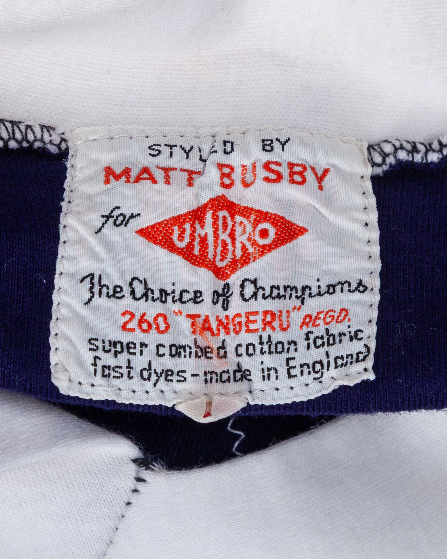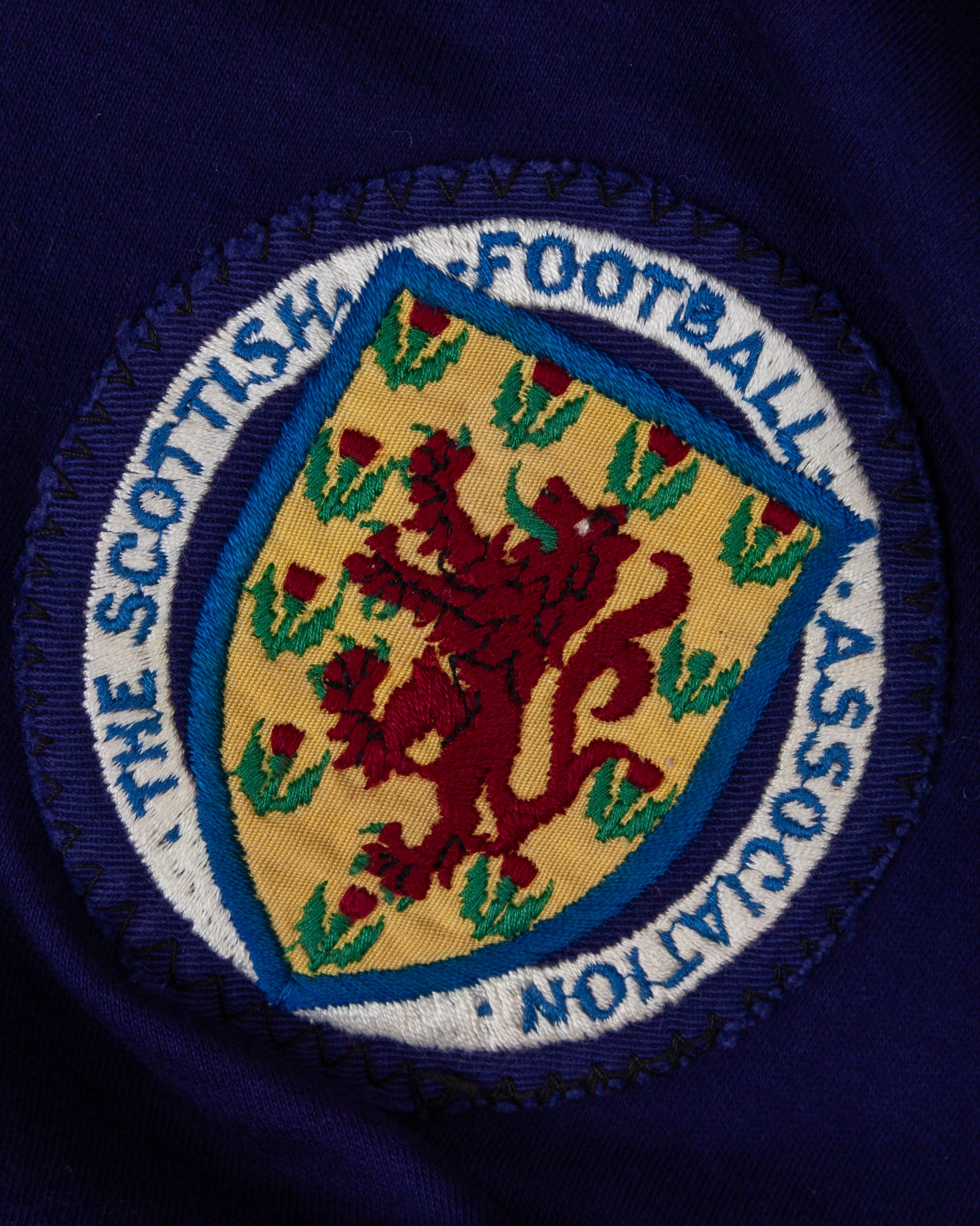Paddy Crerand blue No.4 Scotland v. Northern Ireland match worn short-sleeved shirt, 1963, Umbro, 40 with v-neck collar and embroidered cloth badge inscribed THE SCOTTISH FOOTBALL ASSOCIATION