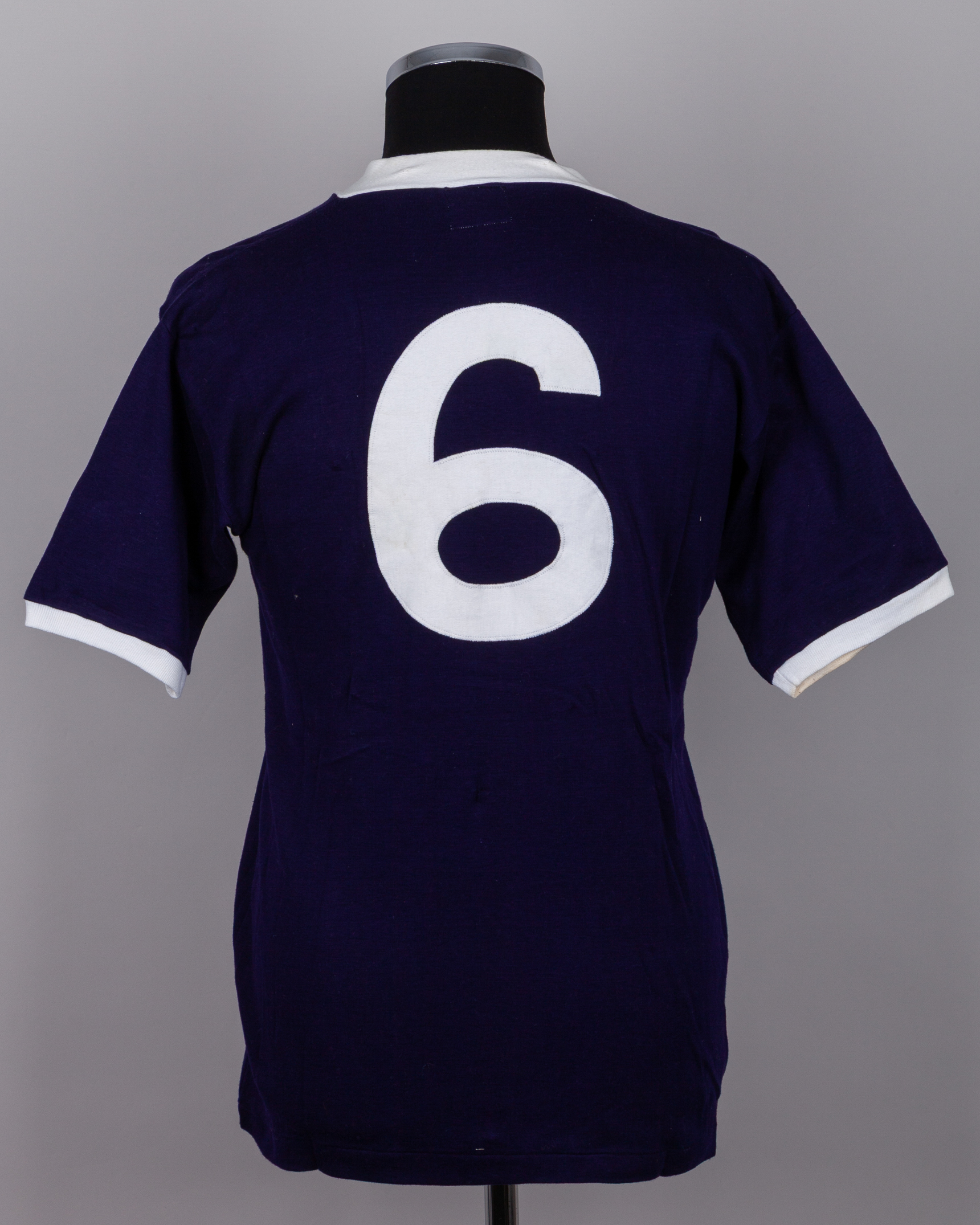 Blue No.6 Scotland v. Northern Ireland match worn short-sleeved shirt, Umbro, 40, with v-neck collar and embroidered cloth badge inscribed THE FOOTBALL ASSOCIATION, staining to collar