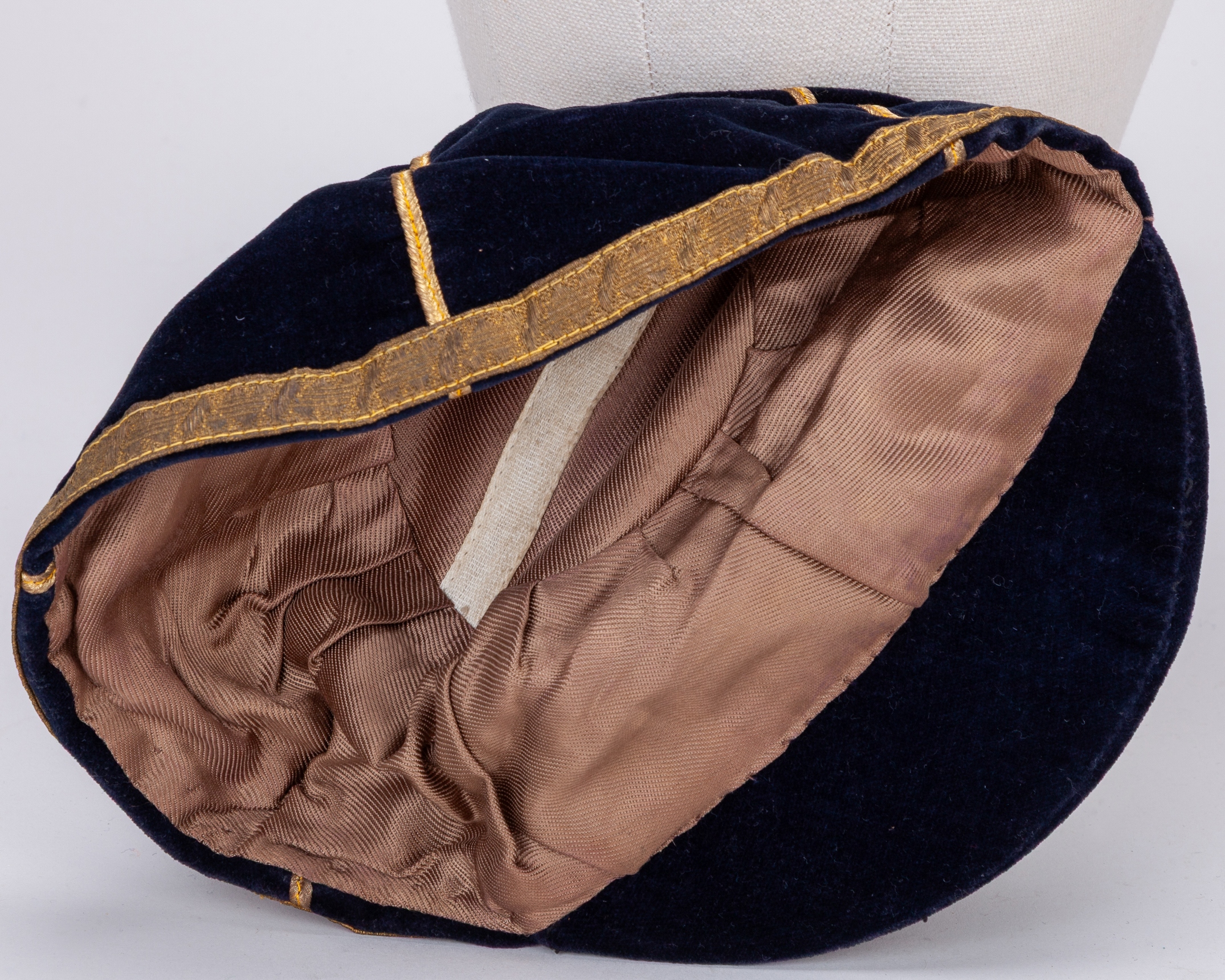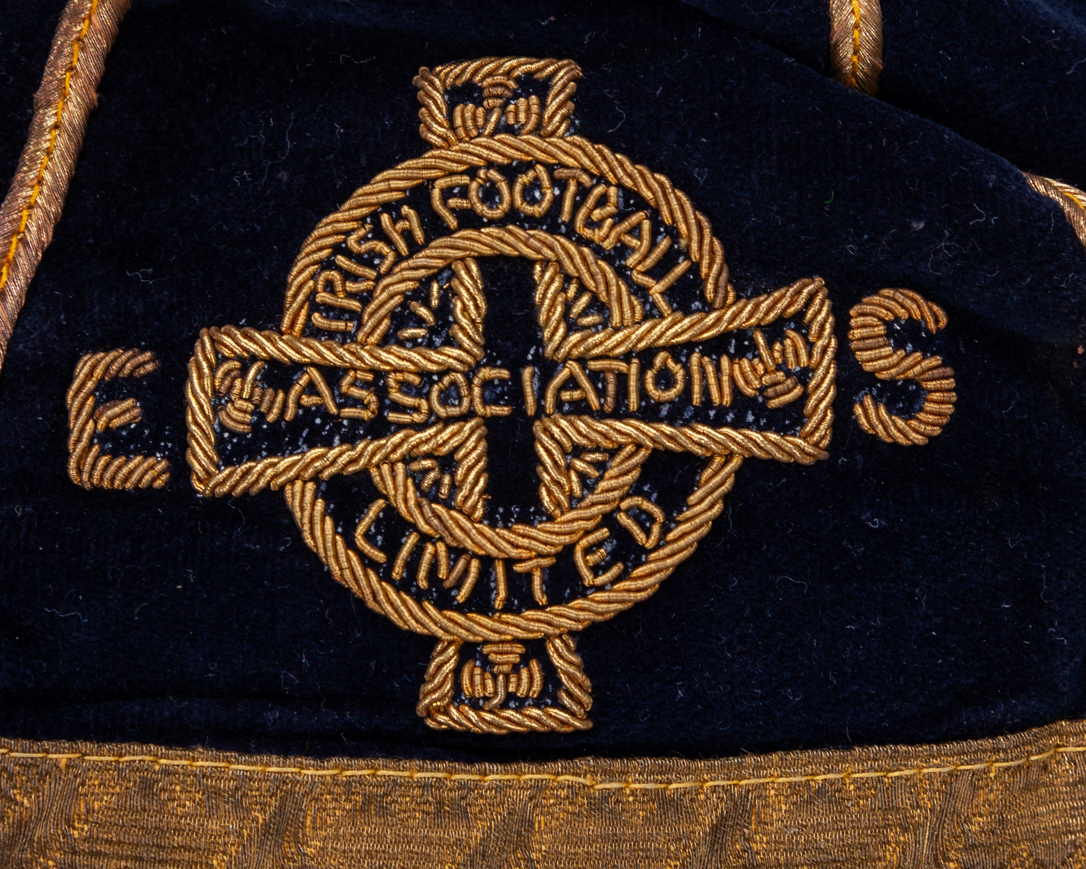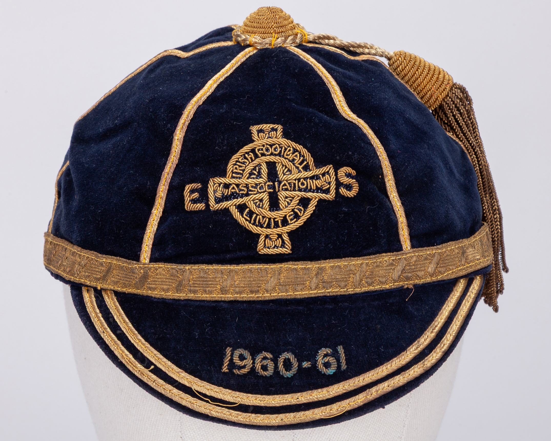 Harry Gregg blue Northern Ireland v. England and Scotland International cap, 1960-61, blue velvet cap with gilt tassel and braiding with embroidered crest and inscribed E, S, 1960-61
