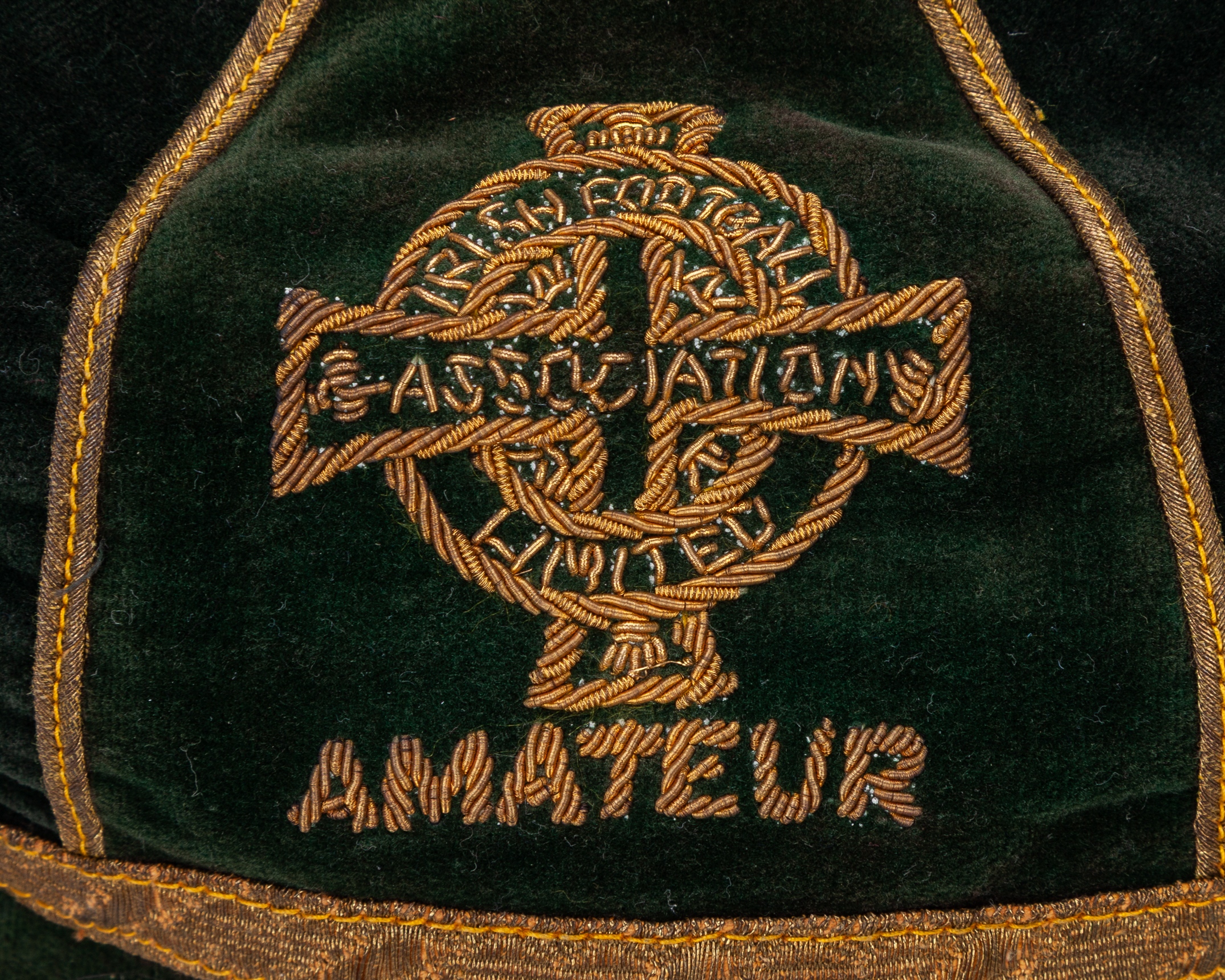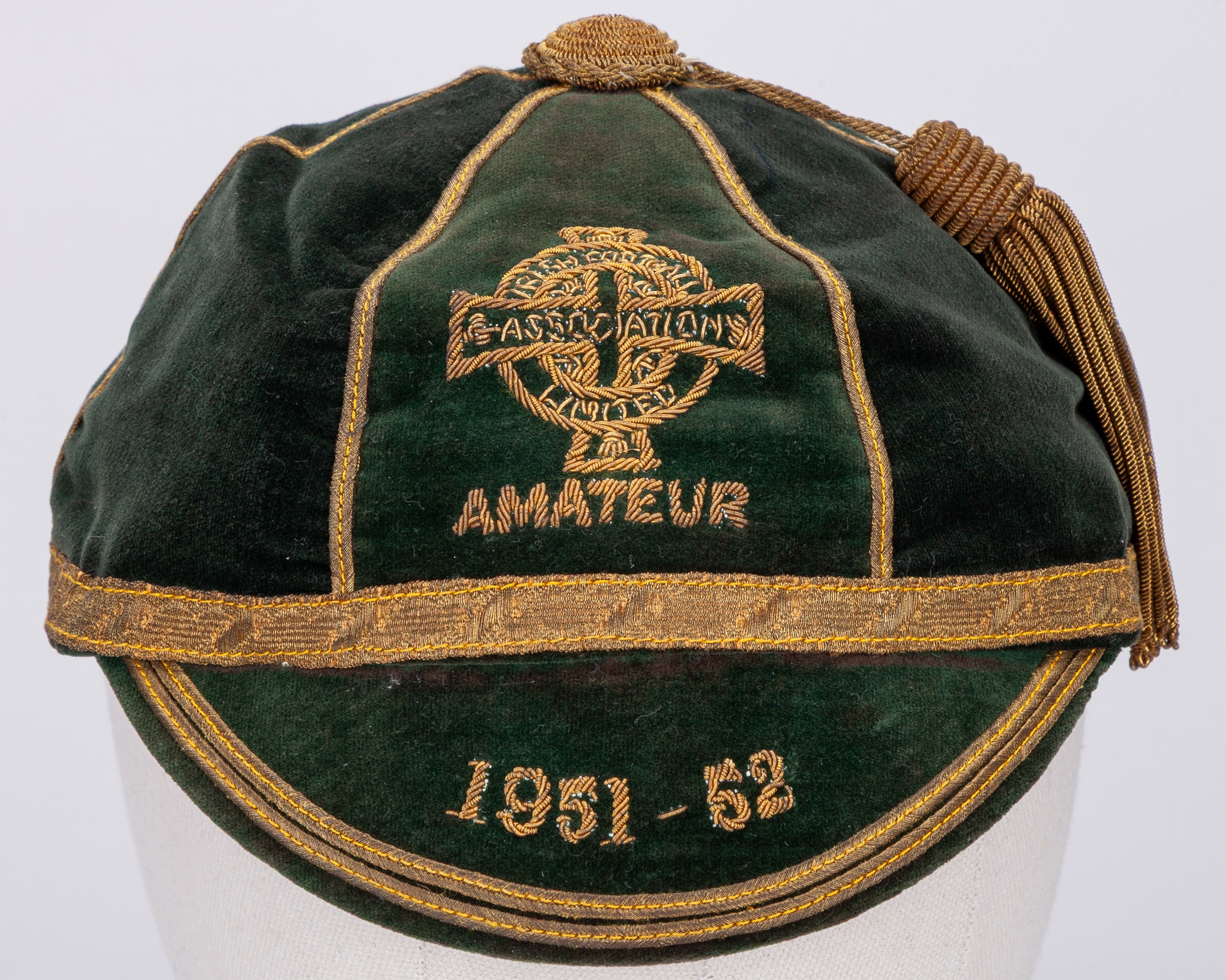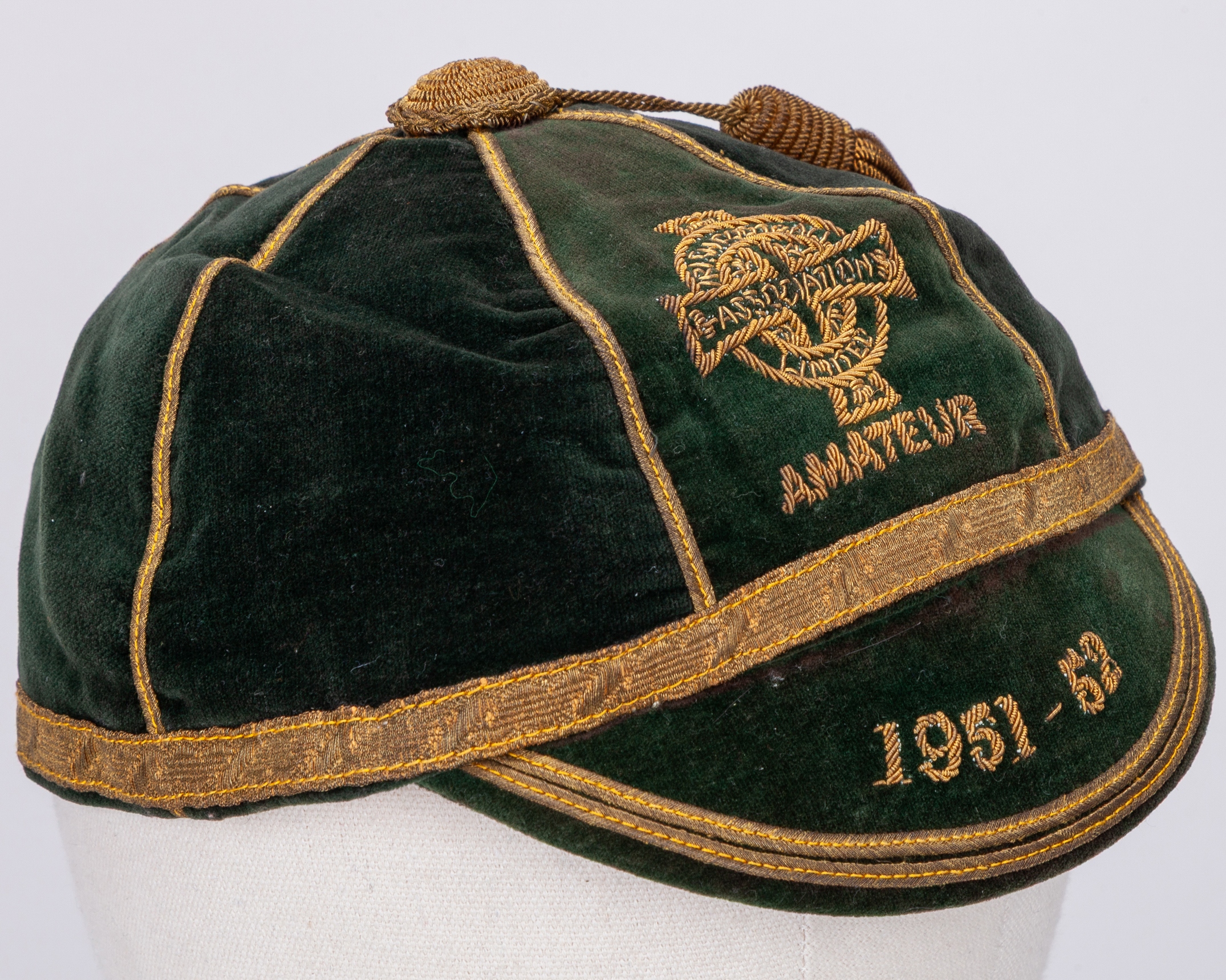 Harry Gregg green blue Northern Ireland Amateur International cap, 1951-52, green velvet cap with gilt tassel and braiding with with embroidered crest and inscribed AMATEUR 1951-52