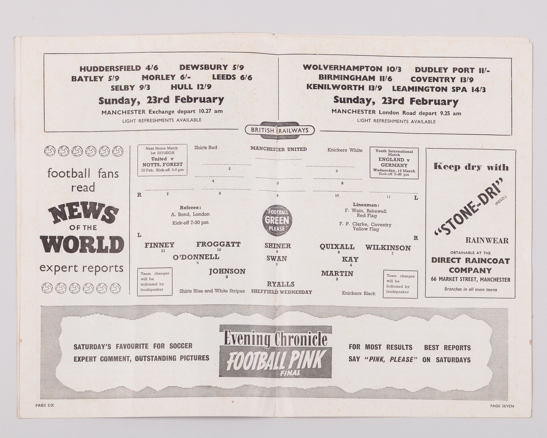 Harry Gregg a Manchester United v. Sheffield Wednesday match programme. 19/2/58