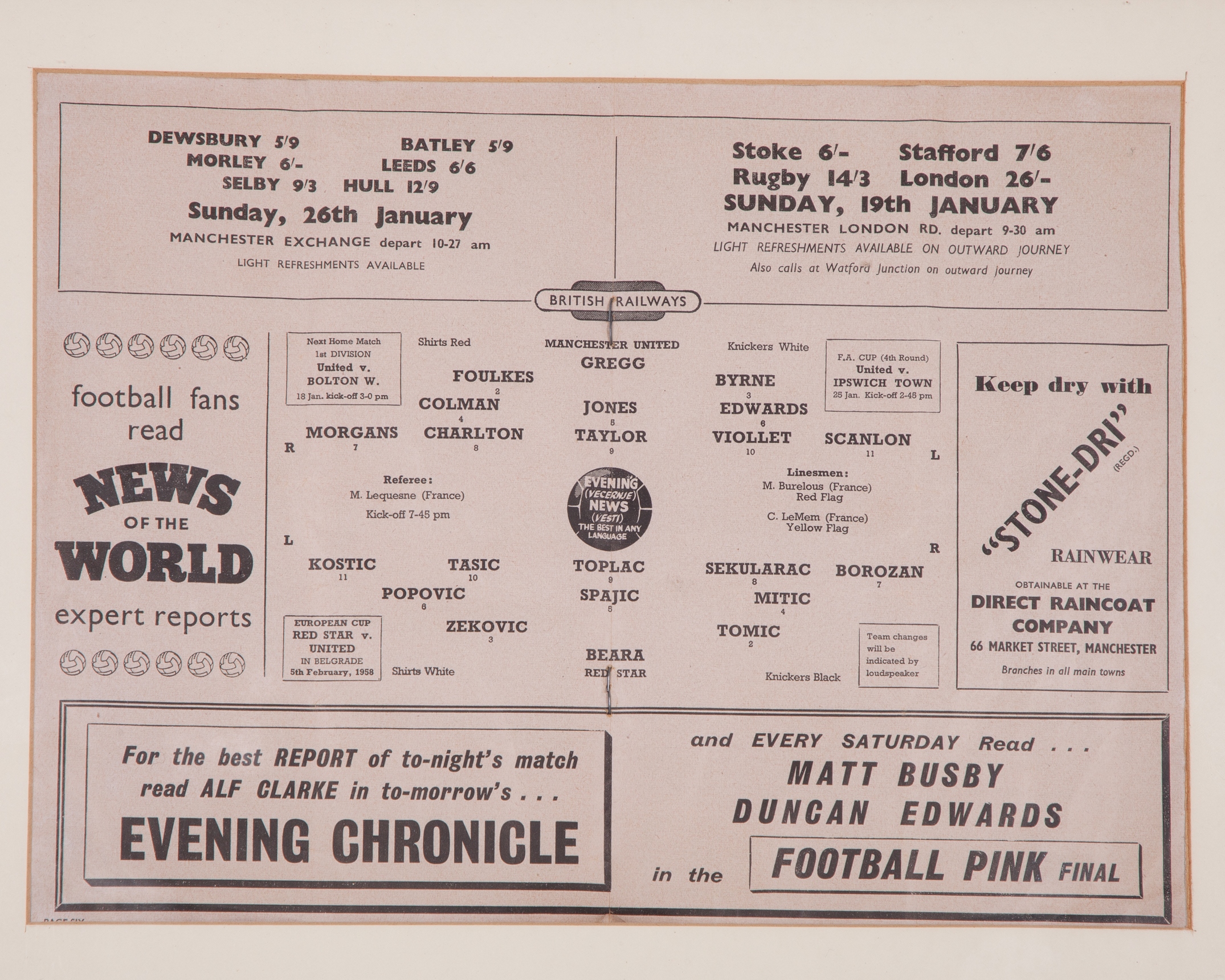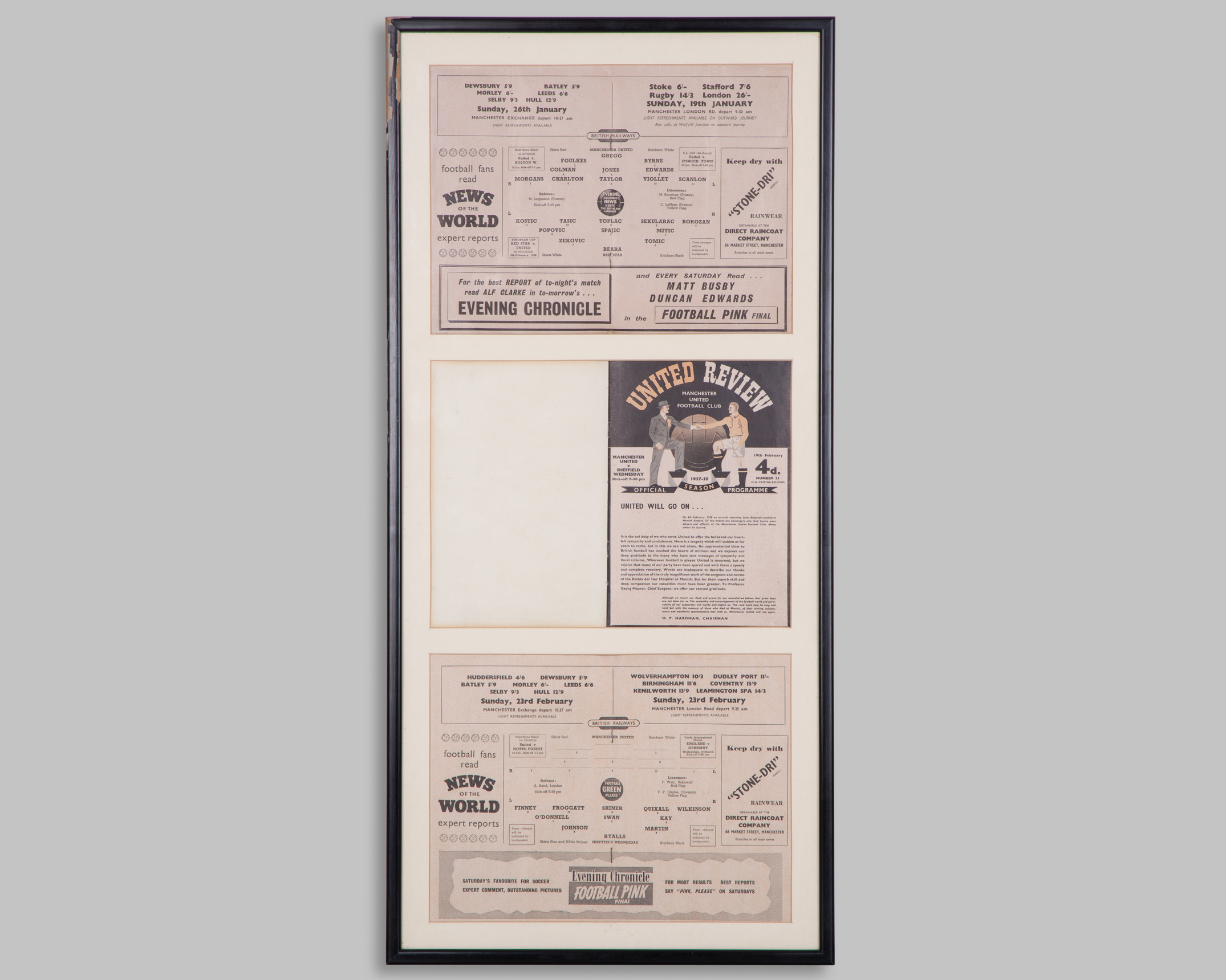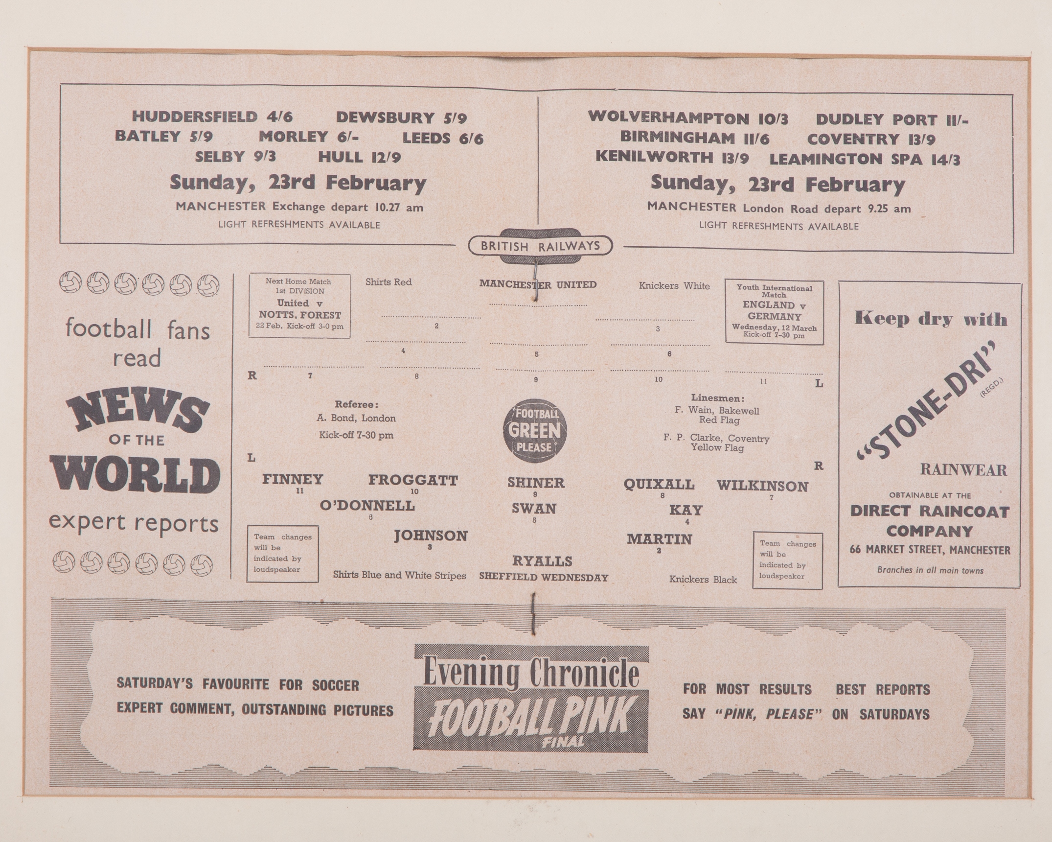 Harry Gregg a Manchester United v. Sheffield Wednesday match programme. 19/2/58, first match after Munich Air Disaster, with token, fold and wear to cover with framed display of reproduction Manchester United v. Red Star Belgrade, 14/1/58 and reproduction Manchester United v. Sheffield Wednesday programme 19/2/58, 77 x 37cm