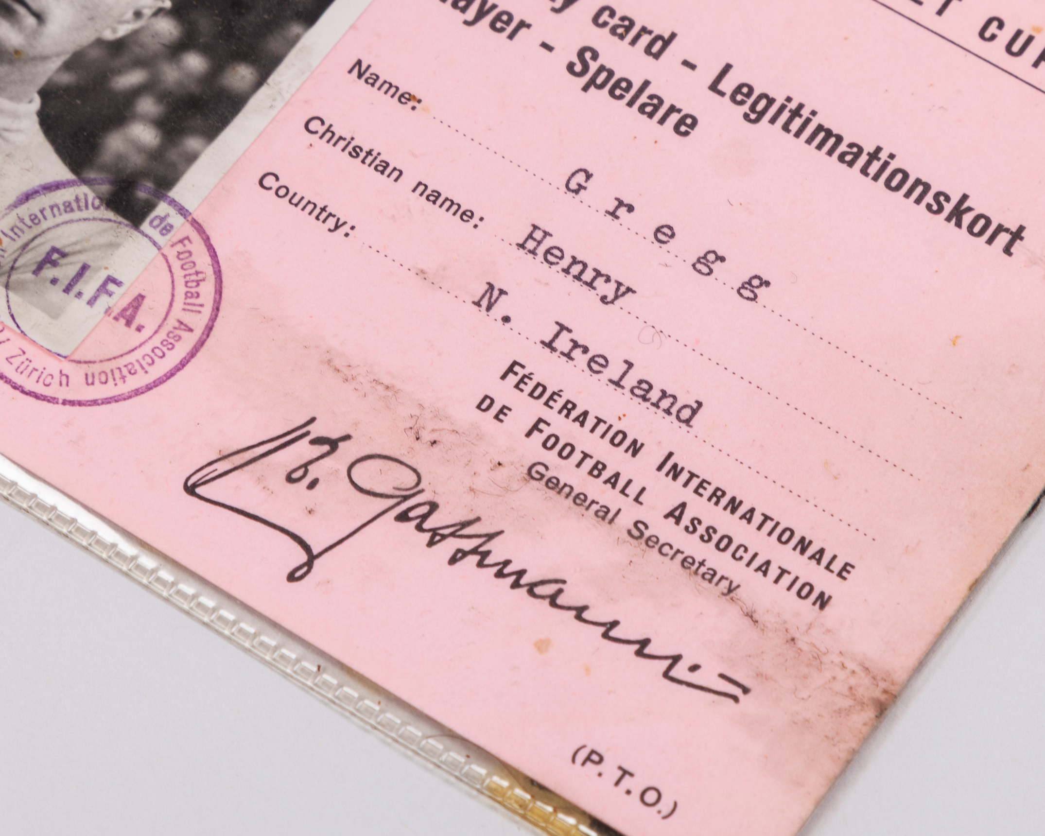 Harry Gregg an official 1958 Sweden World Cup Identity Card