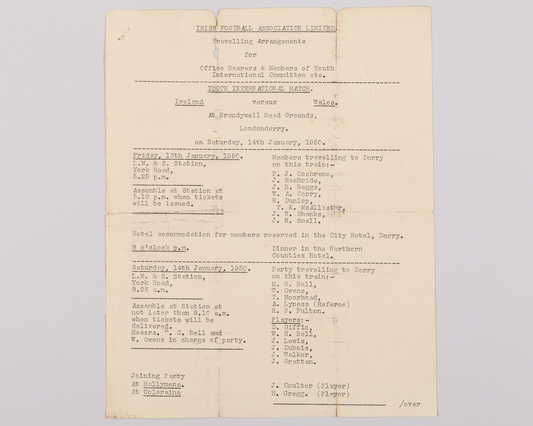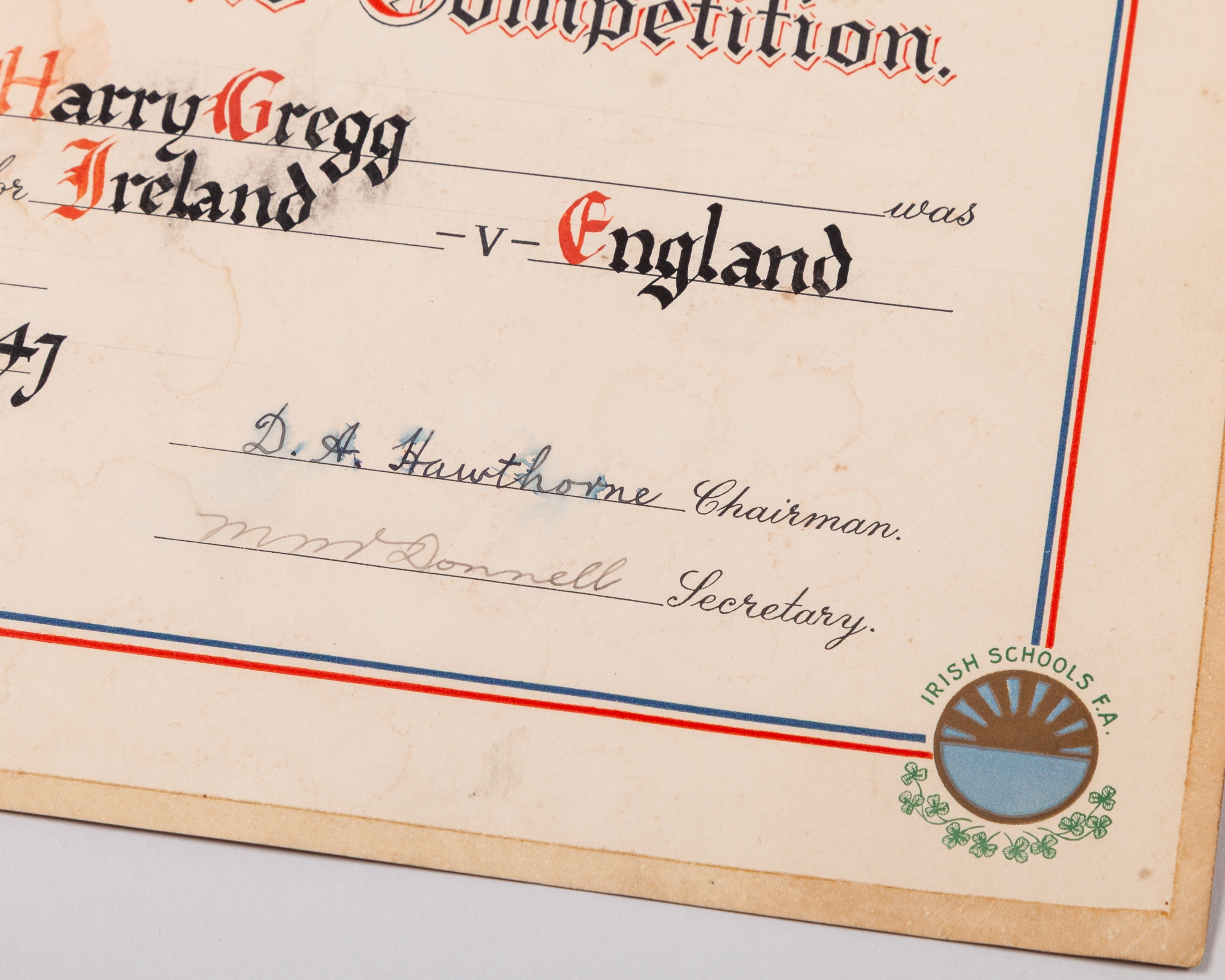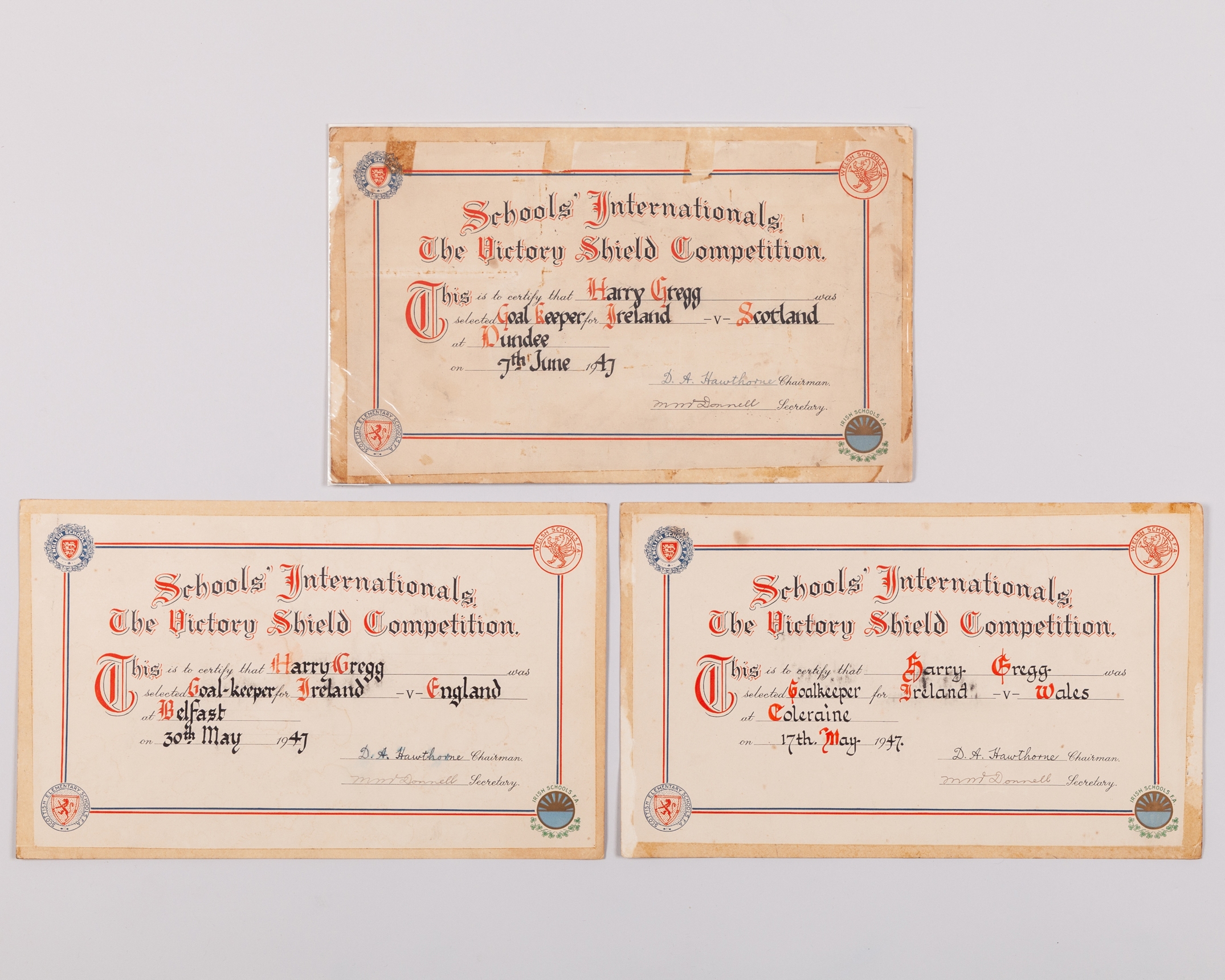 Harry Gregg three Schools' International Victory Shield selection cards, 1947, comprising Wales, 17th May 1947, England, 30th May 1947 and Scotland, 7th June 1947 and an Ireland v. Wales itinerary single sheet 14th January 1950