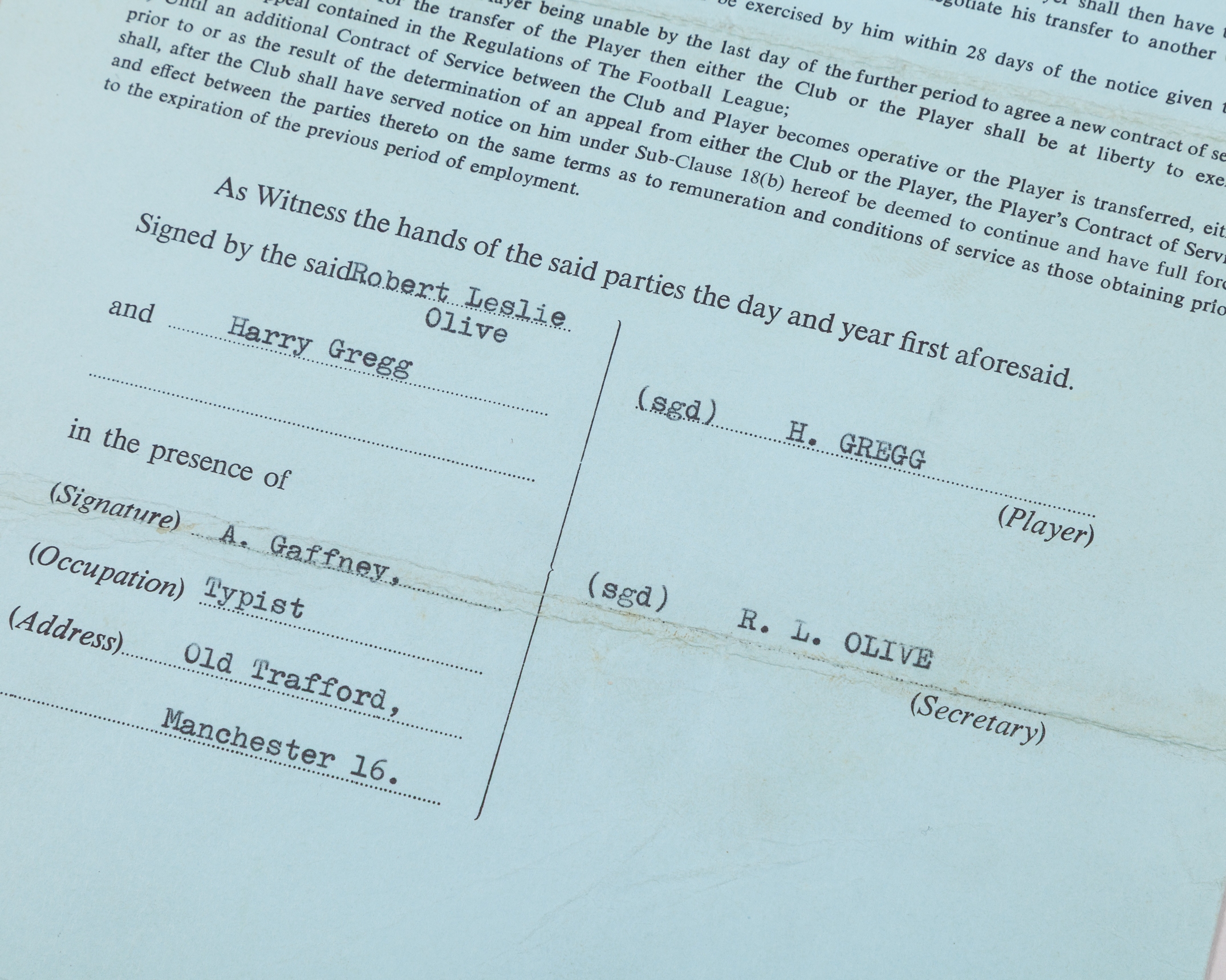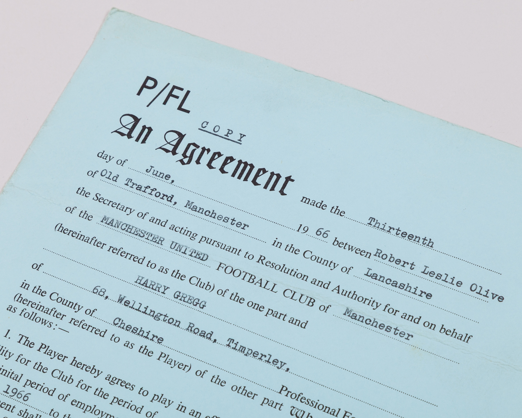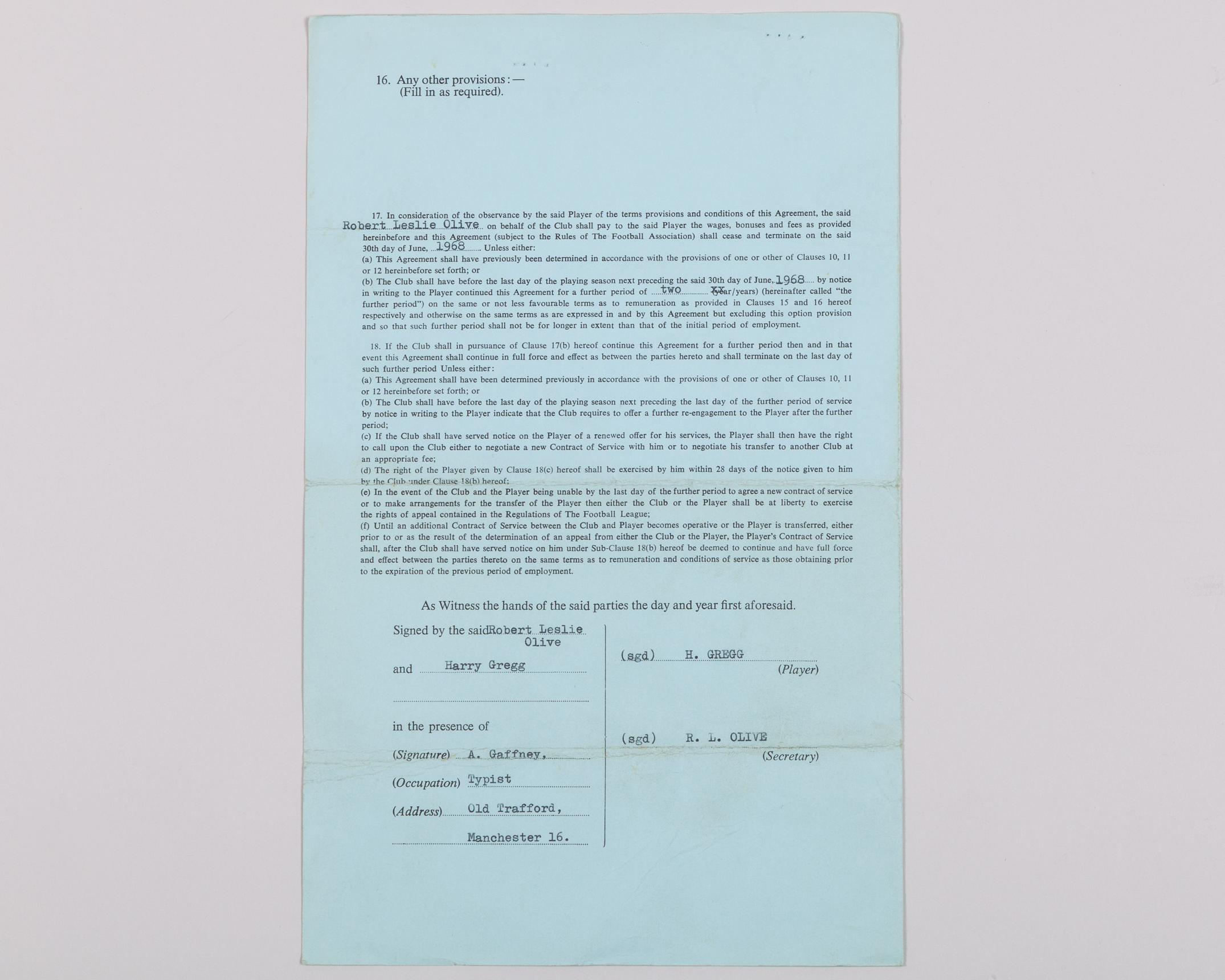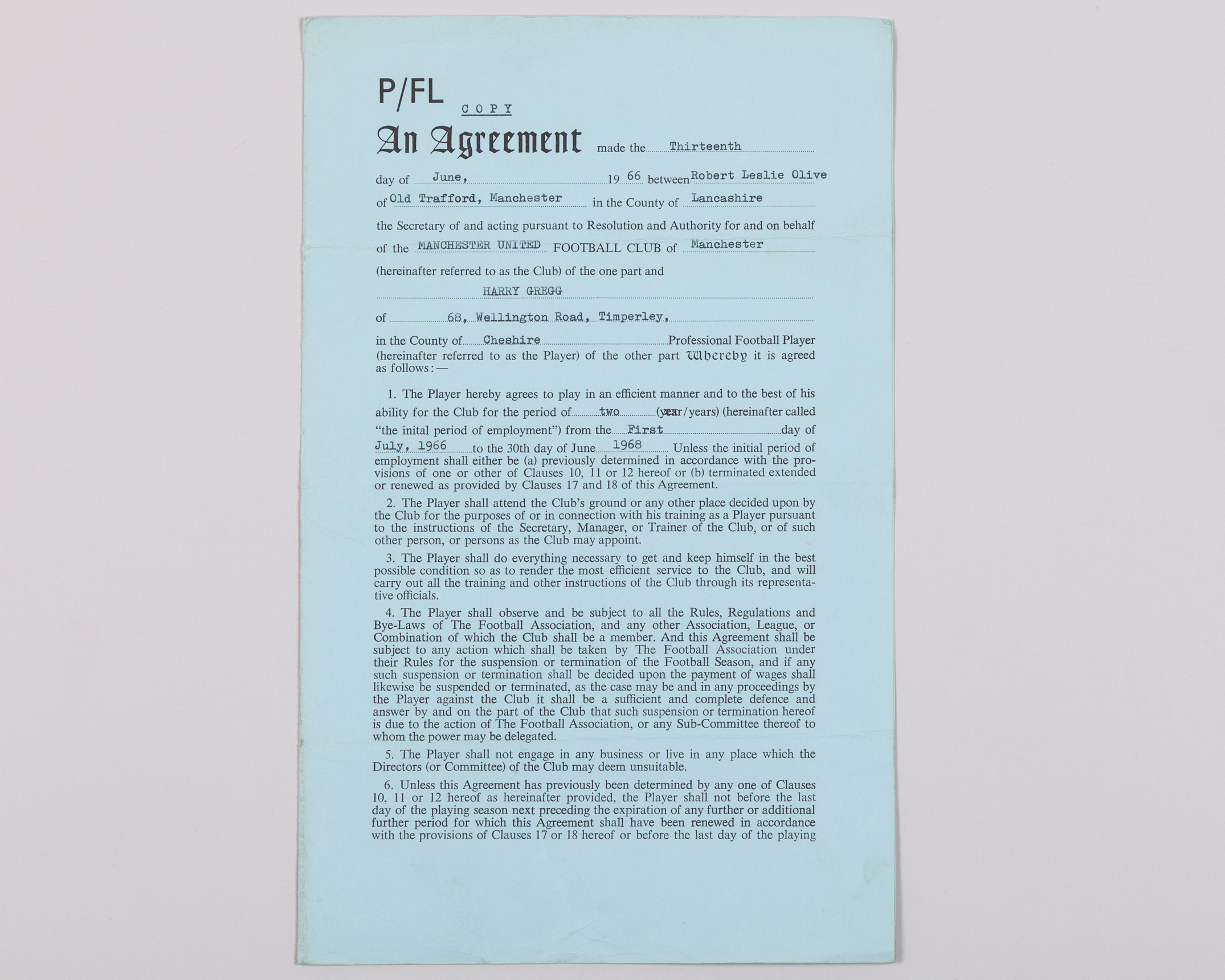 Harry Gregg a Manchester United players contract, from 13th June 1966