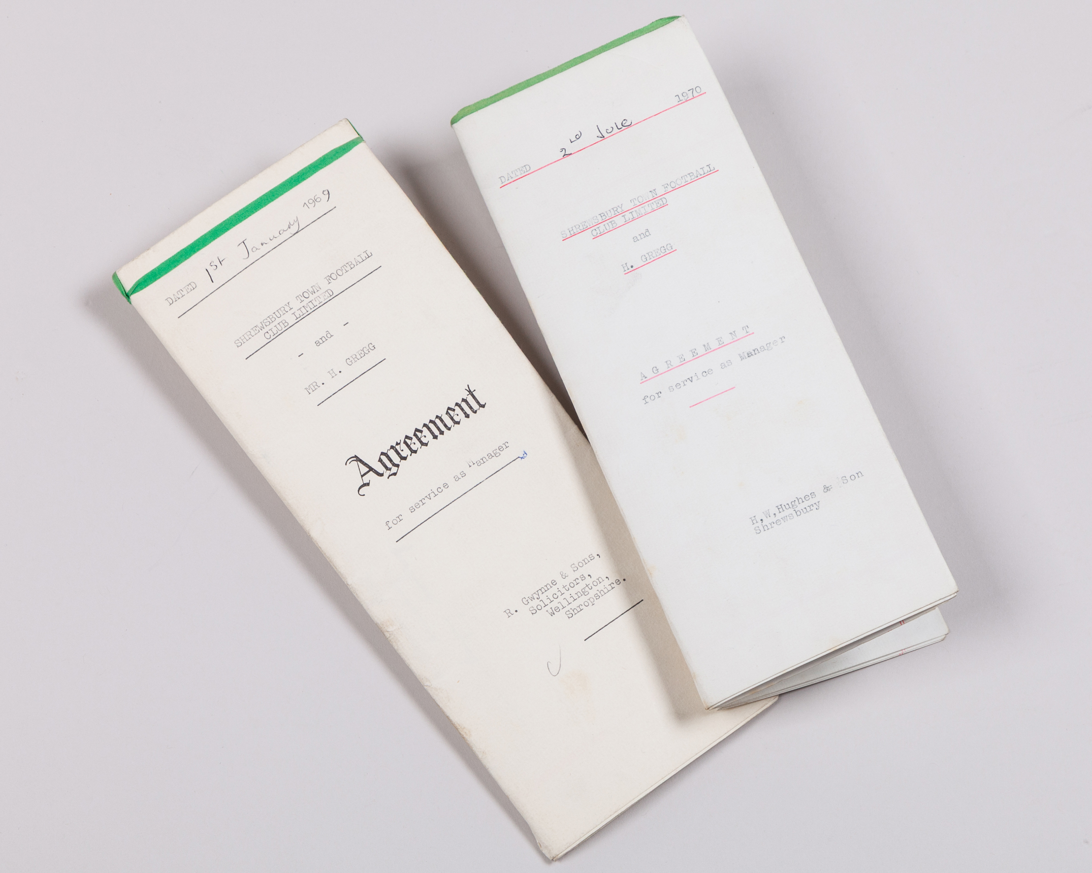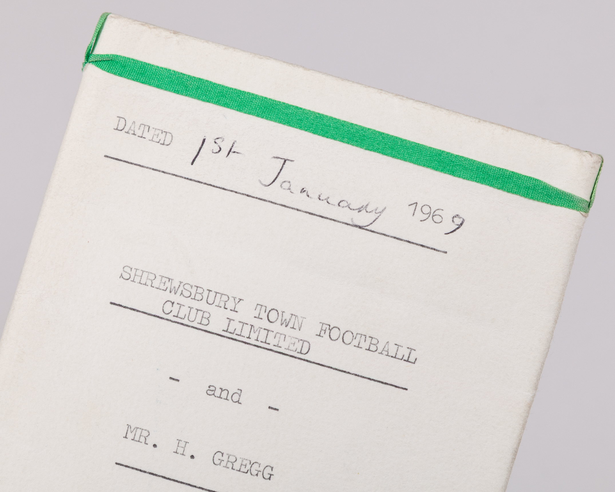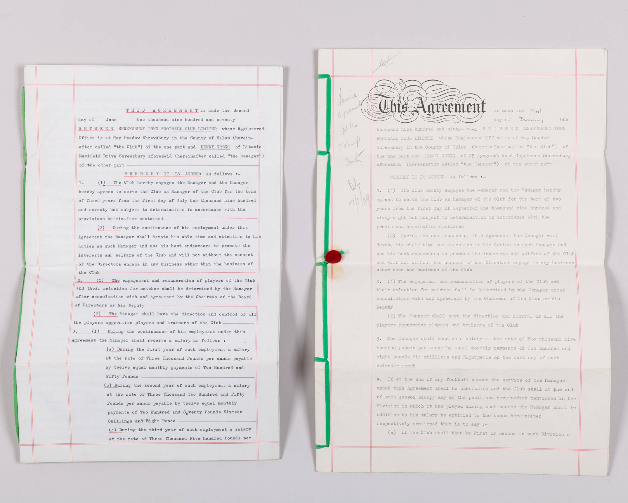 Harry Gregg two Shrewsbury Town manager's contracts, 1969-70, comprising 1st Jan 1969 and 2nd June 1970 (2)