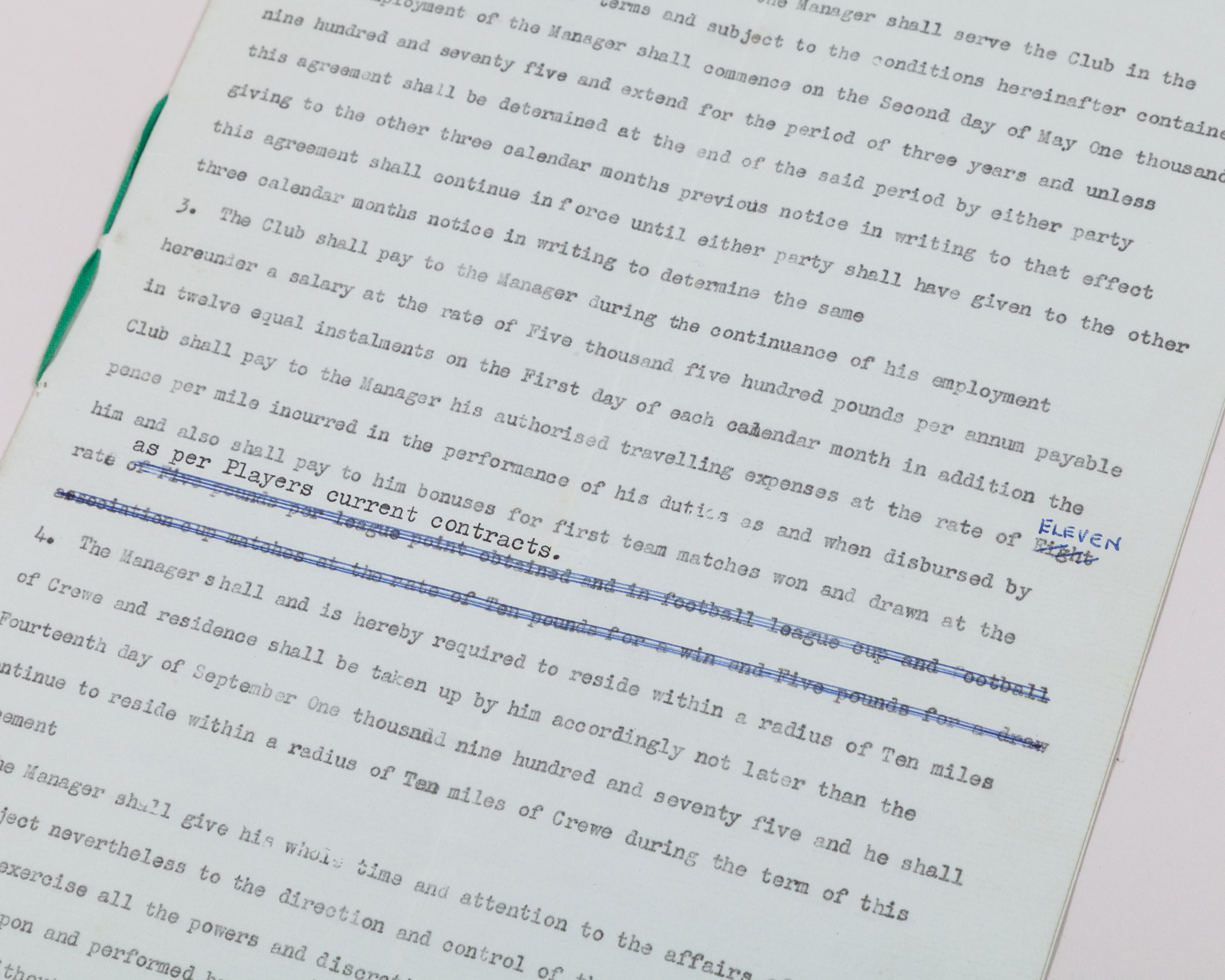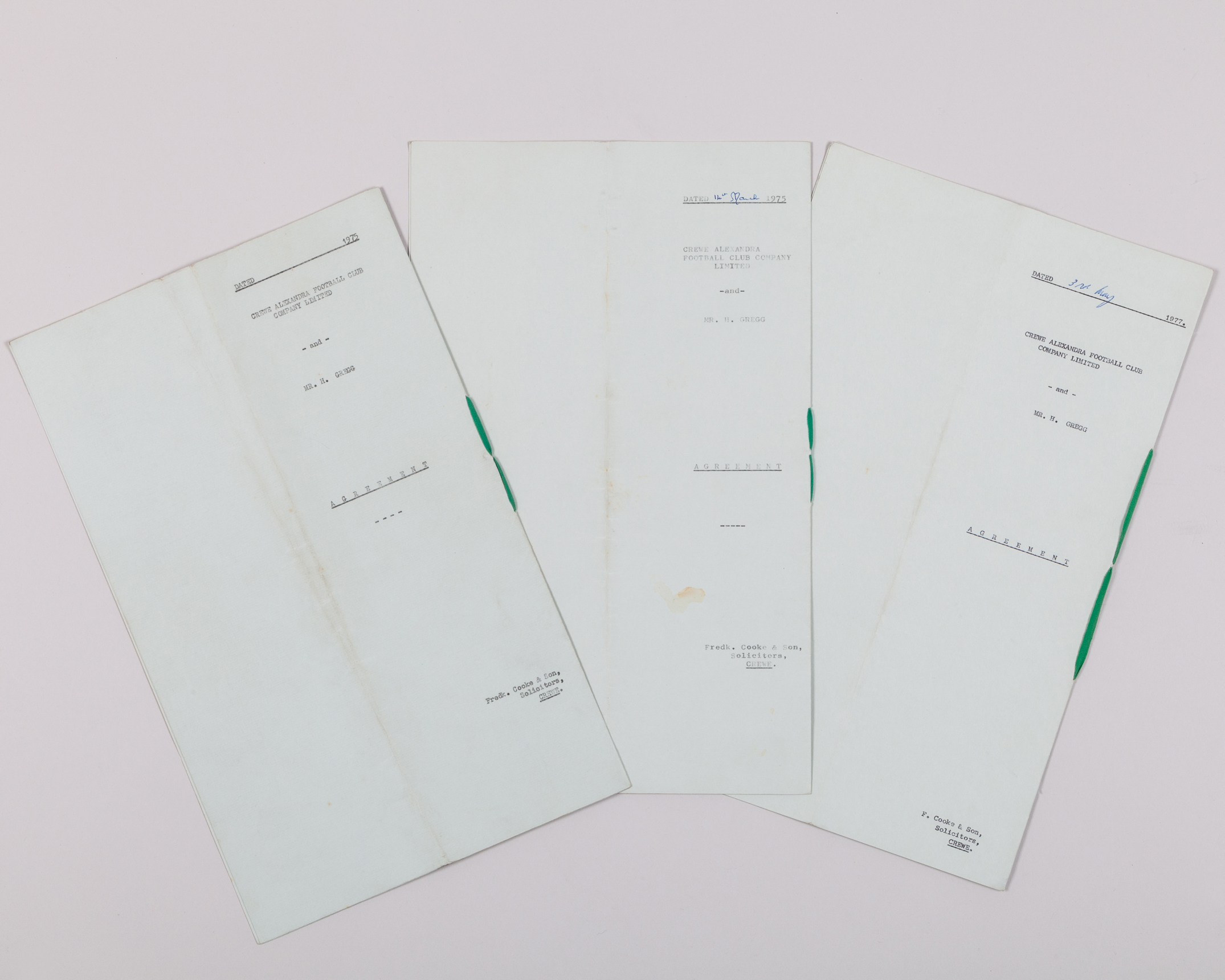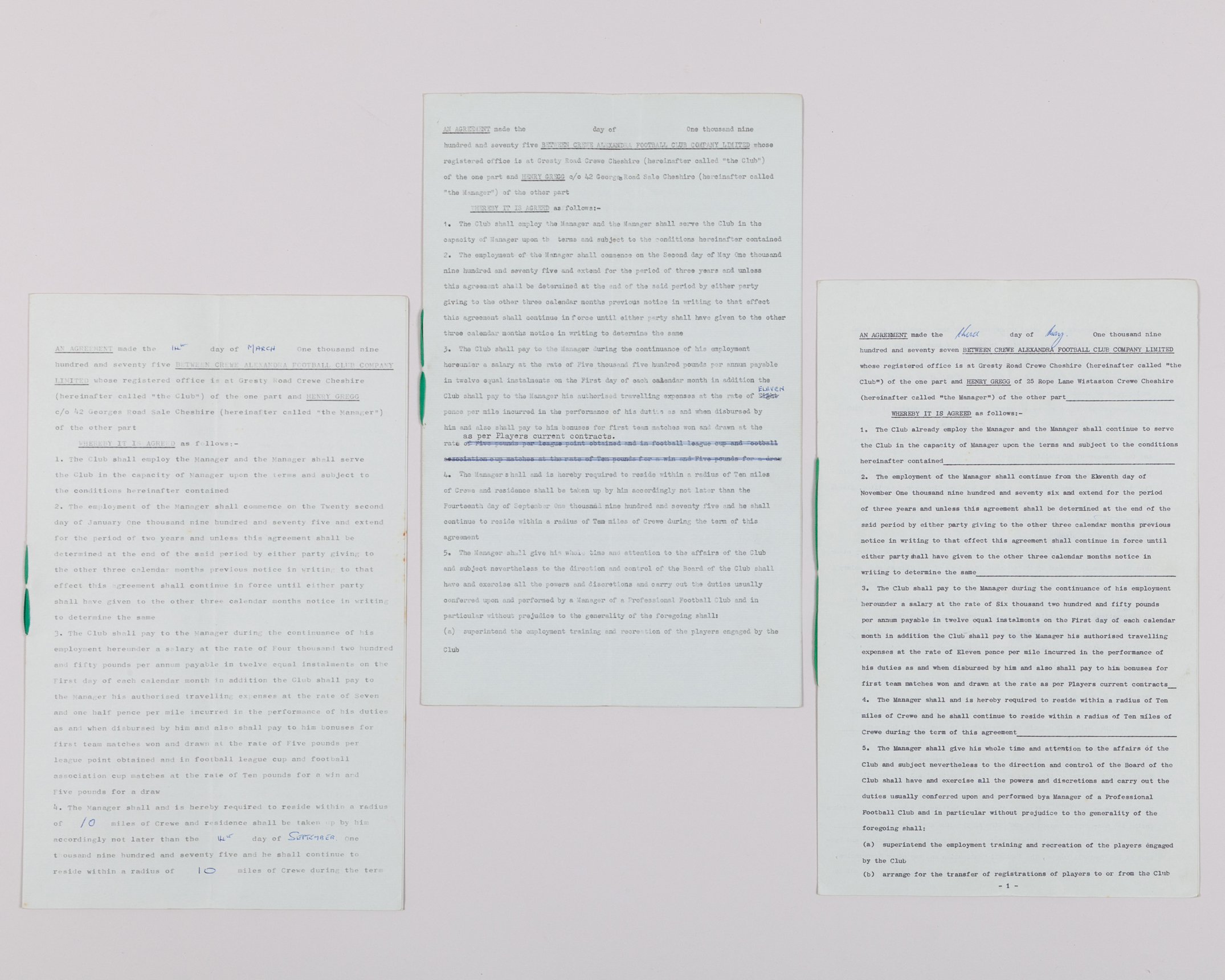 Harry Gregg three Crewe Alexandra F.C. managers contracts, comprising 14th March 1975, another dated 1975 and 3rd May 1977 (3)