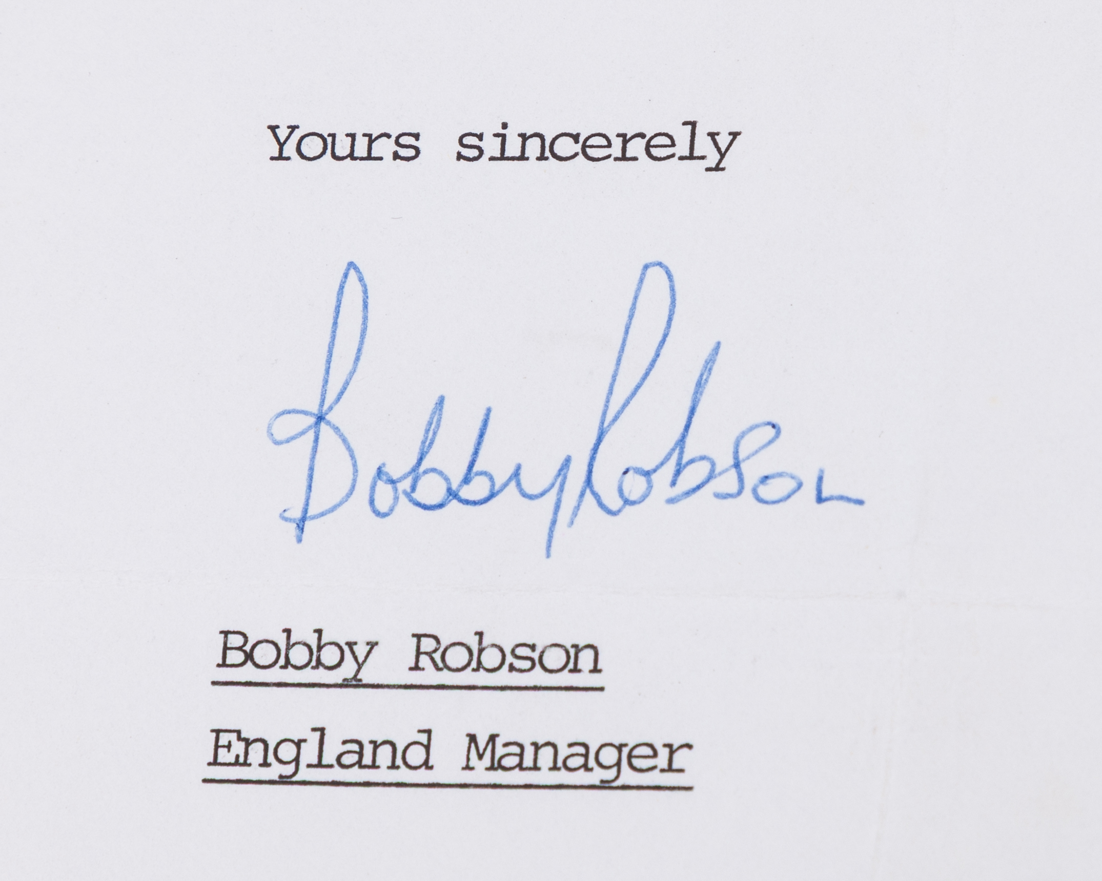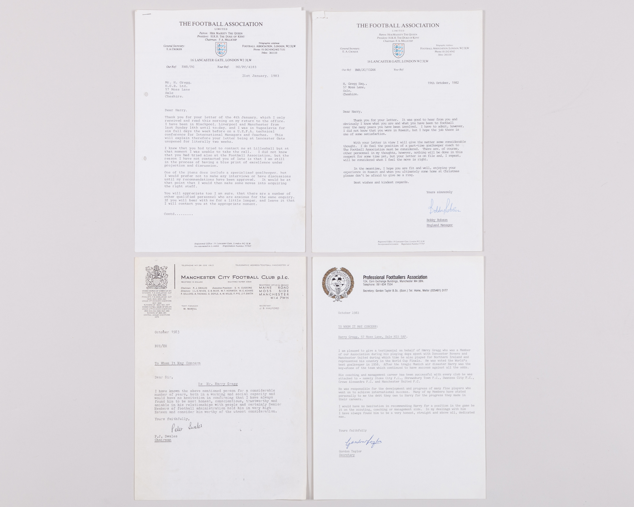 Harry Gregg three testimonials letters, one from Matt Busby, another Peter Swales Manchester City and Gordon Taylor PFA, all on headed paper and two letters from Bobby Robson regarding part time goalkeeper coach with England (5)