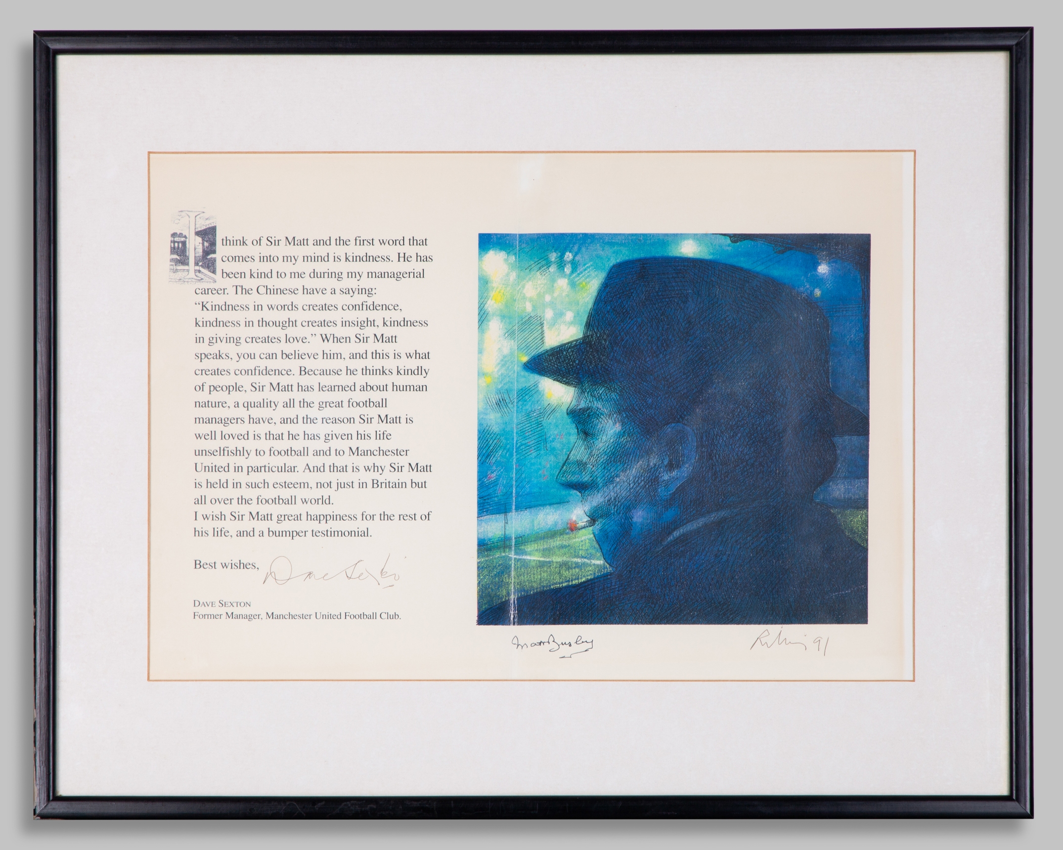 Harold Riley colour print of Matt Busby with quote from Dave Sexton, former Manchester United manager, framed and glazed, 42 x 53cm