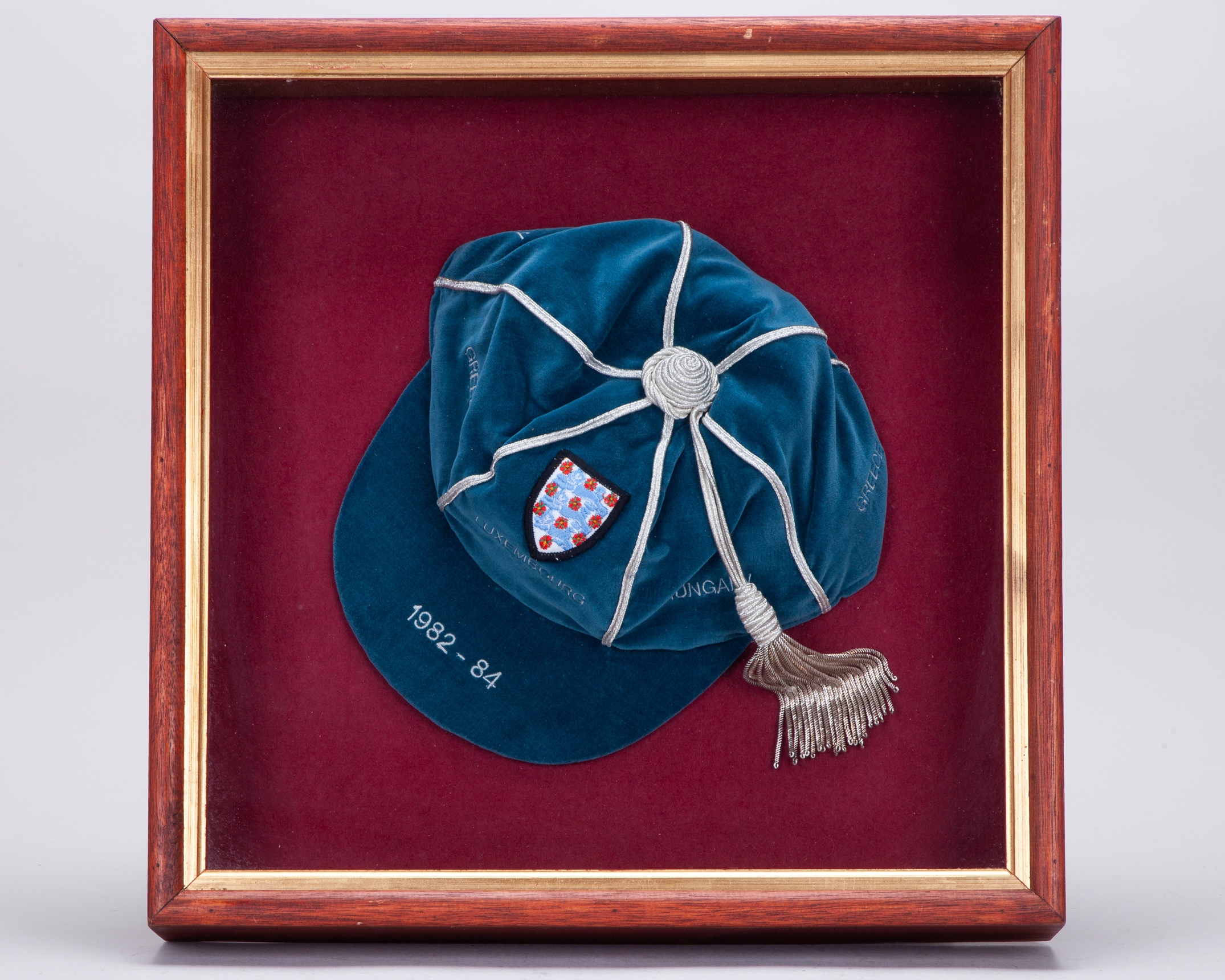 Sammy Lee blue England v. Greece, Luxembourg, Greece, Hungary, Denmark, Hungary and Luxembourg International cap, 1982-84, blue velvet cap with silver tassel and braiding inscribed GREECE, LUXEMBOURG, GREECE, HUNGARY, DENMARK, HUNGARY, LUXEMBOURG, mounted on backboard, framed