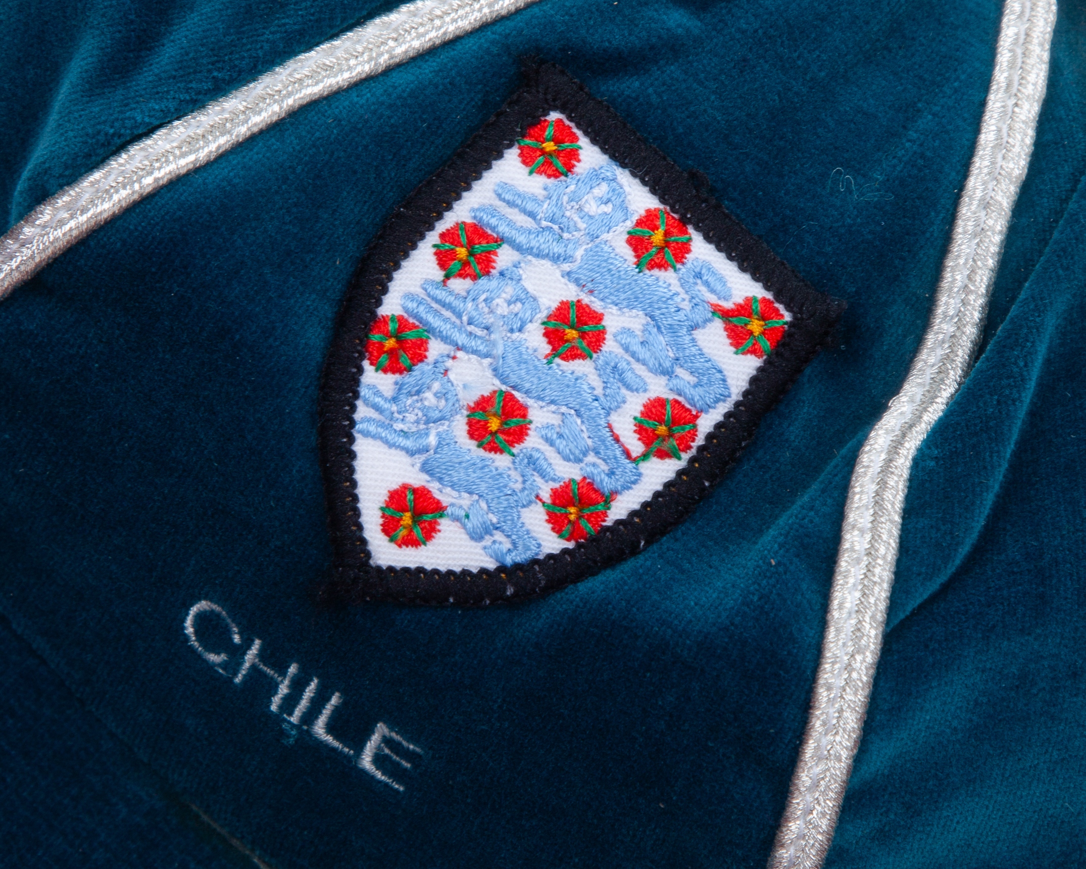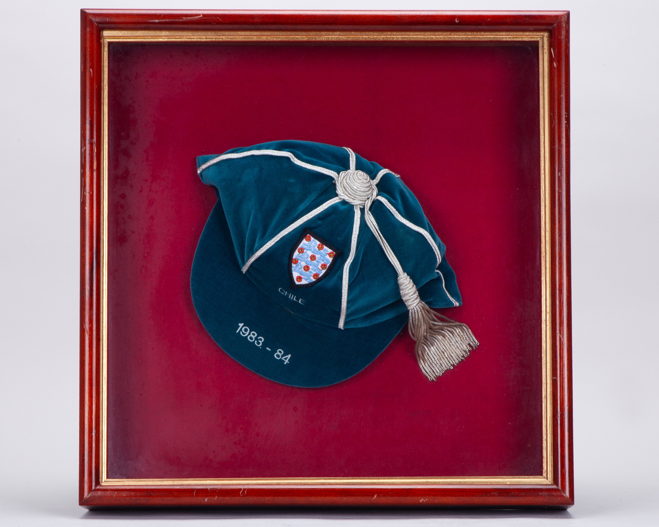 Sammy Lee blue England v. Chile International cap, 1983-84, blue velvet cap with silver tassel and braiding inscribed CHILE, 1983-84, mounted on backboard, framed