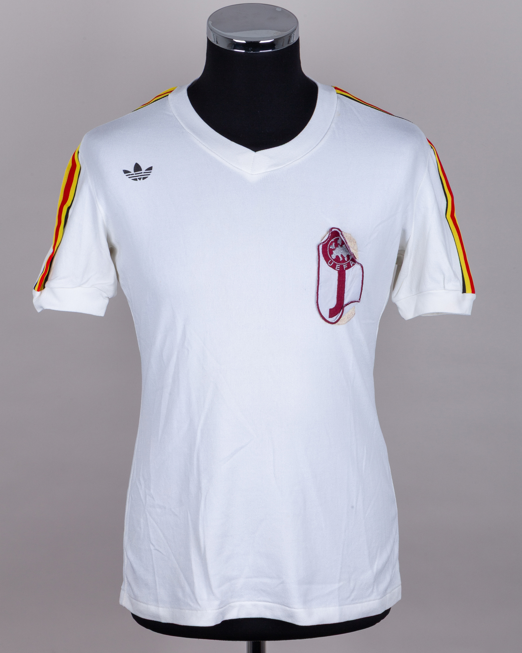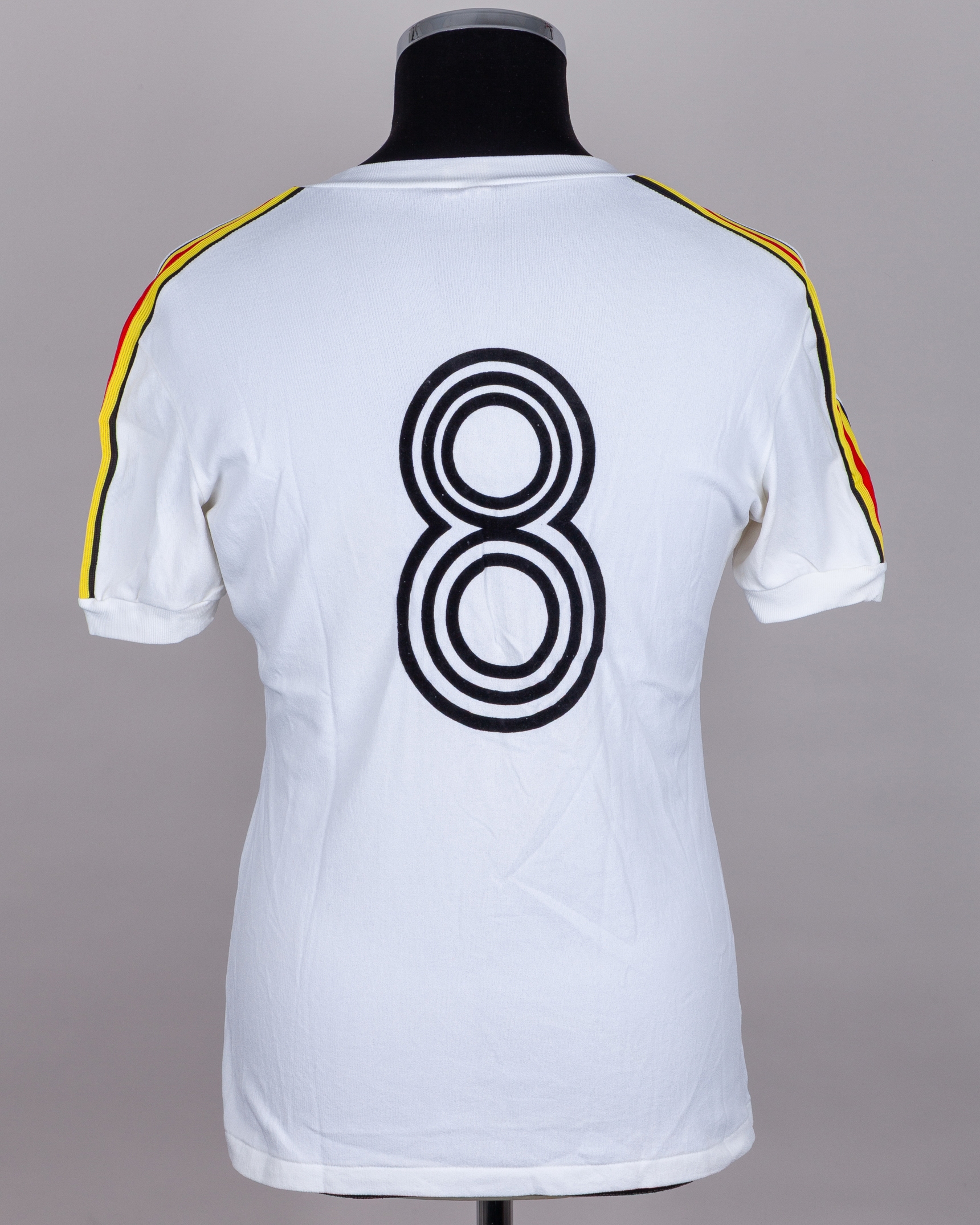 A white No.8 Belgium Youth short-sleeved shirt, Adidas, with v-neck collar and embroidered UEFA youth badge