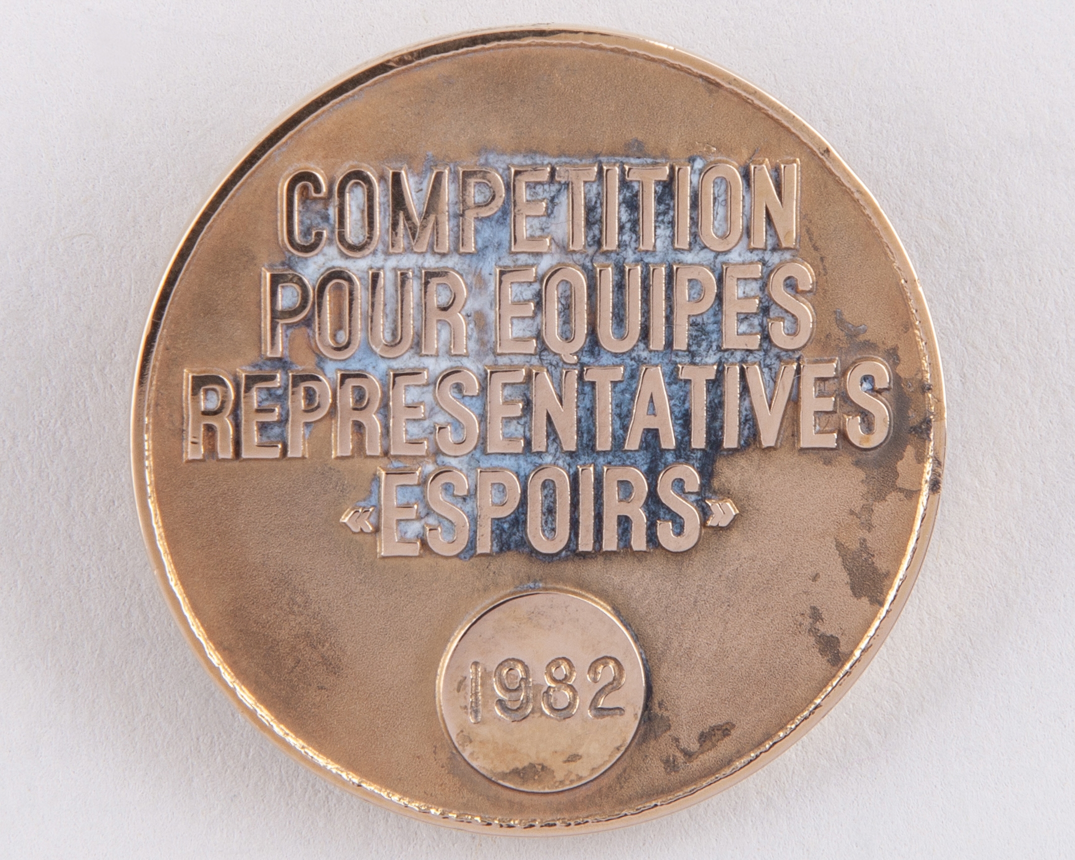 Sammy Lee yellow-metal UEFA Under 21 European Championship winners medal, 1982, the obverse inscribed 21 UEFA, the reverse inscribed COMPETITION POUR EQUIPES REPRESENTATIVES ESPOIRS, 1982, with residue of blu tack from being removed from a frame