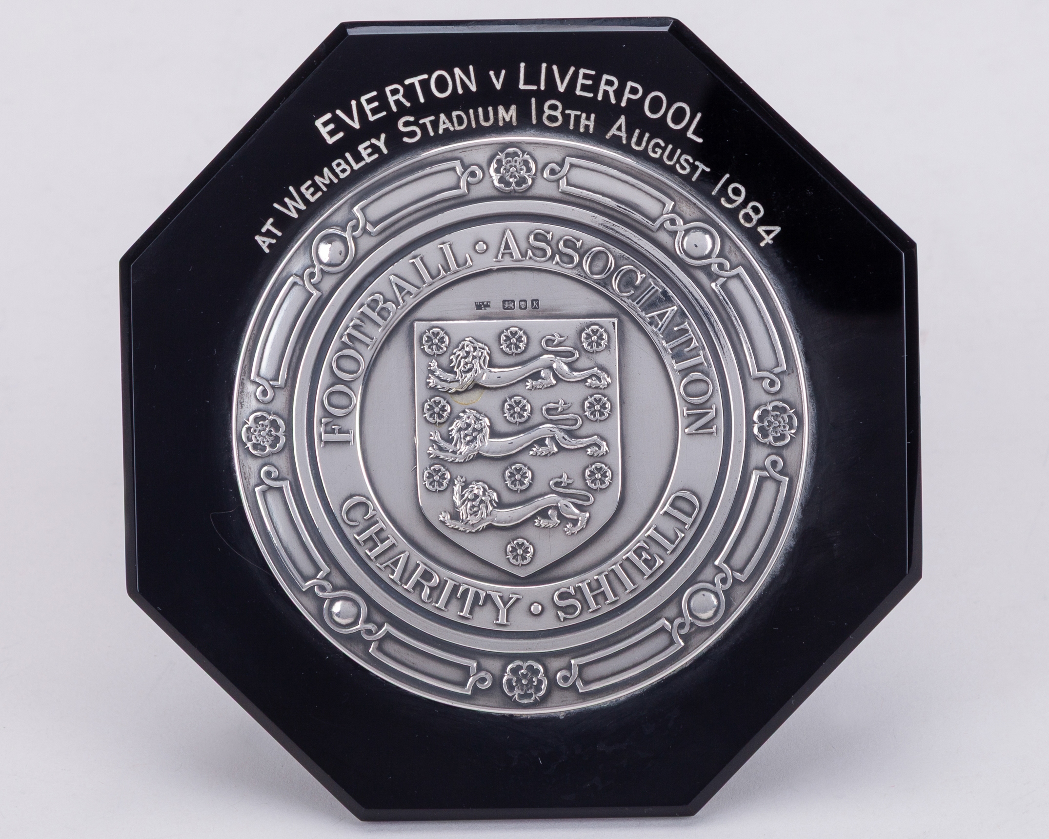 Sammy Lee a silver-mounted and bakelite Liverpool v. Everton Charity Shield plaque, 1984, inscribed FOOTBALL ASSOCIATION CHARITY SHIELD, EVERTON V LIVERPOOL AT WEMBLEY STADIUM 18th August 1984, with easel stand