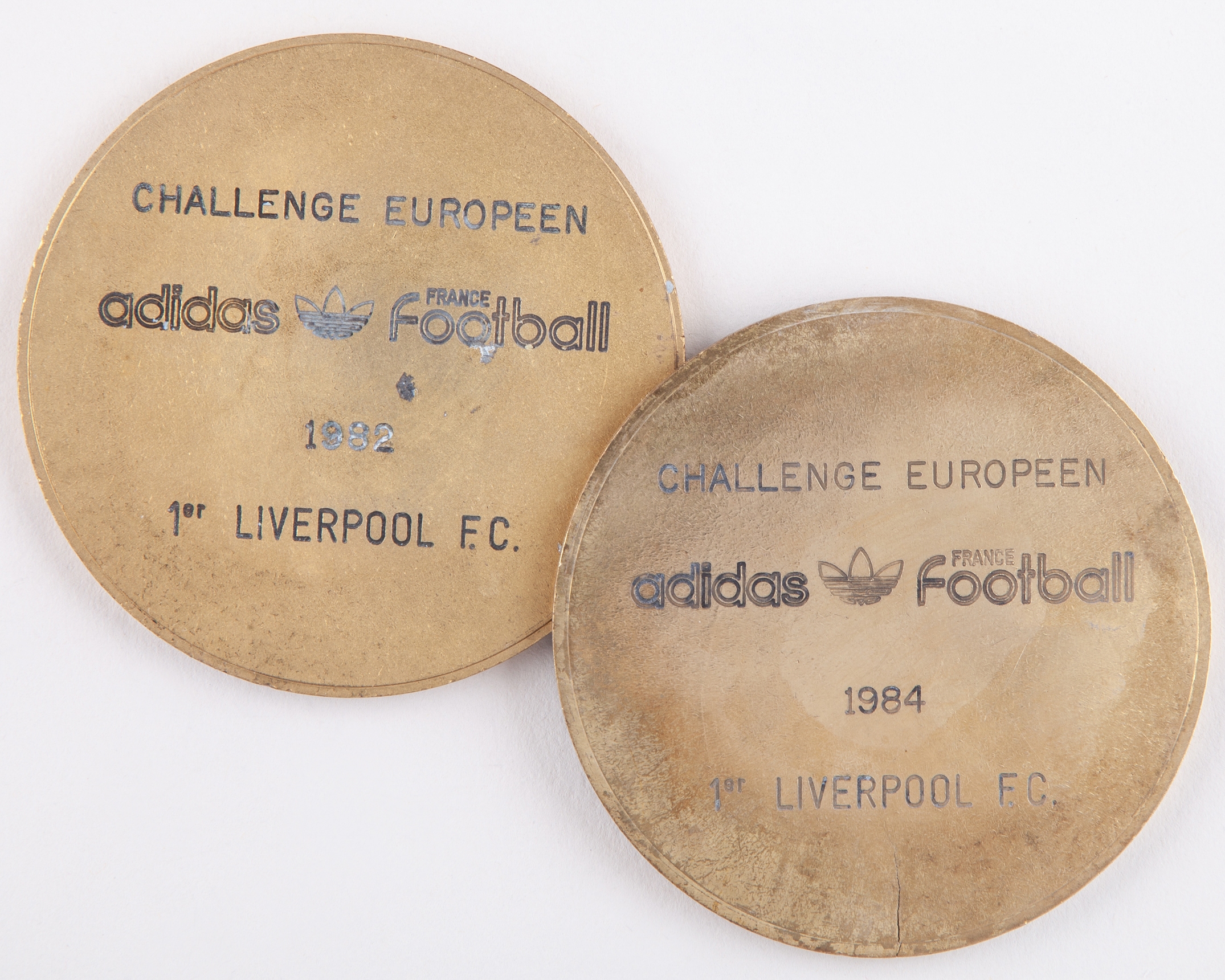 Sammy Lee two gilt-metal Challenge Europeen football medals, 1982 and 1984, the reverse inscribed CHALLENGE EUROPEEN adidas FRANCE football 1982 1er LIVERPOOL F.C., the other CHALLENGE EUROPEEN adidas FRANCE football 1984 1er LIVERPOOL F.C, each with residue of blu tack from framing (2)