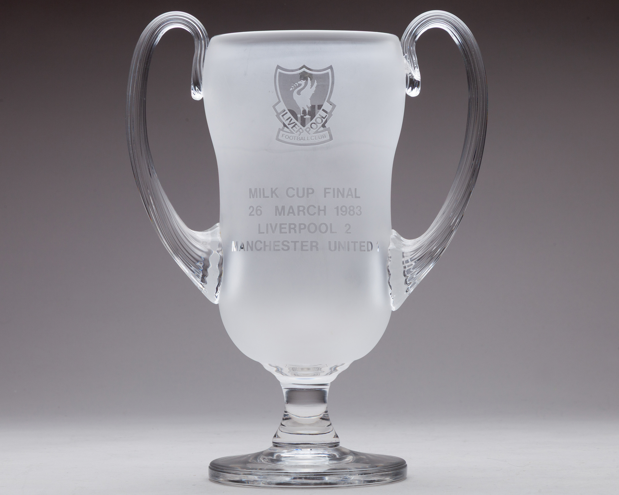 Sammy Lee The Milk Cup presentation glass trophy, 1983, by Royal Doulton, inscribed The Milk Cup, with Liverpool crest, MILK CUP FINAL, 26 MARCH 1983 LIVERPOOL 2 MANCHESTER UNITED 1, the foot inscribed SAMMY LEE, 26cm high