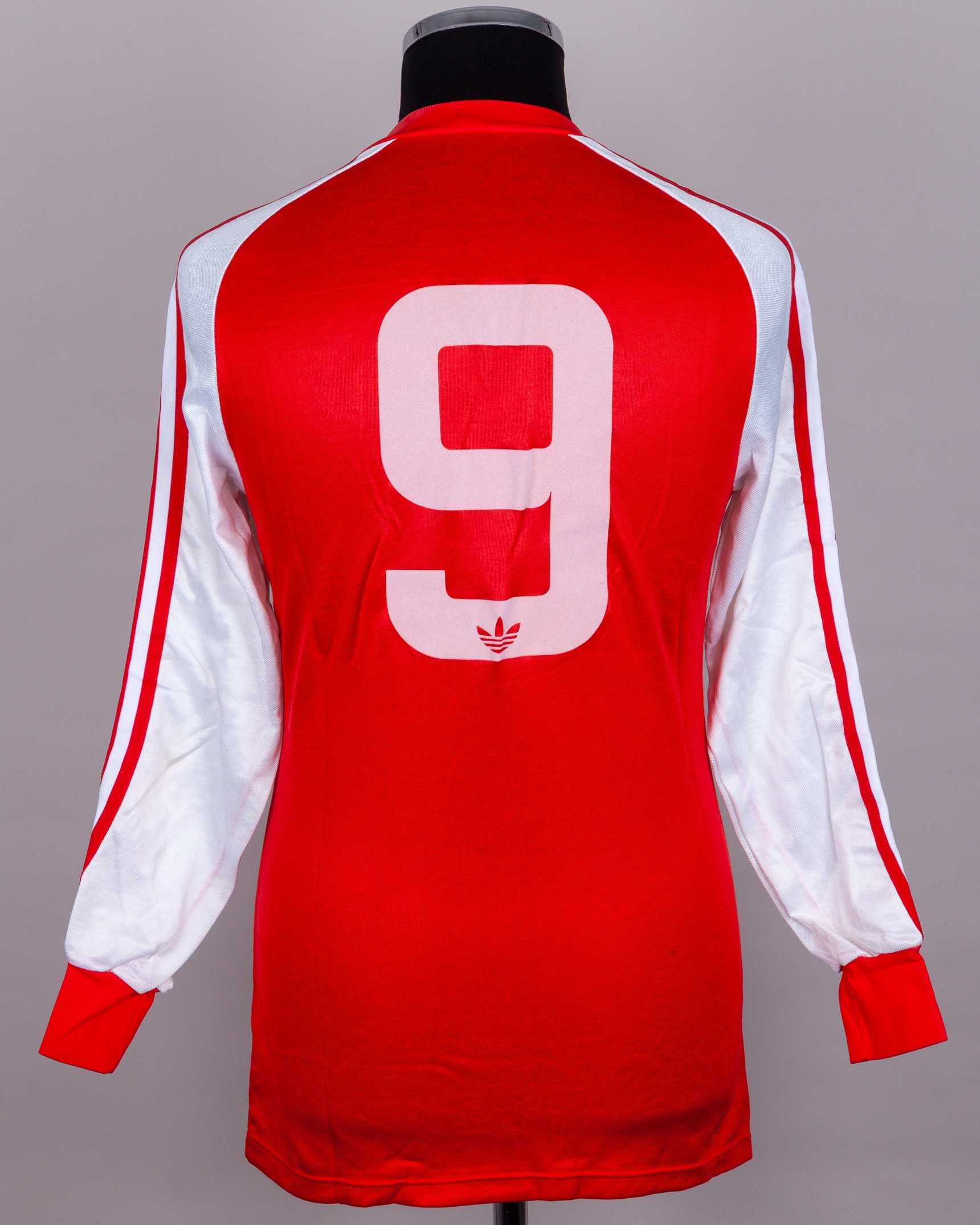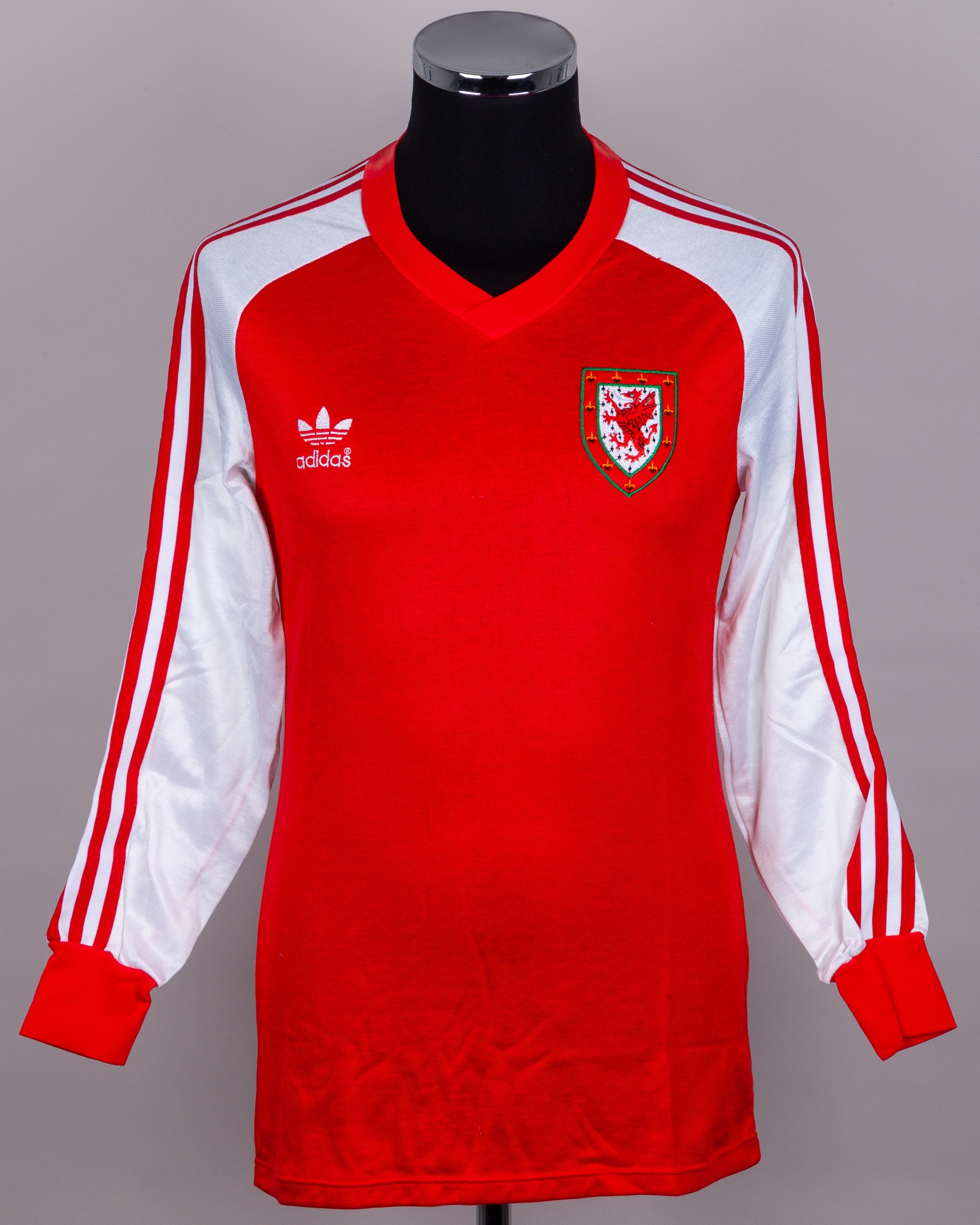 Ian Rush red and white No.9 Wales v. England long-sleeved shirt, 1983, Adidas, with v-neck collar and embroidered badge