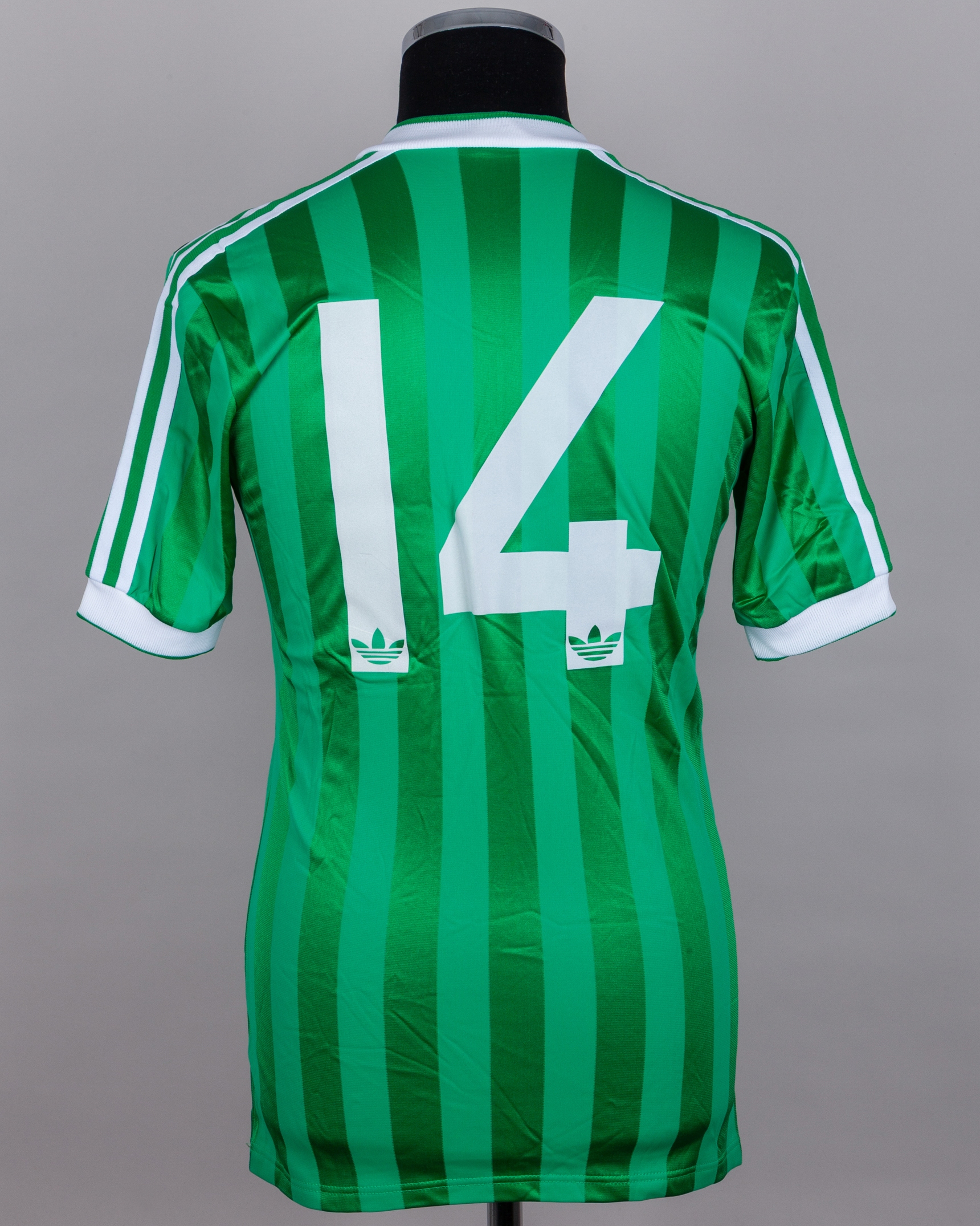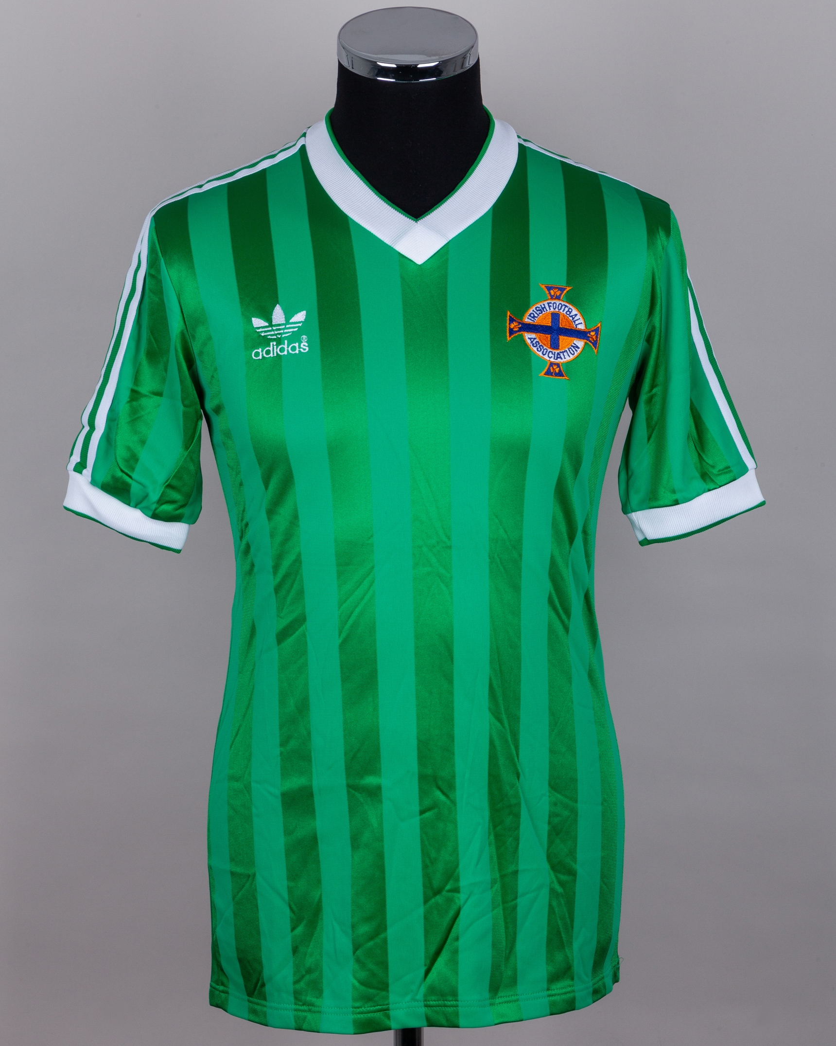 Green and white No.14 Northern Ireland v. England short-sleeved shirt, 1984, Adidas, Medium, with v-neck collar and embroidered badge inscribed IRISH FOOTBALL ASSOCIATION