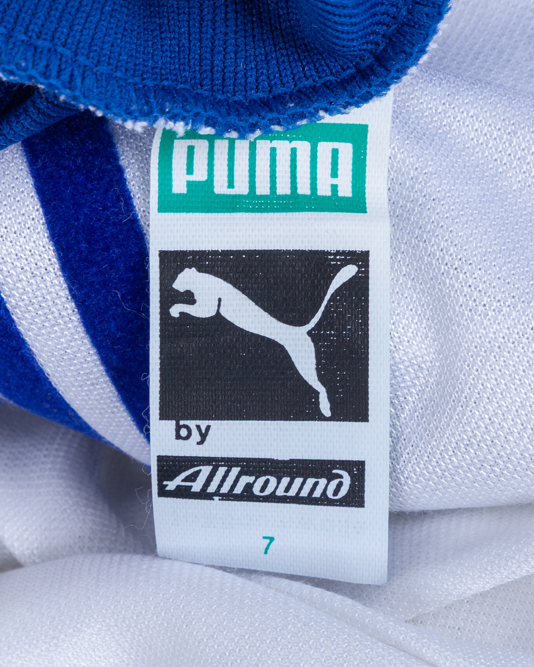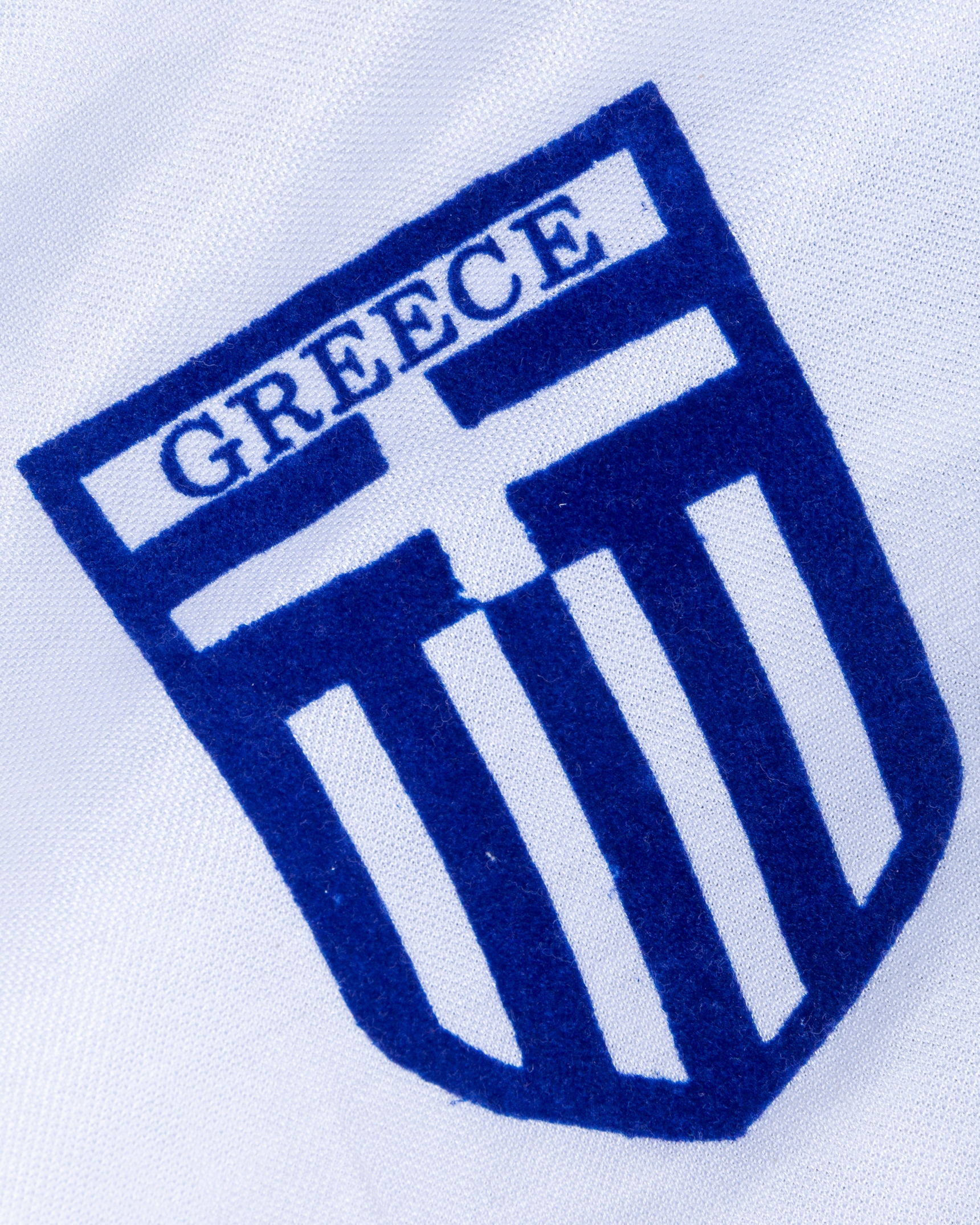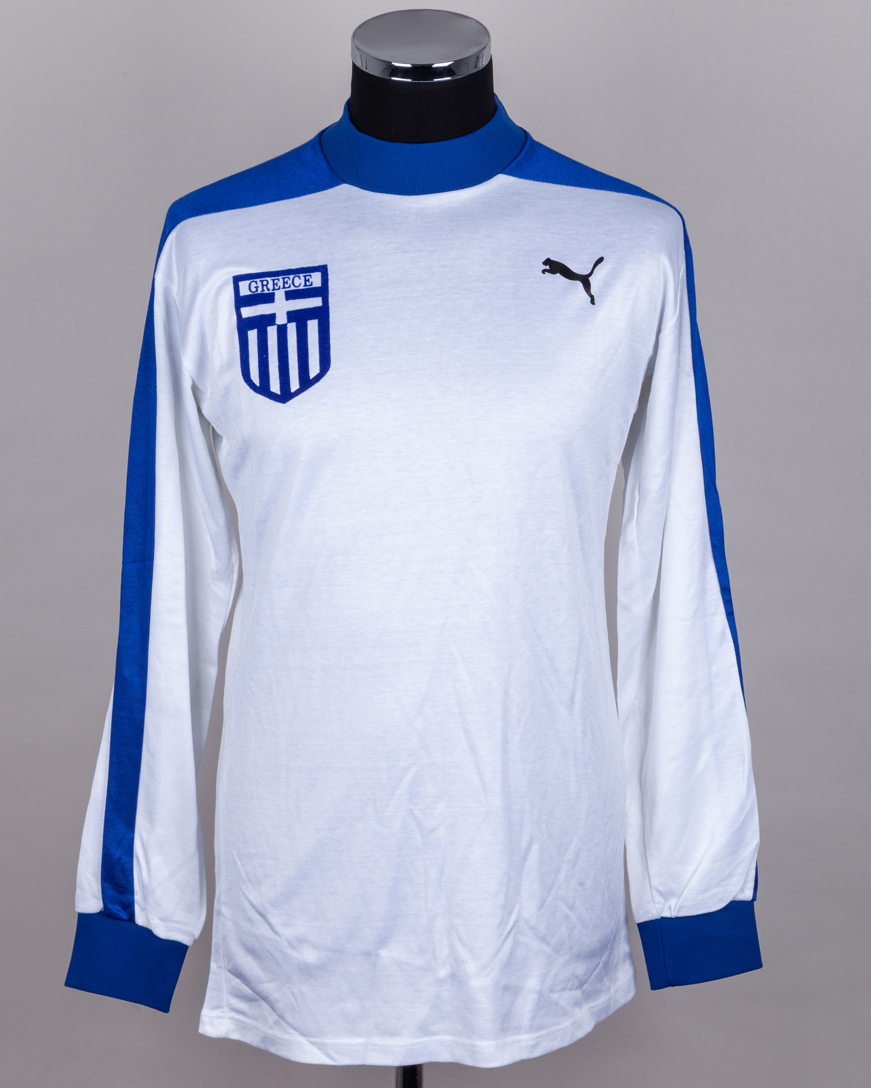 White and blue No.12 Greece v. England long-sleeved shirt, 1983, Puma, with crew-neck collar and sponge badge