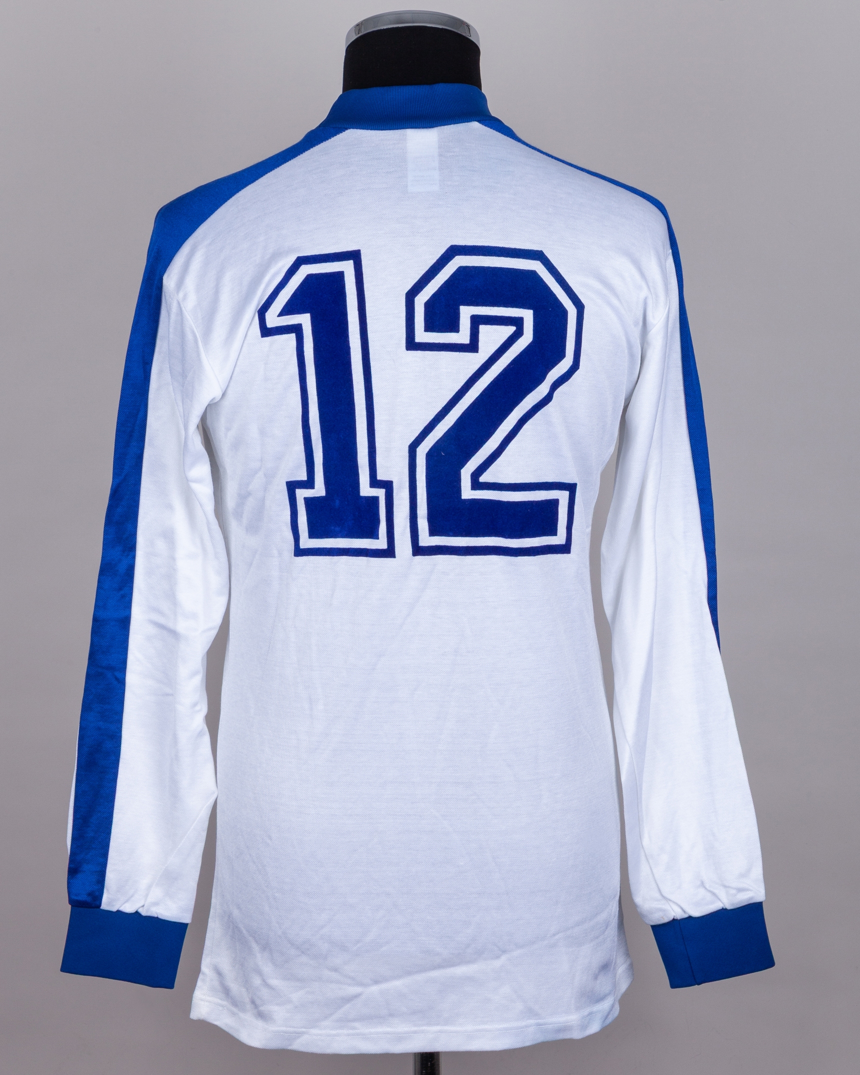 White and blue No.12 Greece v. England long-sleeved shirt, 1983