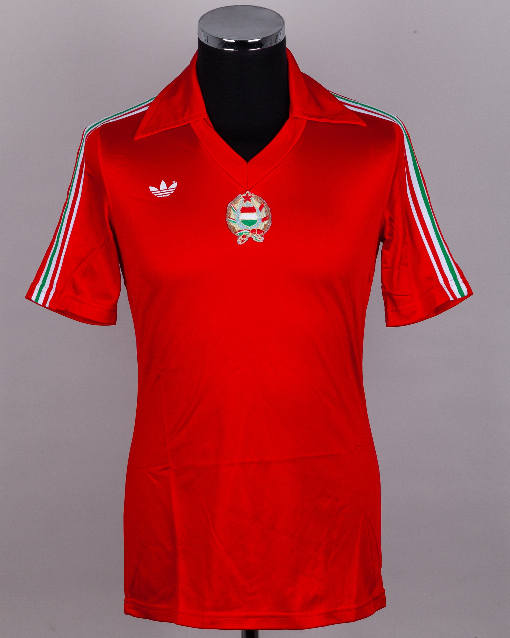 Red No.7 Hungary v. England match short-sleeved shirt, 1983, Adidas, with v-neck collar and embroidered cloth badge