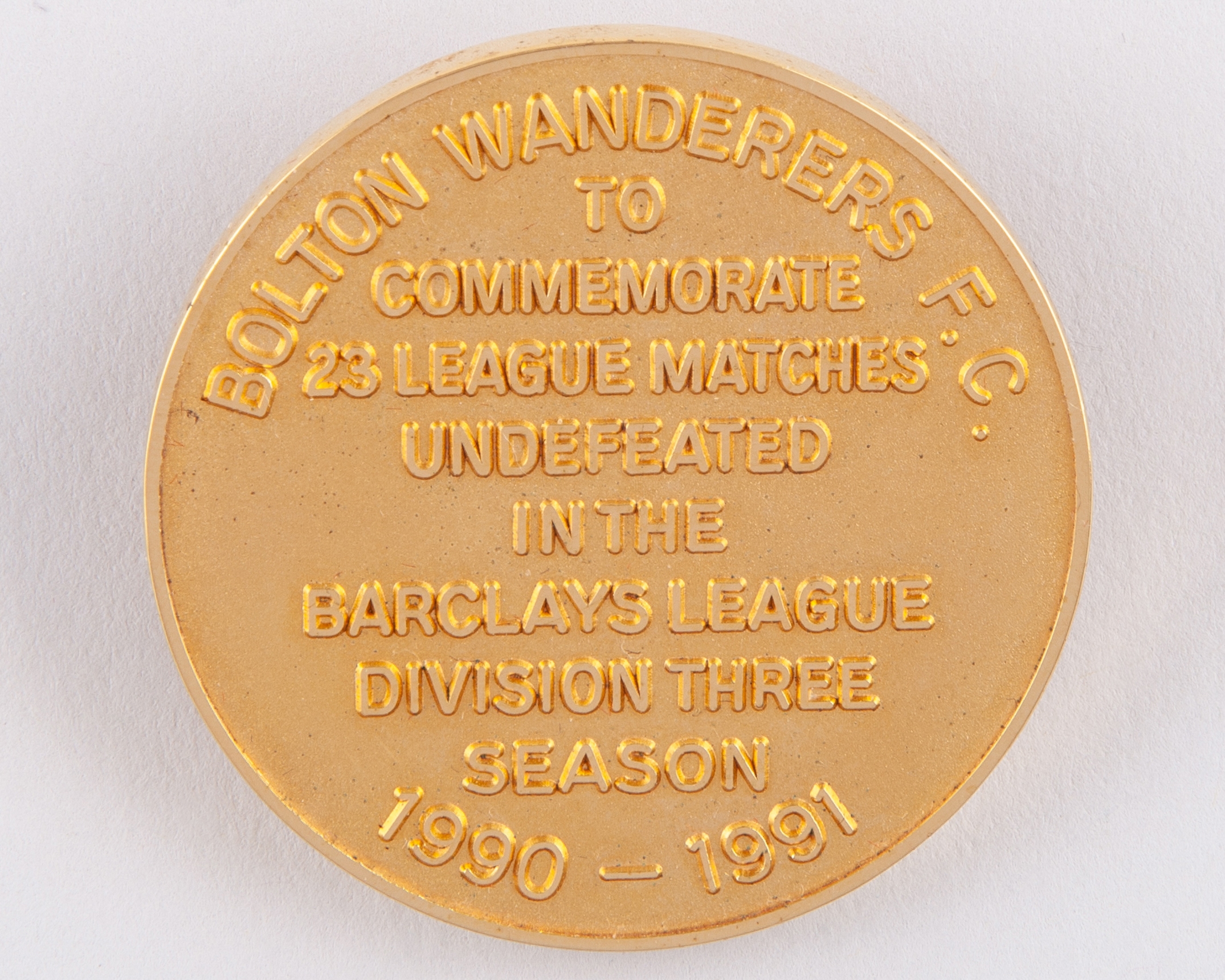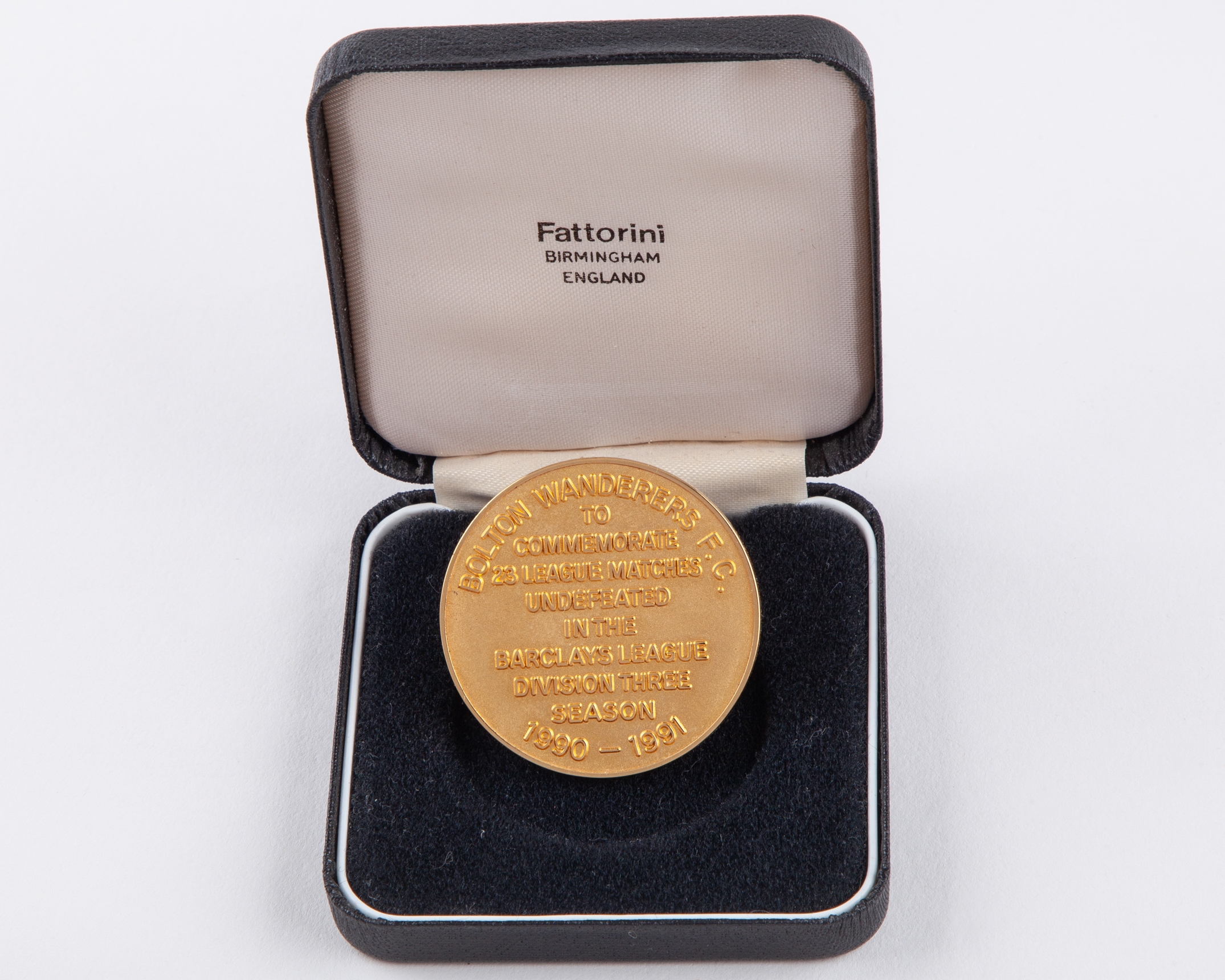 Sammy Lee a gilt-metal medal Bolton Wanderers commemorative medal, inscribed BOLTON WANDERERS F.C. TO COMMEMORATE 23 LEAGUE MATCHES UNDEFEATED IN THE BARCLAYS LEAGUE DIVISION 3 SEASON 1990-91, in original fitted case
