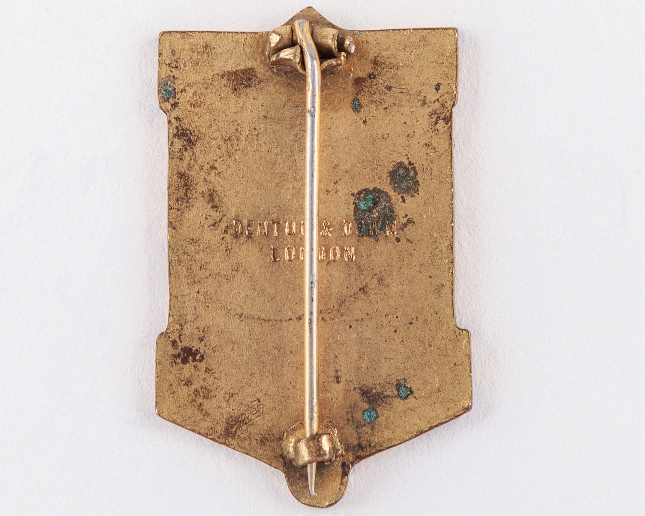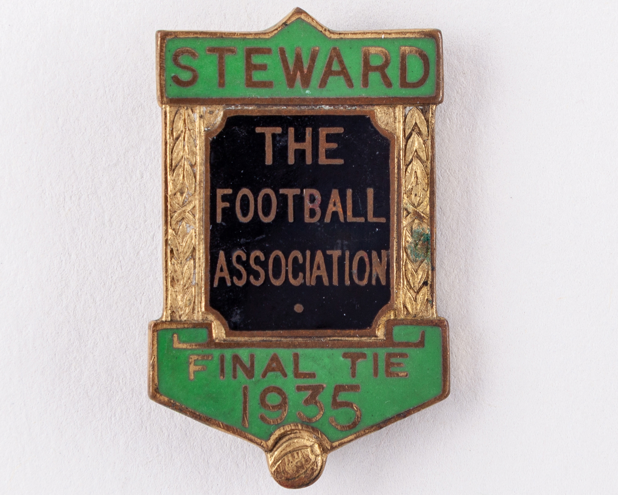 A gilt-metal and enamel Sheffield Wednesday v. West Bromwich Albion City, 1935, Football Association Cup Final steward's badge, inscribed FOOTBALL ASSOCIATION, STEWARD, FINAL TIE 1935, brooch fitting, wear to front and back