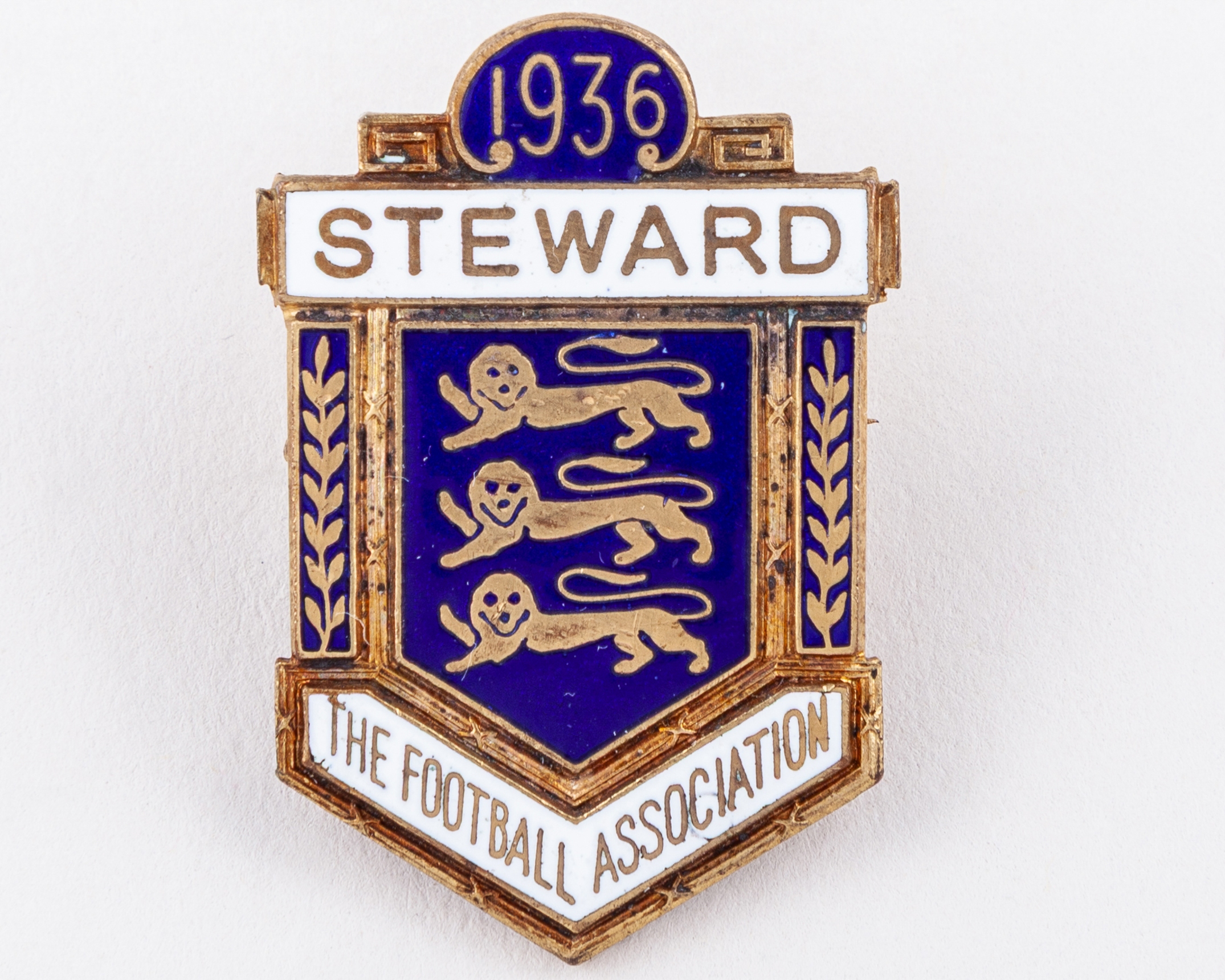 A gilt-metal and enamel Arsenal v. Sheffield United Football Association Cup Final steward's badge, 1936, inscribed FOOTBALL ASSOCIATION, STEWARD, 1936, brooch fitting