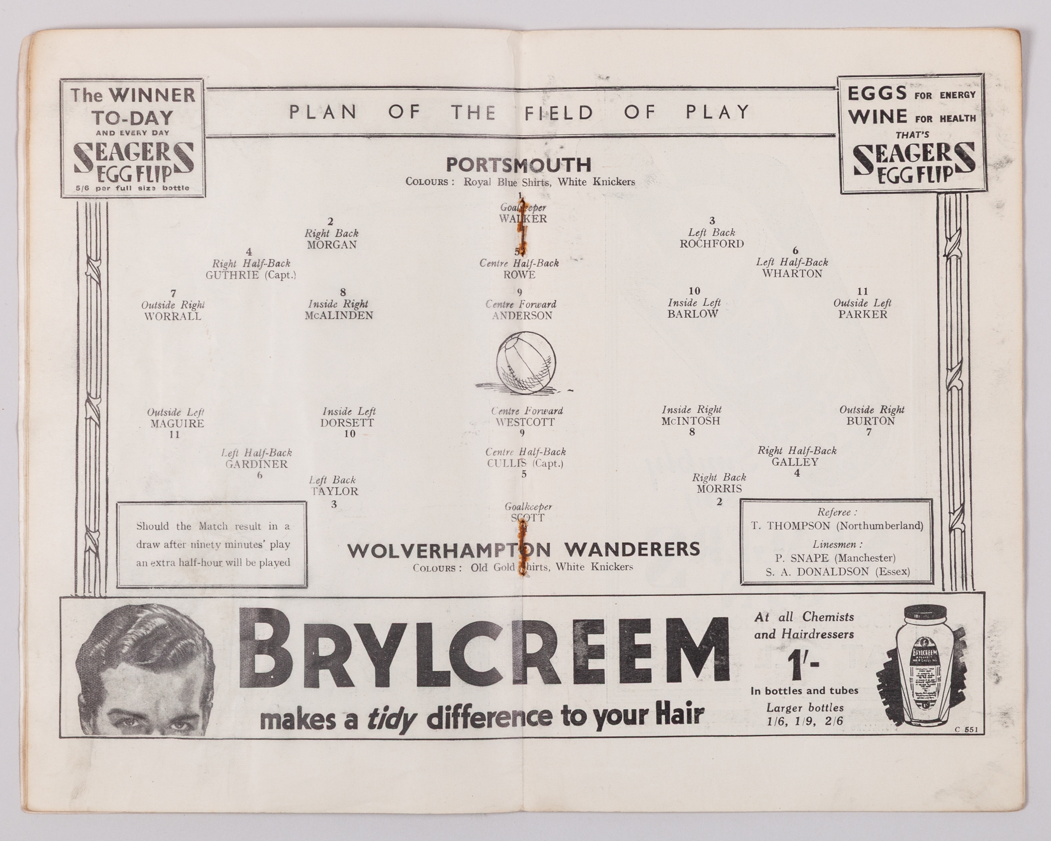 Huddersfield Town v. Preston North End F.A. Cup final match programme, 30th April 1938, folds, rusty staples, stained and Portsmouth v. Wolverhampton Wanderers, rusty staples, sign of fold and staining (2)