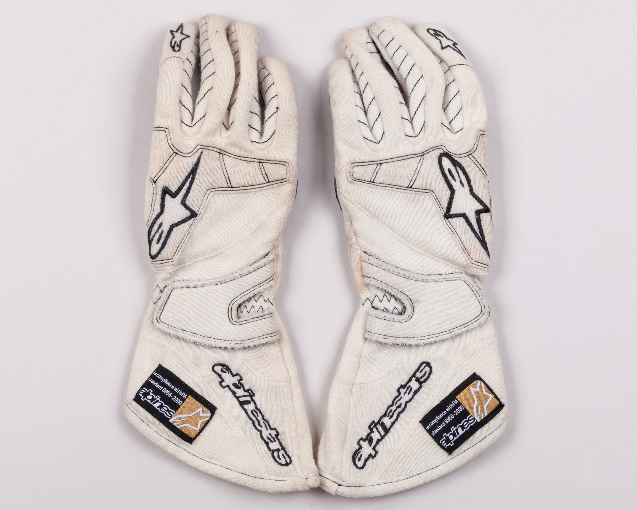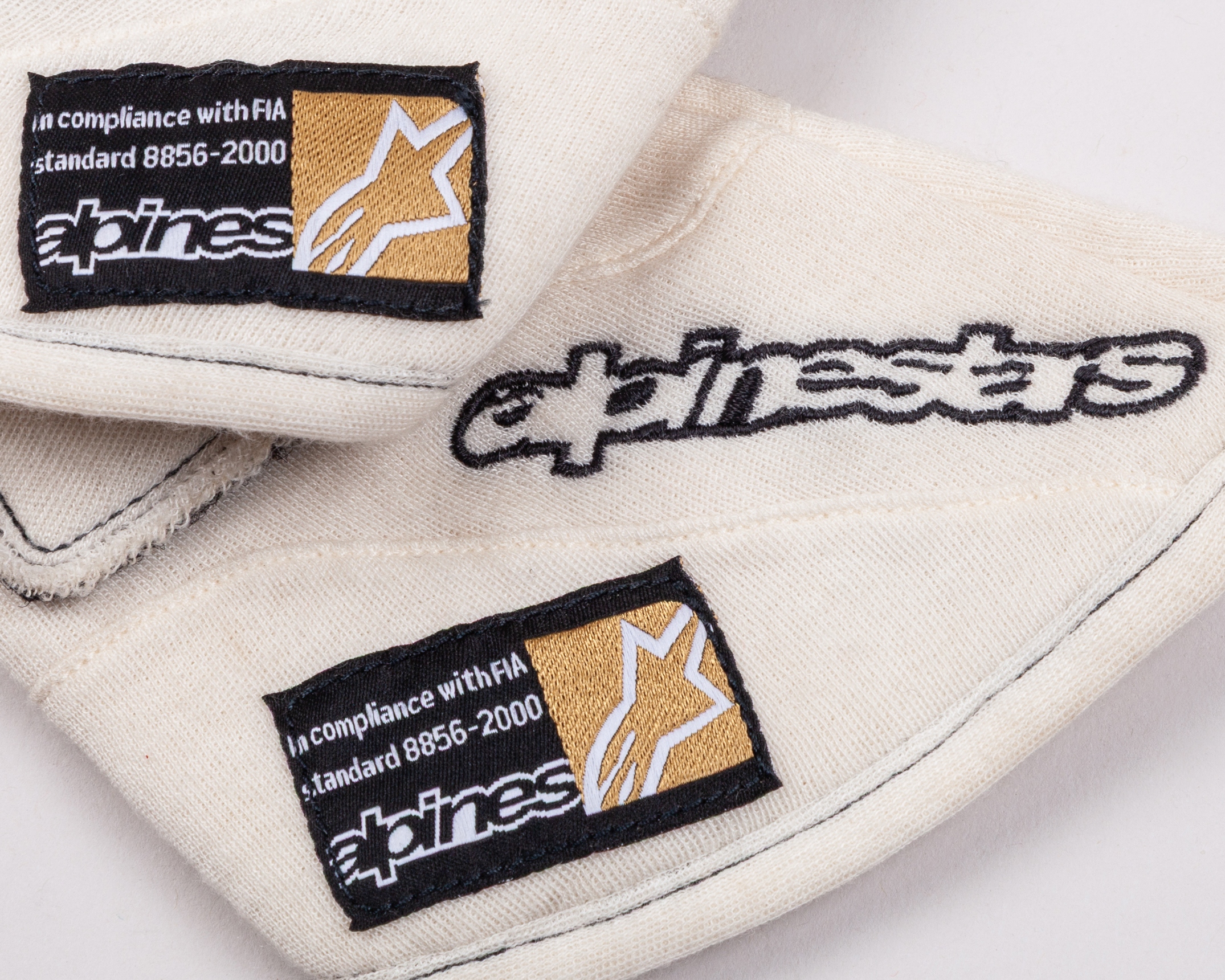 Crafted by Alpinestars, both black labels read: In compliance with FIA standard 8856-2000.