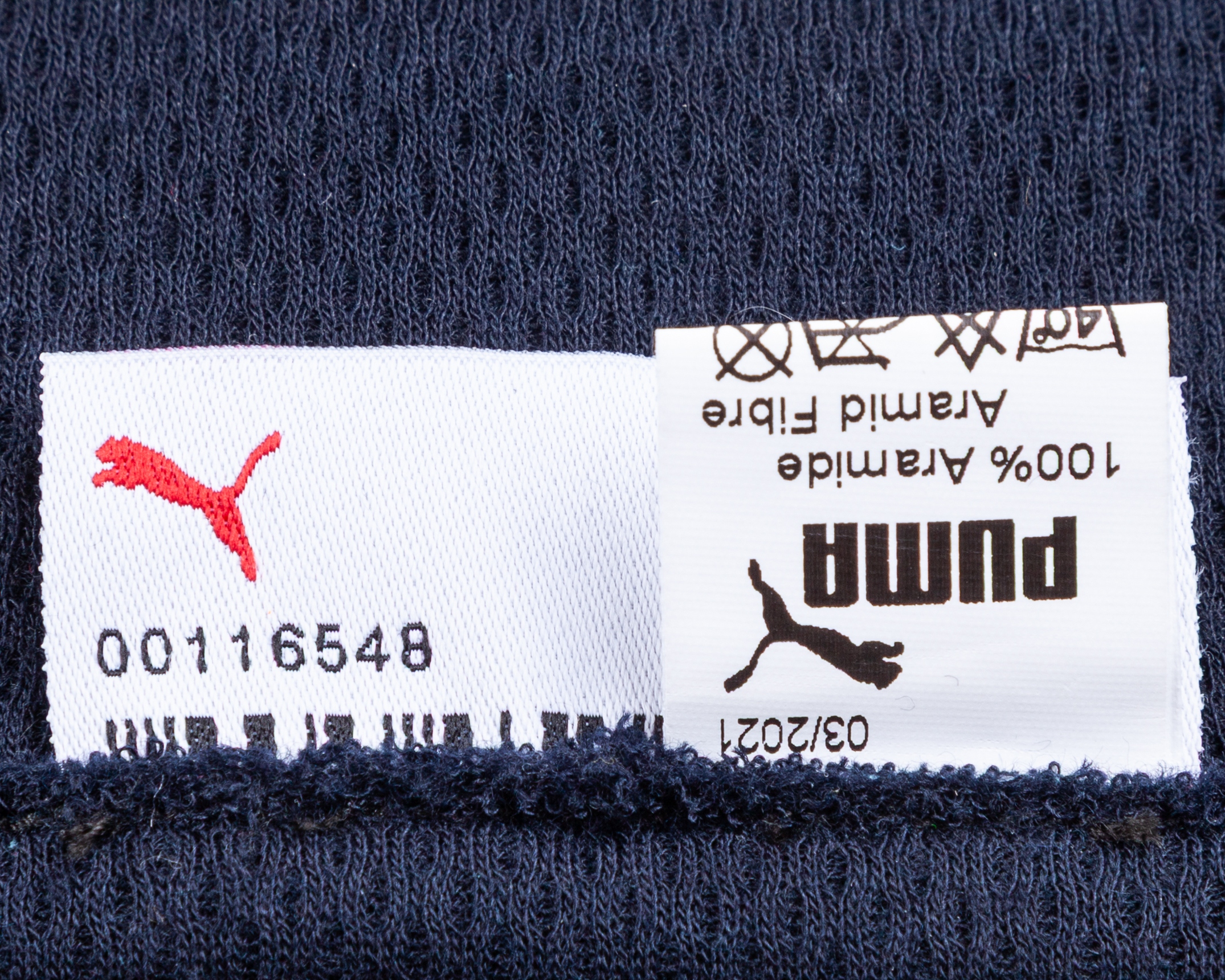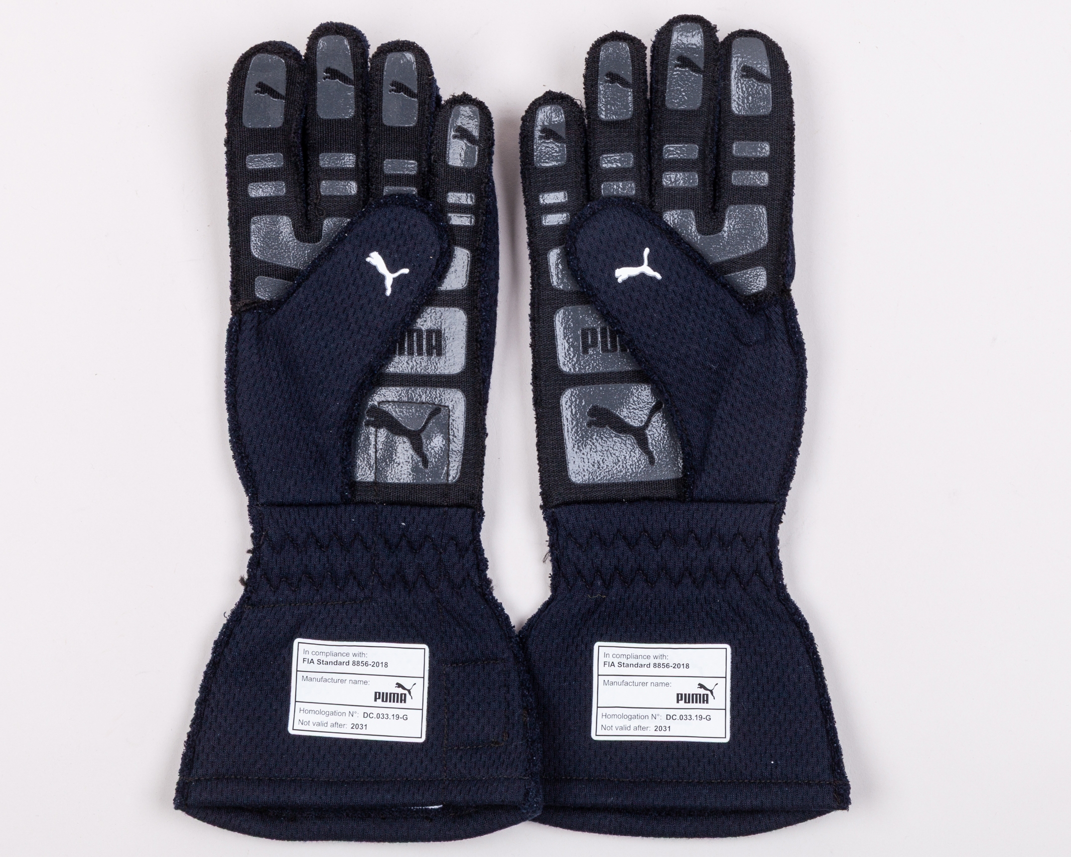 Crafted by Puma, both white labels on the inside of the gloves read: In compliance with: FIA Standard 8856-2018 / Manufacturer name: Puma / Homologation No: DC.033.19-G / Not valid until: 2031.