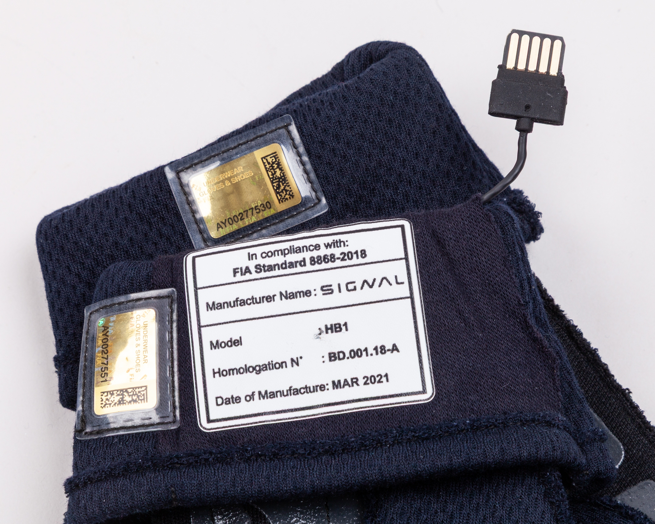The FIA hologram numbers on the gloves read: AY00277530 and AY00277551.