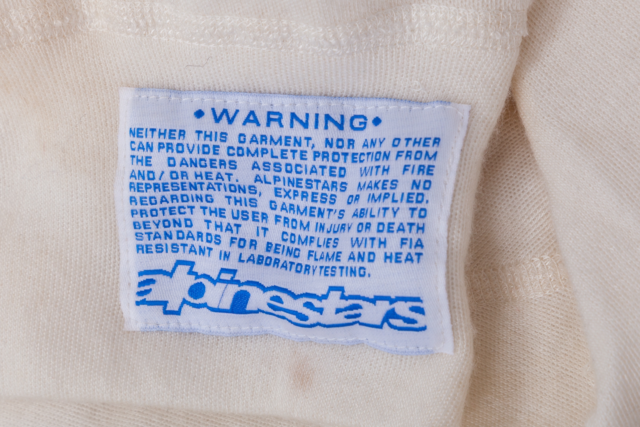 The Alpinestars label on the top back of the suit reads: In compliance with FIA standard 8856-2000.