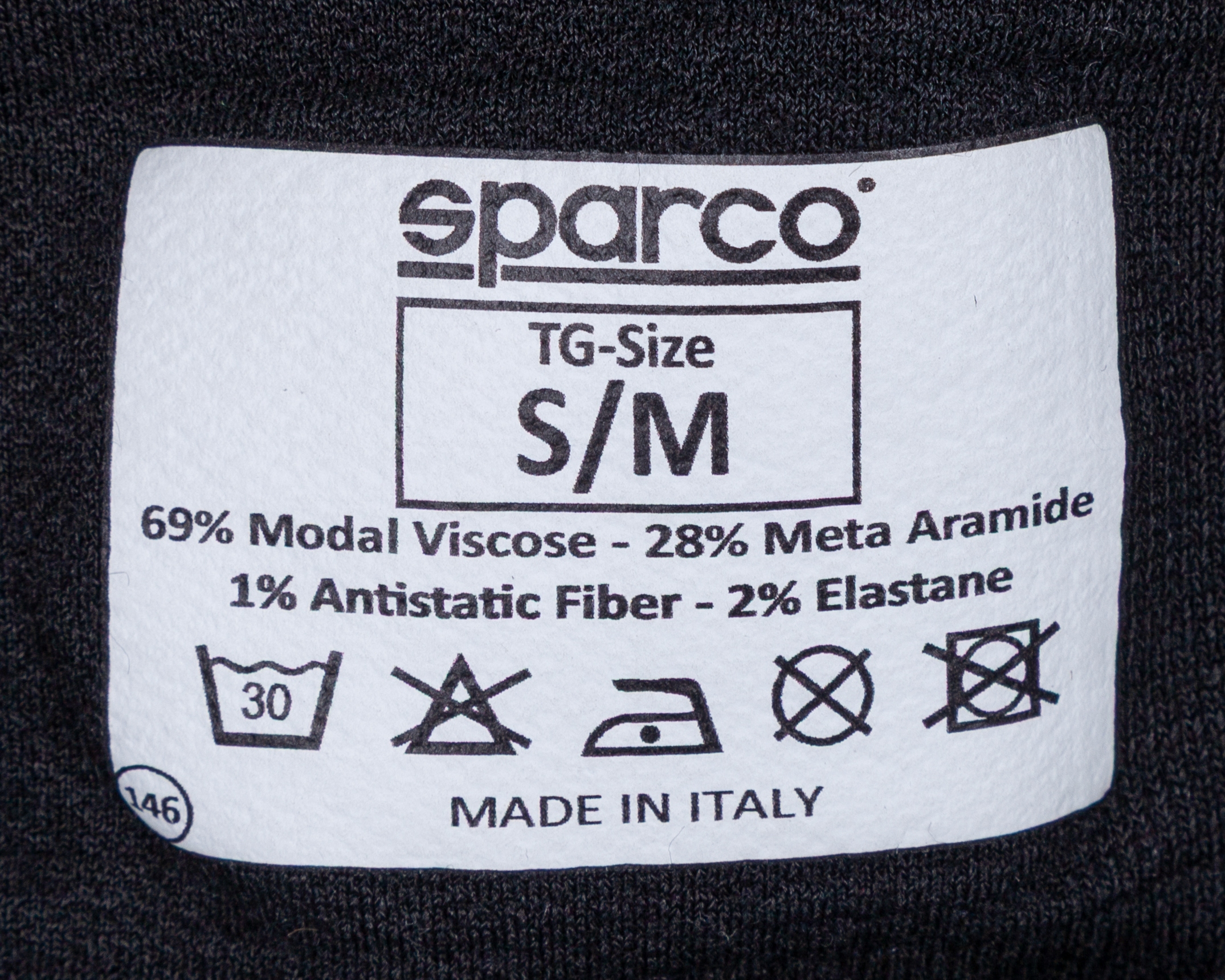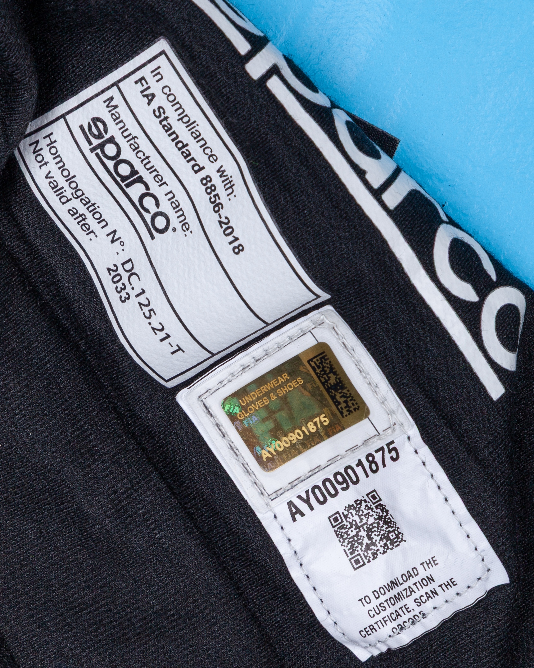 The Sparco label on the nomex top reads: In compliance with: FIA standard 8856-2018 / Manufacturer name: Sparco / Homologation No: DC.125.21-T / Not valid after: 2033.