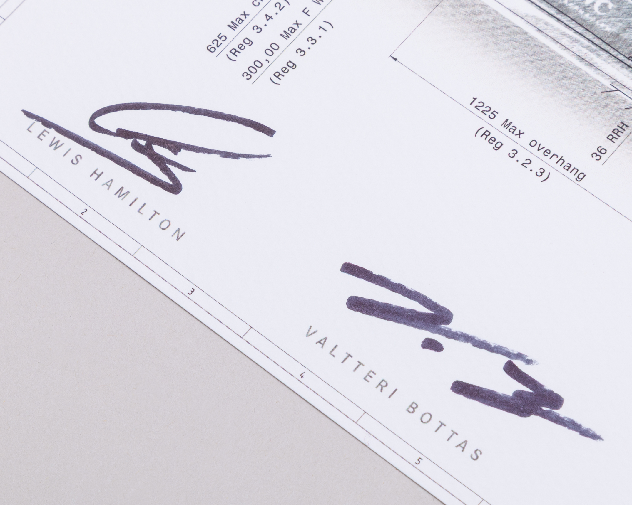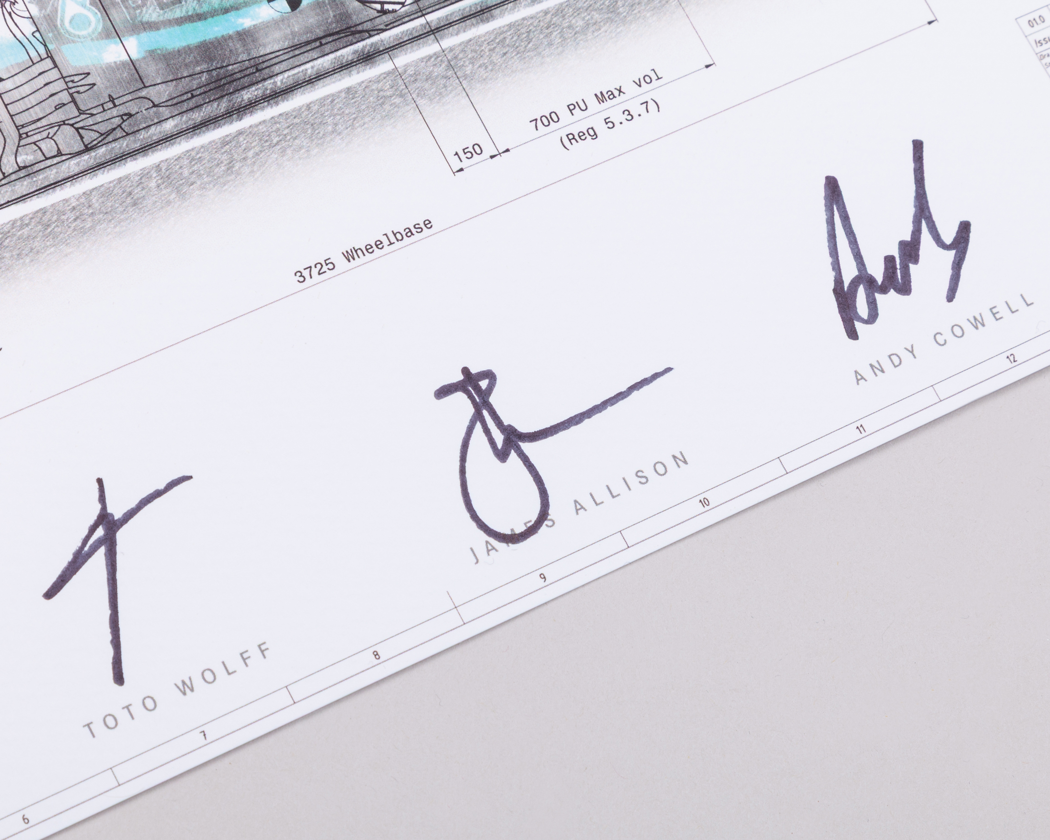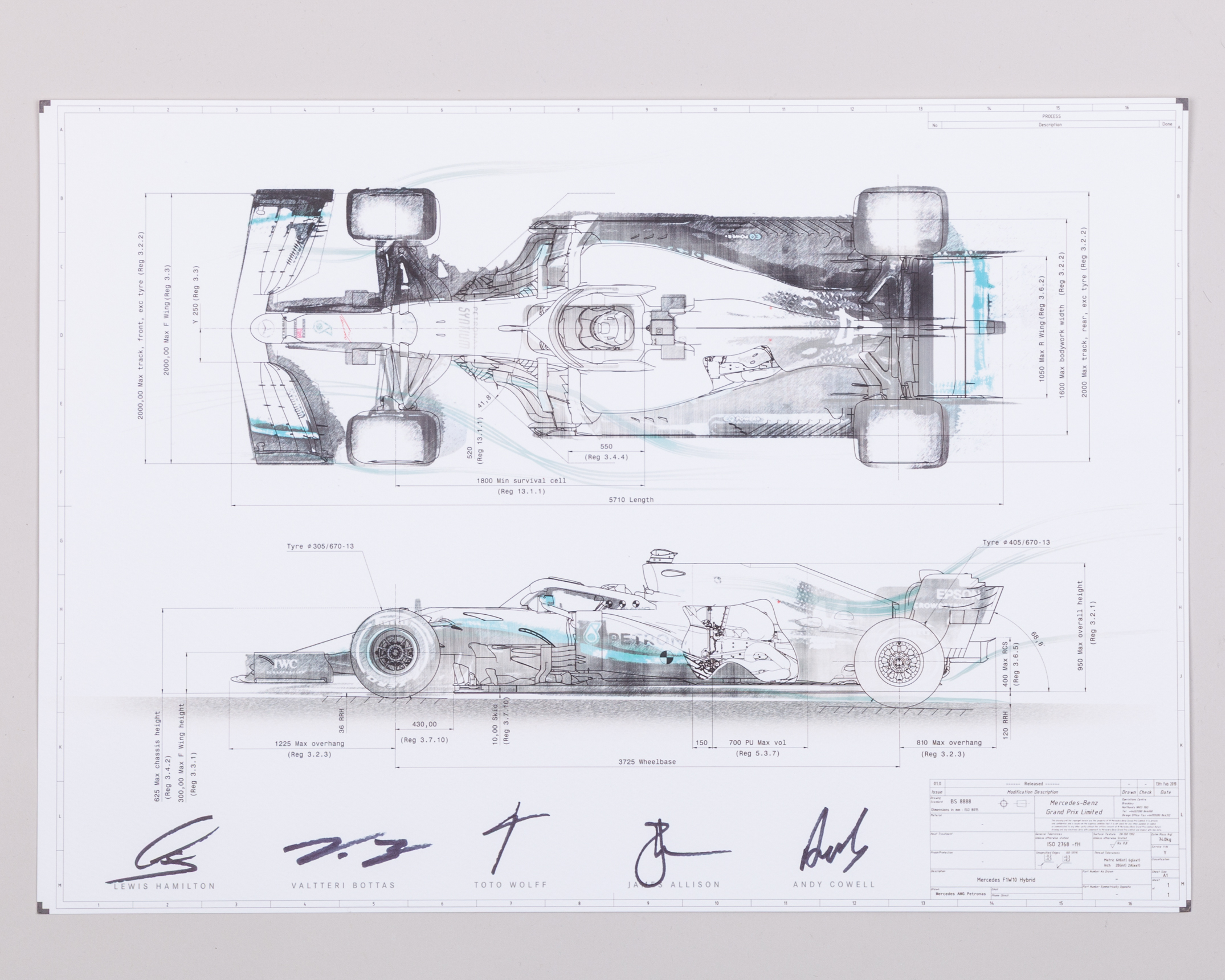The technical drawing is signed by Lewis Hamilton, Valtteri Bottas, Toto Wolff, James Allison, and Andy Cowell.