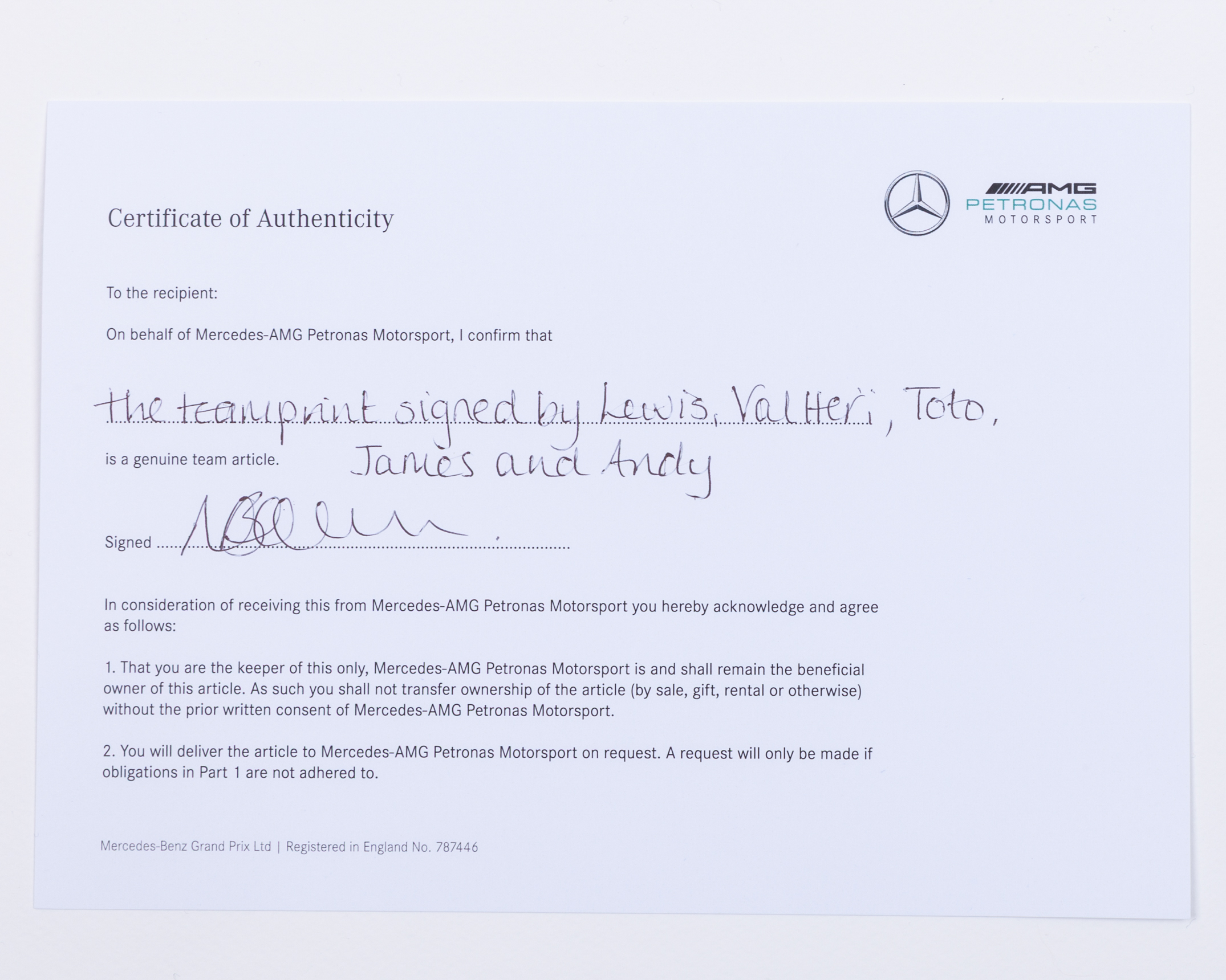 Complete with a certificate of authenticity from Mercedes-AMG Petronas Motorsport.