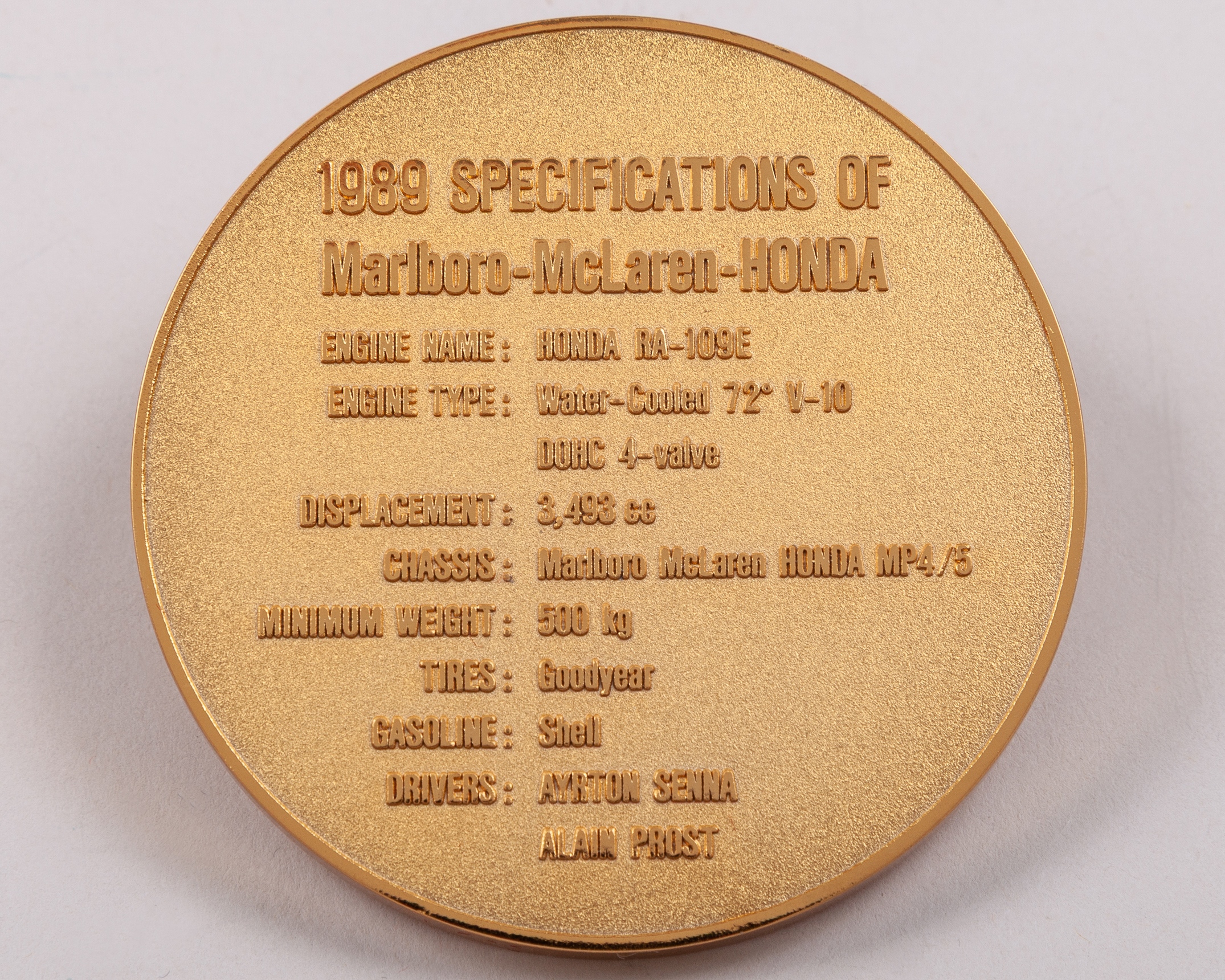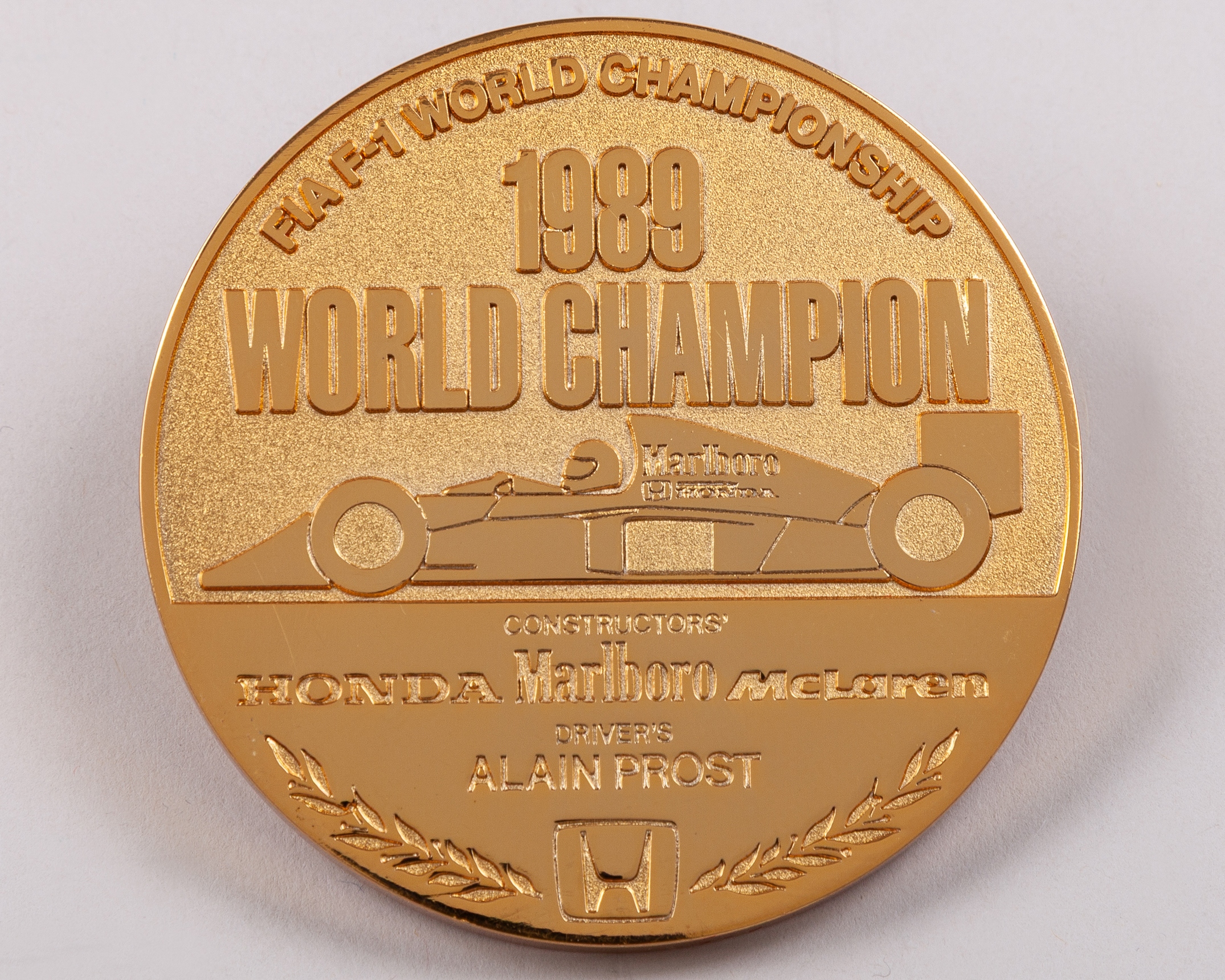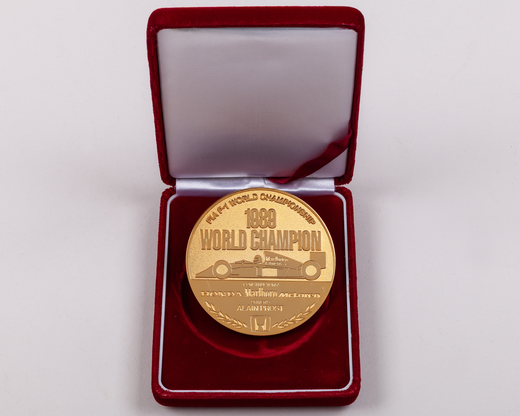 The obverse inscribed FIA F1 WORLD CHAMPIONSHIP, 1989 WORLD CHAMPION CONSTRUCTORS, HONDA, MARLBORO MCLAREN Driver's ALAIN PROST, the reverse with 1989 specification details in original fitted case.