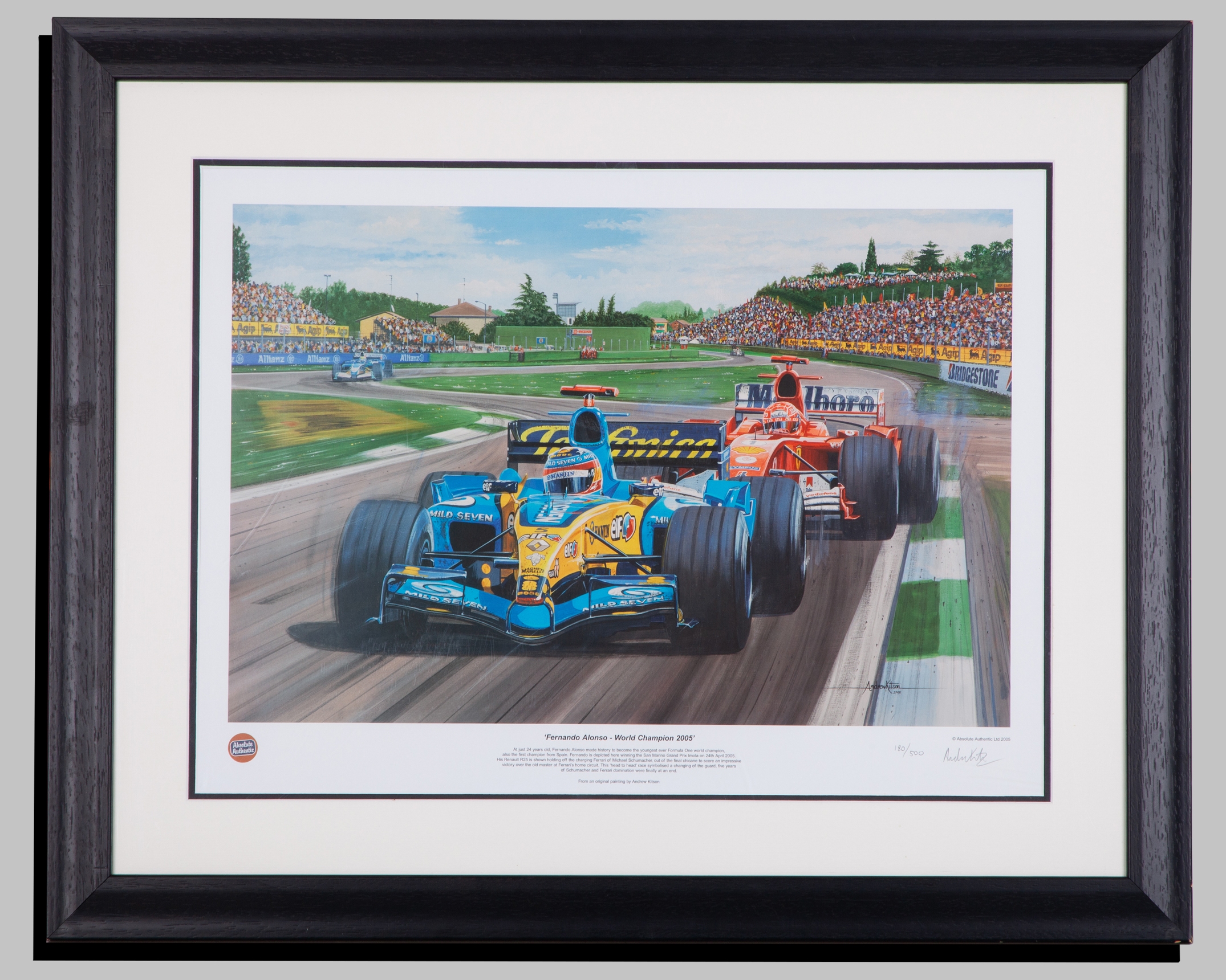 This limited edition print captures Fernando Alonso during his World Championship winning season in 2005 at the San Marino Grand Prix. Personally signed by artist Andrew Kitson.