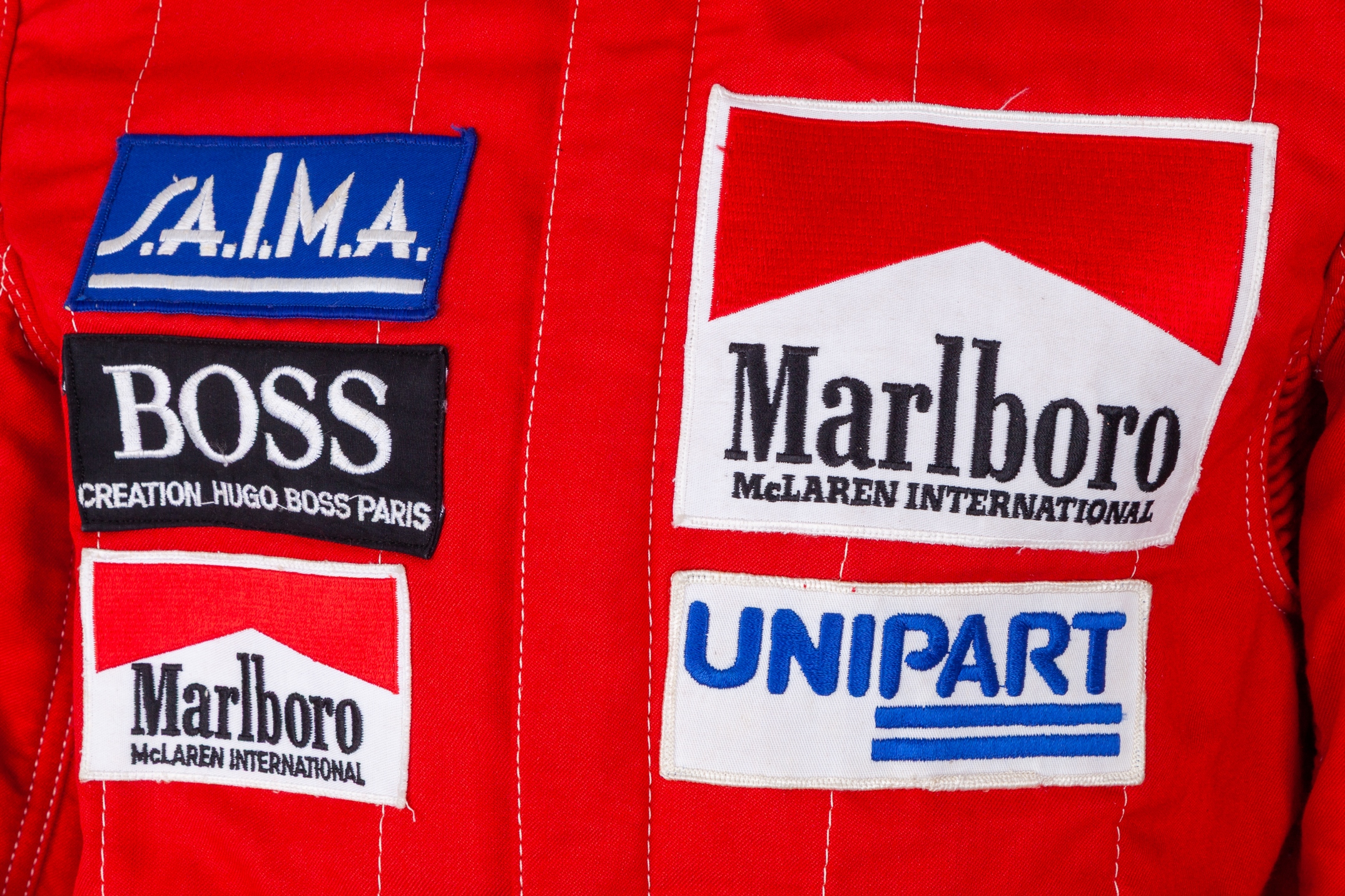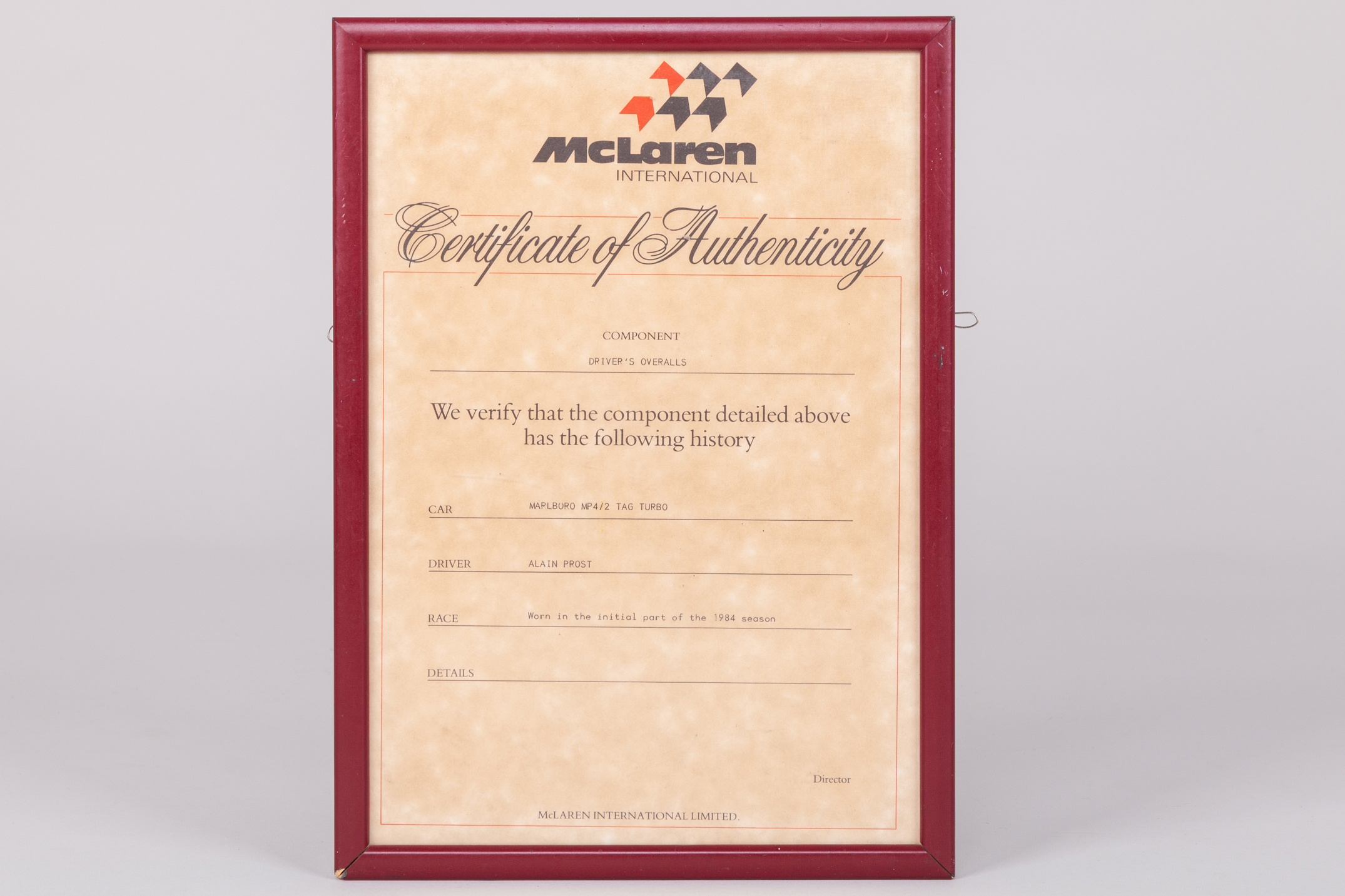 This suit is accompanied by a certificate of authenticity issued by McLaren, stating - worn in the initial part of the 1984 season.