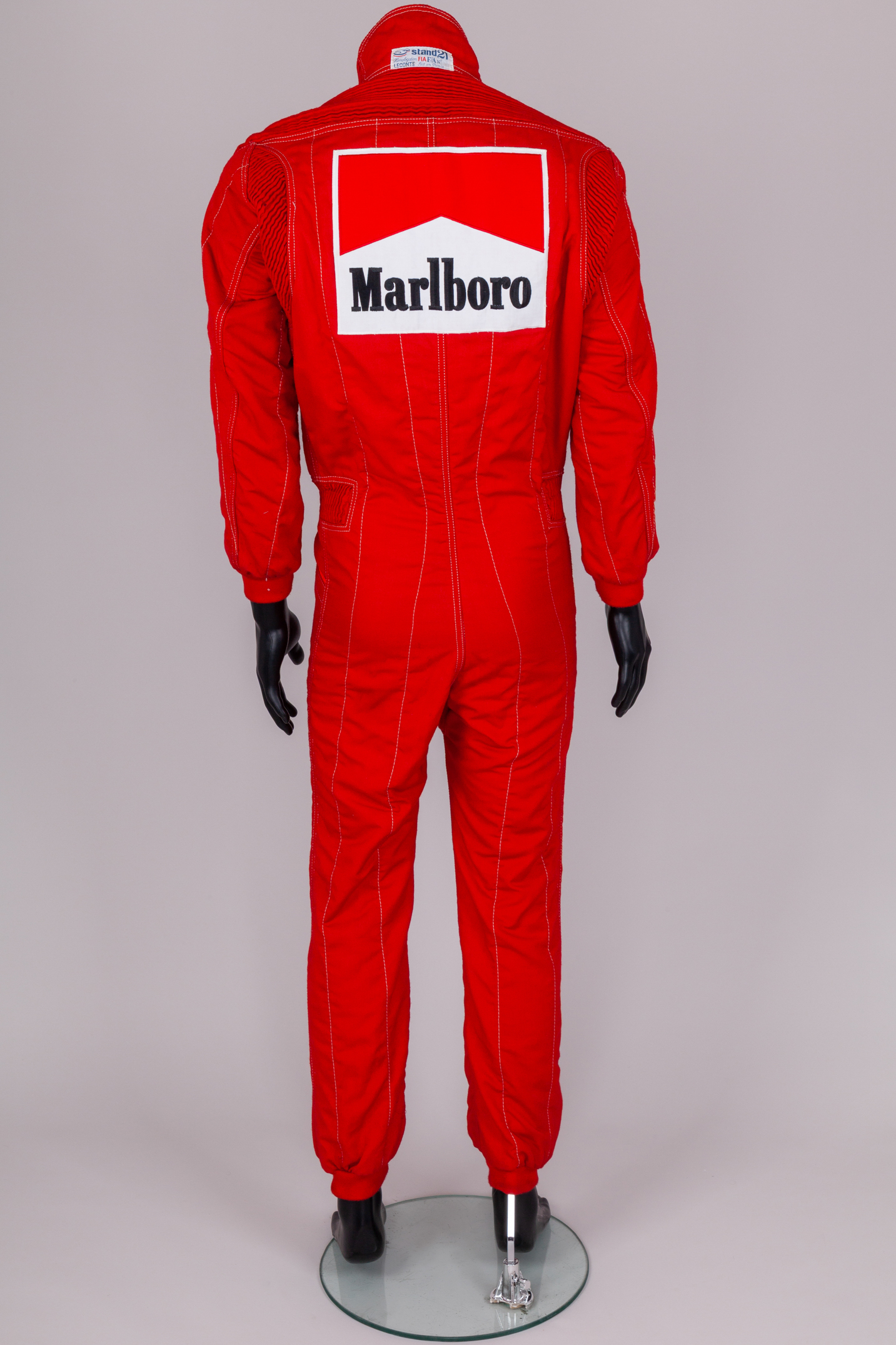 The suit is believed to have been used by Alain prior to the season starting, as a full red race suit with the logos being added at a later date.