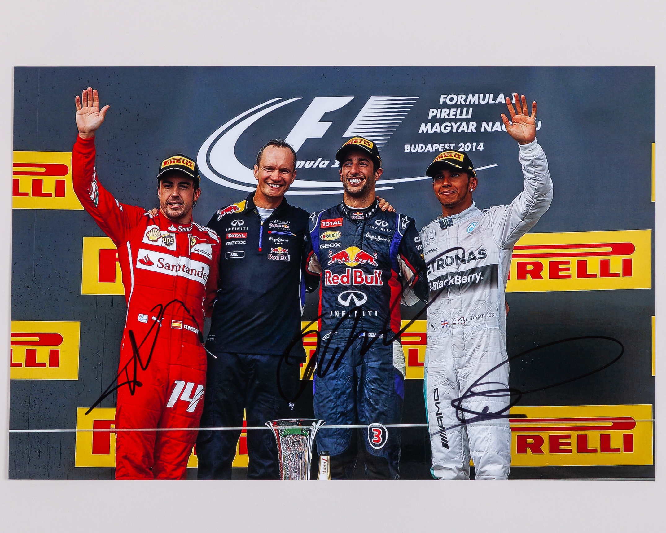 This A4 photo has been personally signed by F1 World Champions Lewis Hamilton, Fernando Alonso, and F1 fan favourite Daniel Ricciardo.
