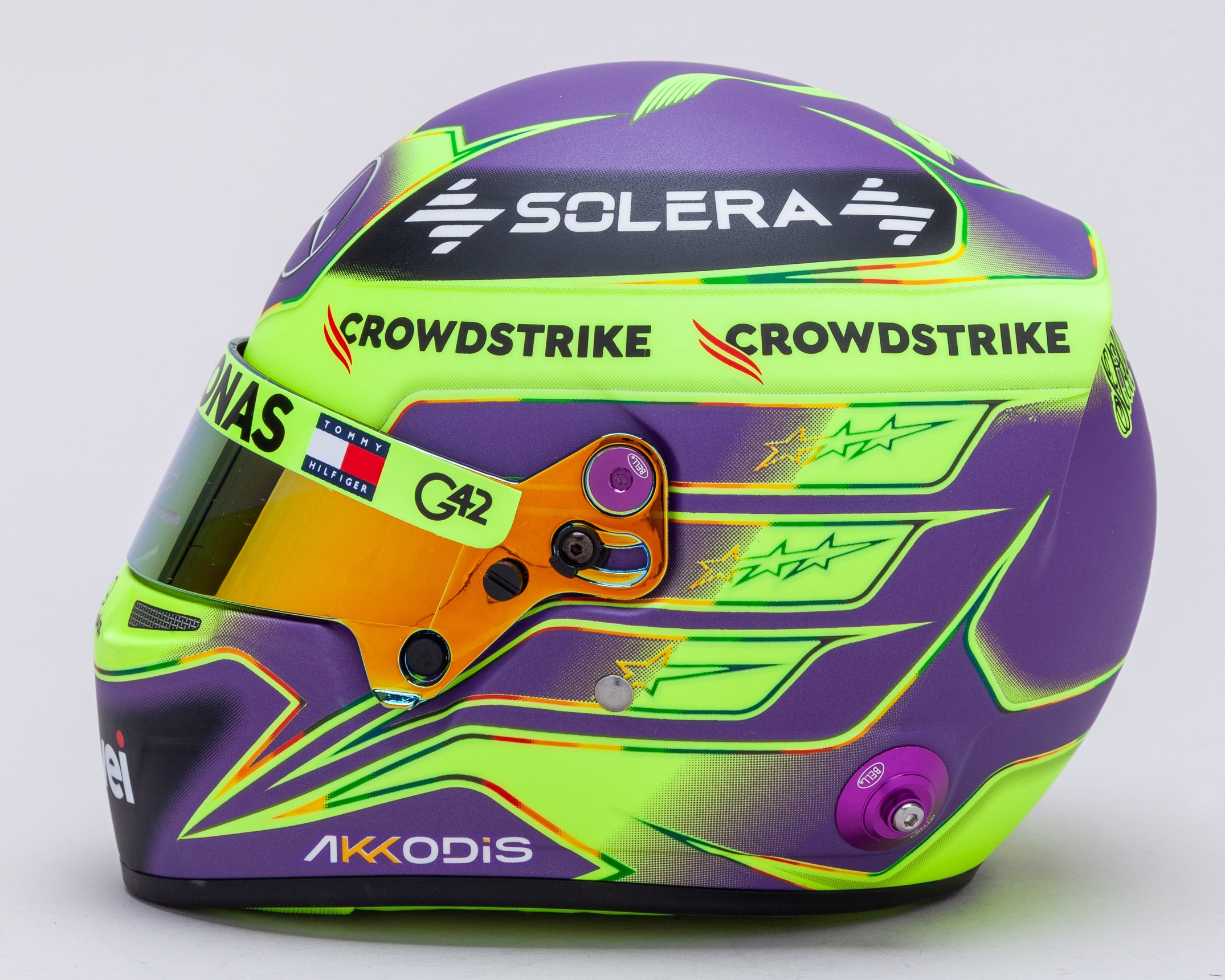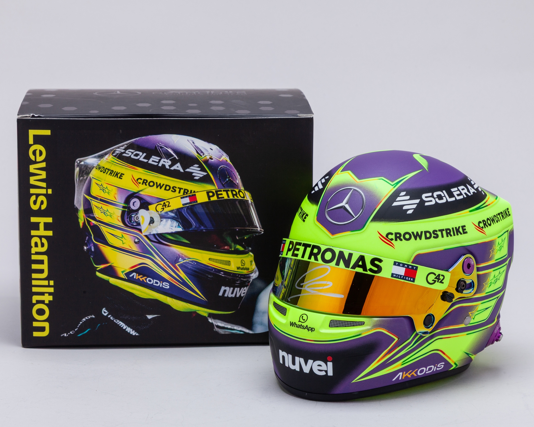 The helmet features the 2024 Mercedes livery and comes complete with its original box and bag, ensuring the helmet remains in pristine condition and ready for display.