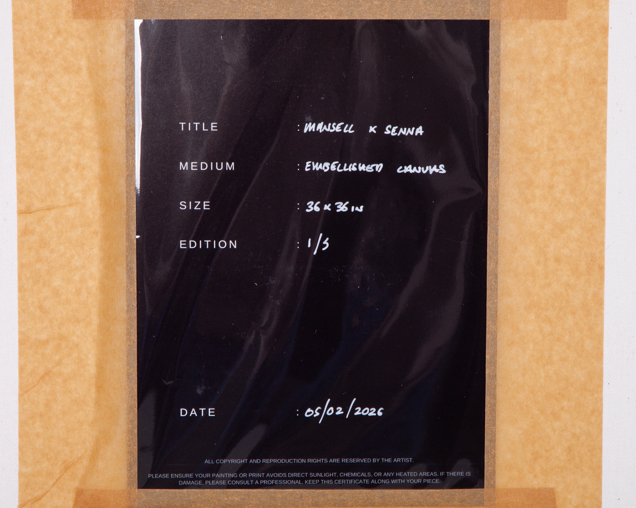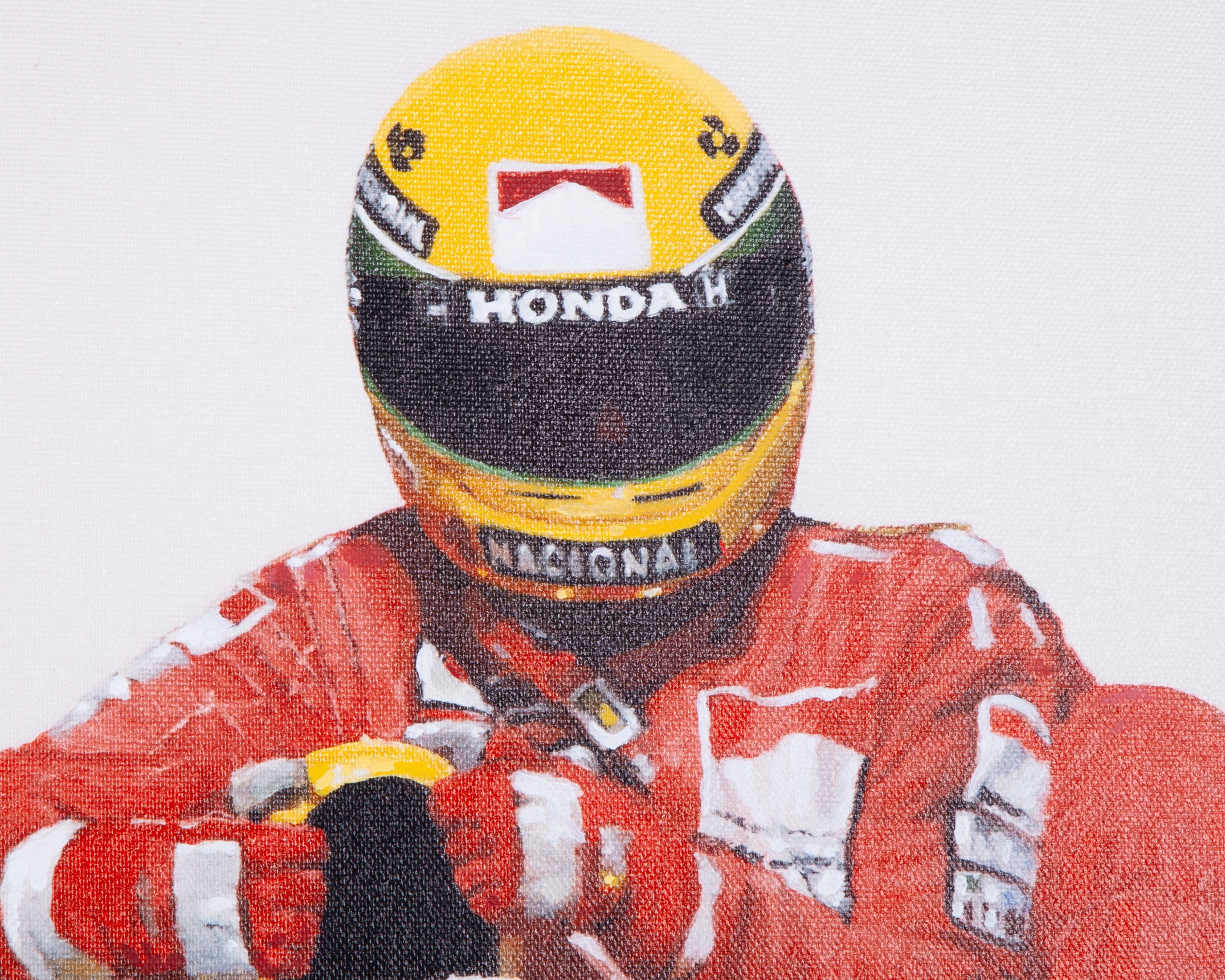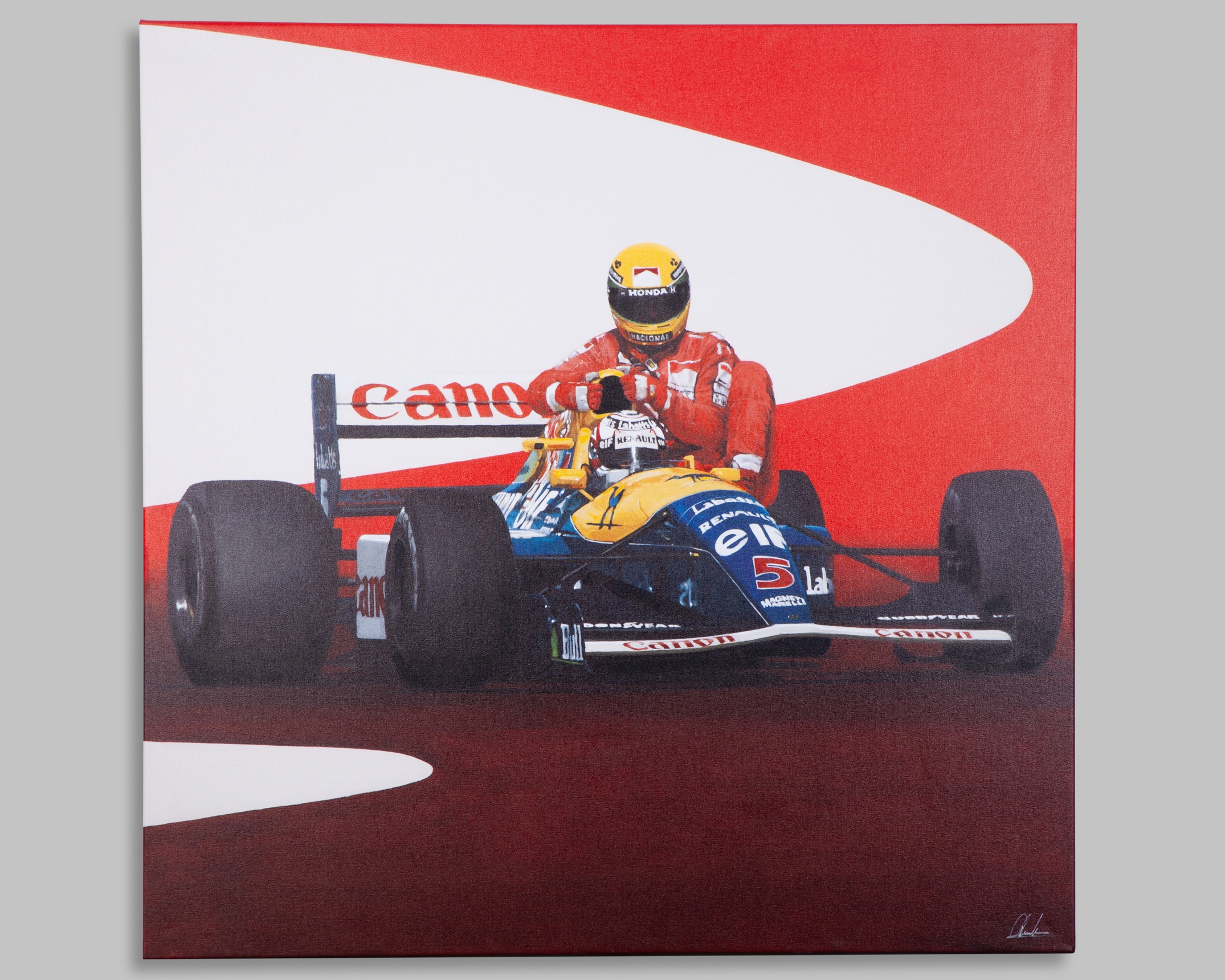 This piece captures the unforgettable moment at the 1991 Silverstone Grand Prix when Nigel Mansell gave Ayrton Senna a lift back to the pits. One of the most iconic moments in the history of Formula One.