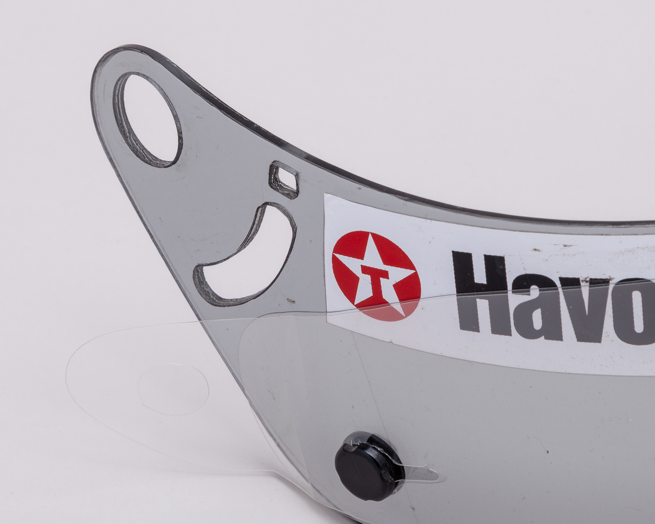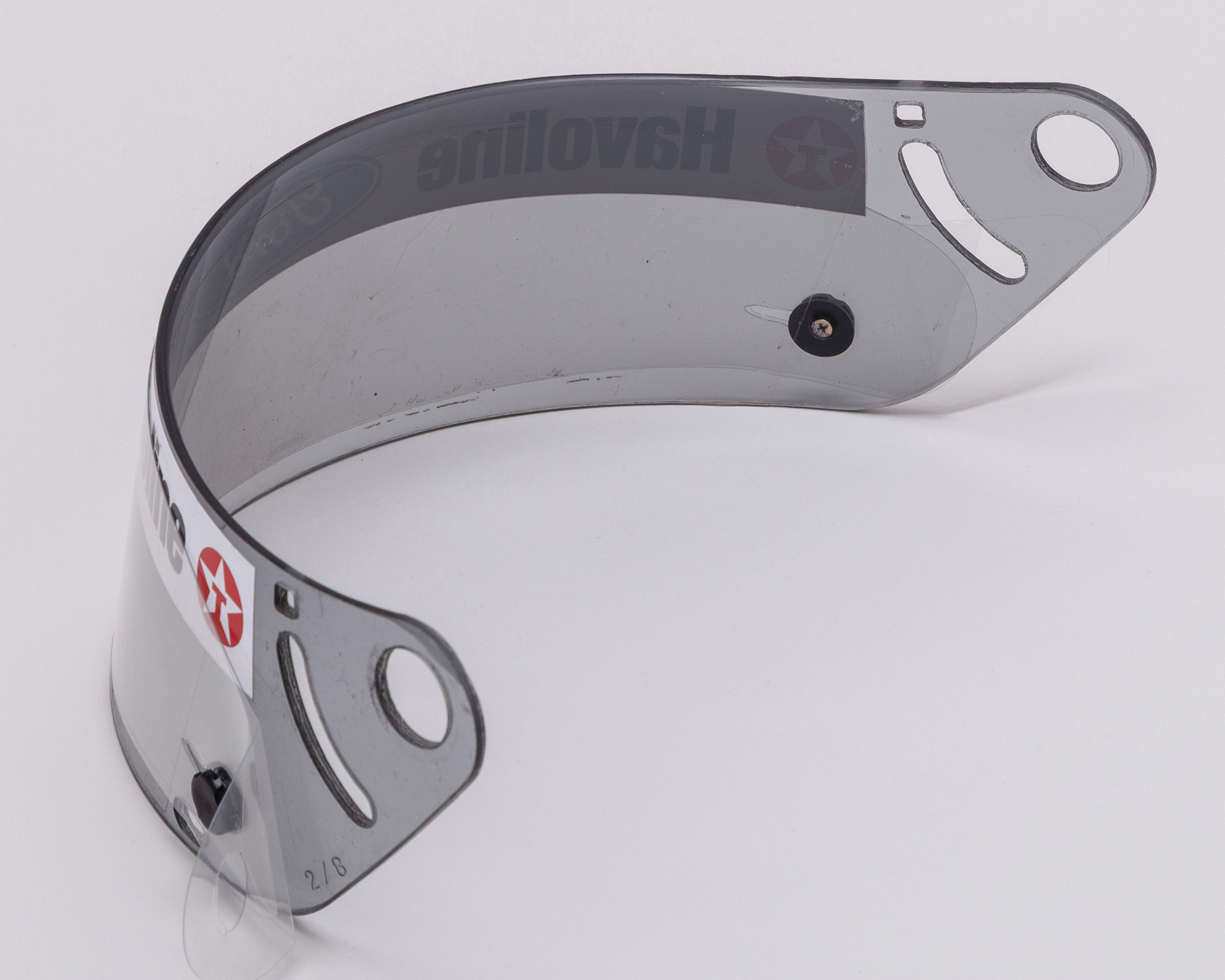 A genuine Arai GP4 smoke tint visor with tear-offs. It has a manufacture date 2/8 on the visor.