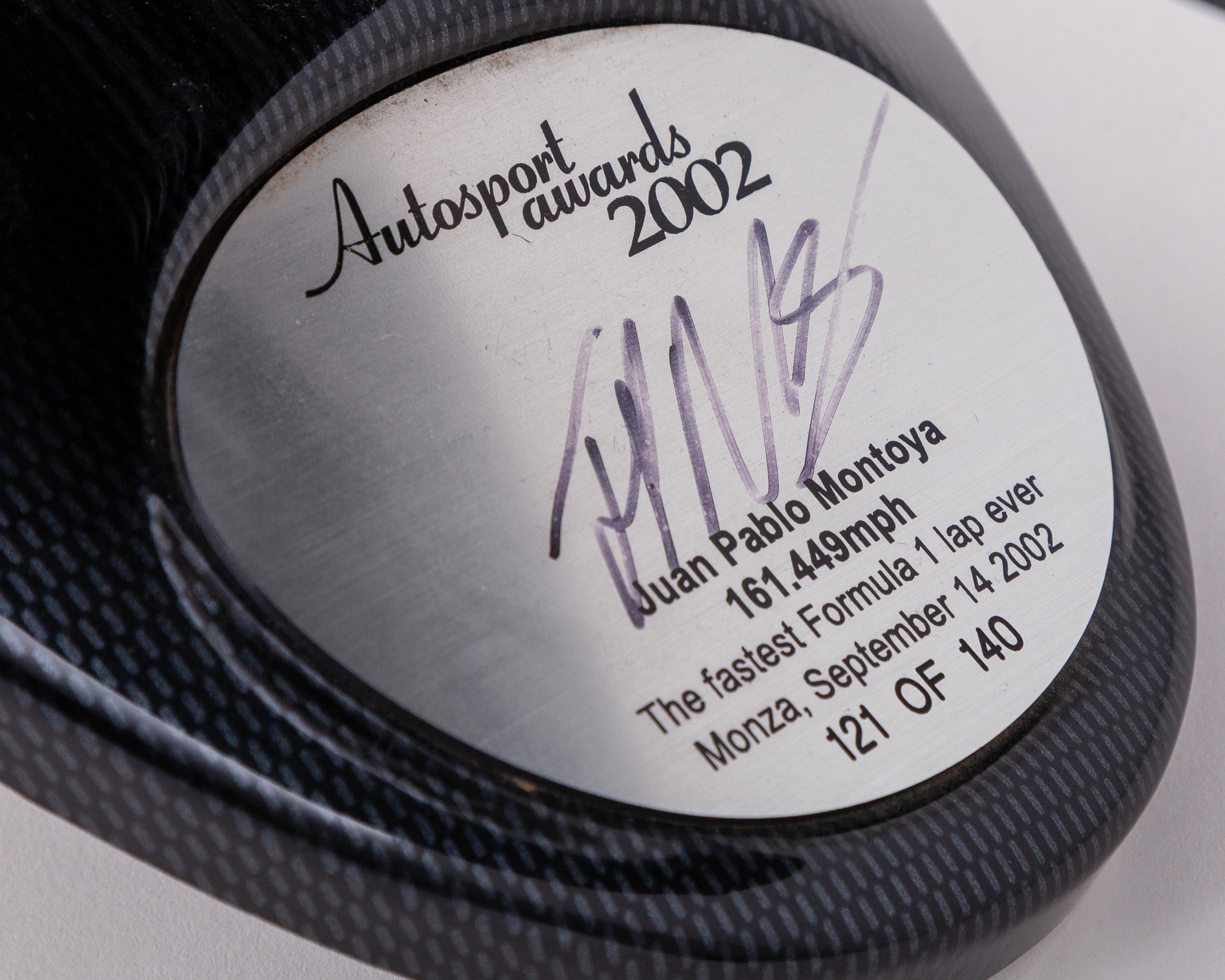 Plaque inscribed Juan Pablo Montoya 161.449mph. The fastest Formula 1 lap ever, Monza, September 14 2002.