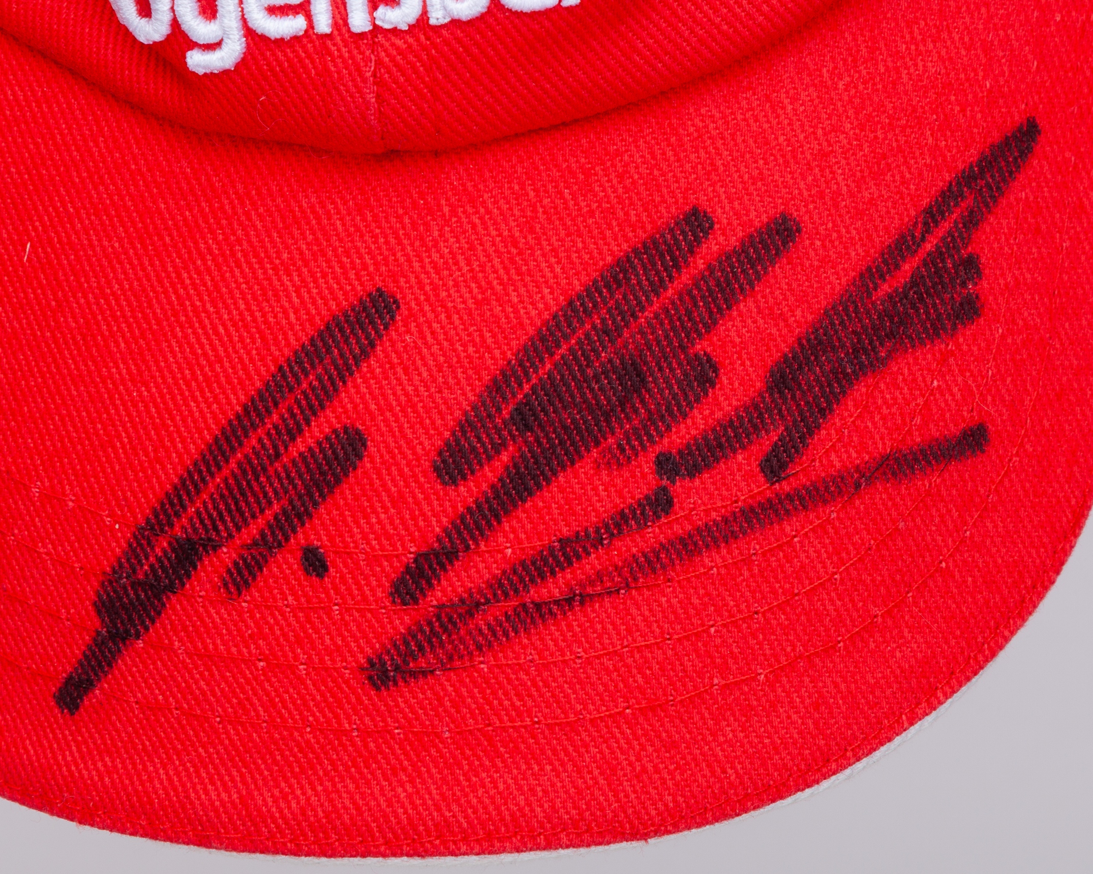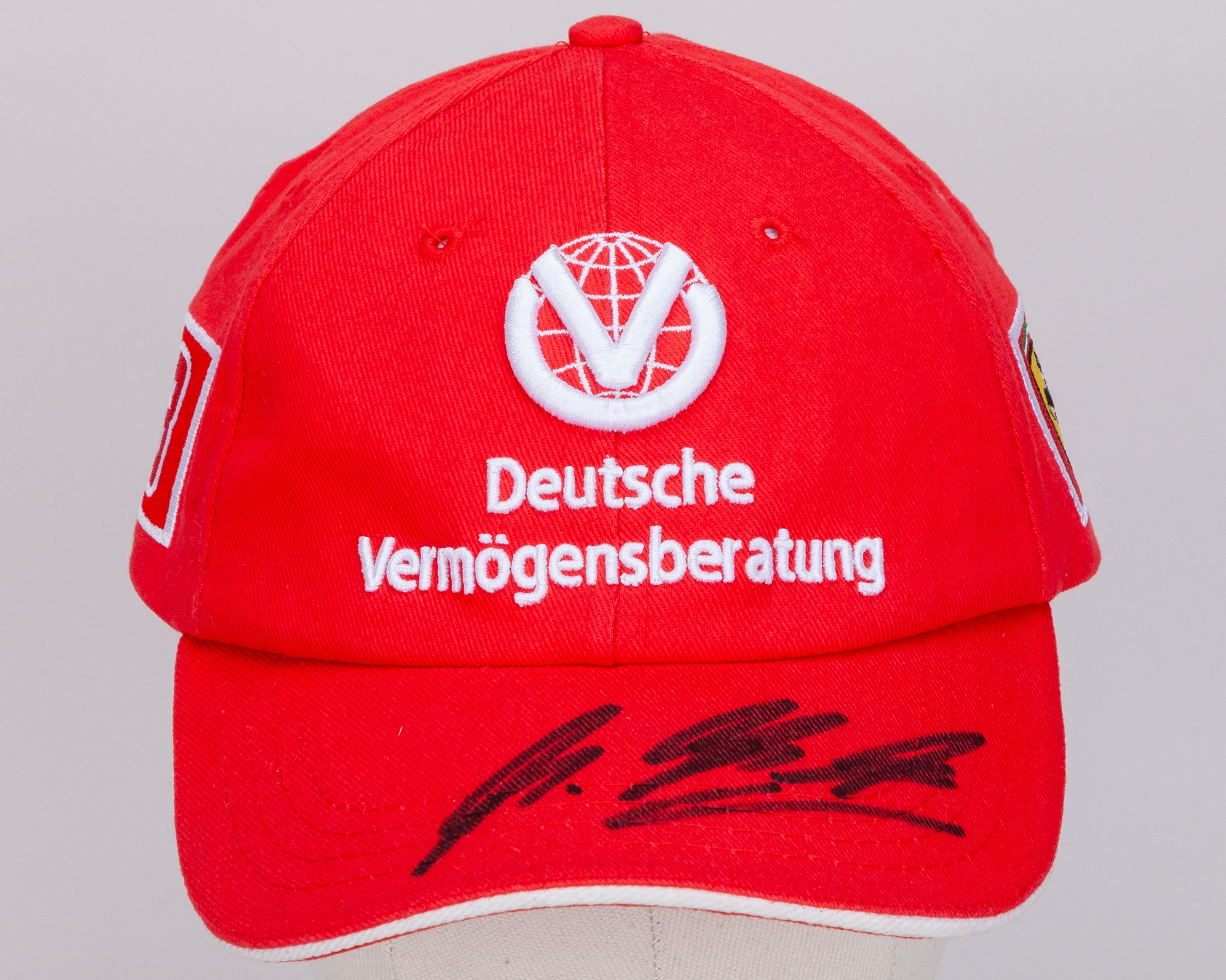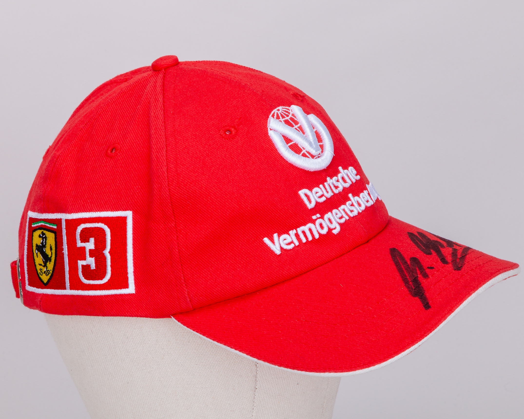 This is a Scuderia Ferrari Cap, personally signed by 7-time F1 World Champion, Michael Schumacher.
