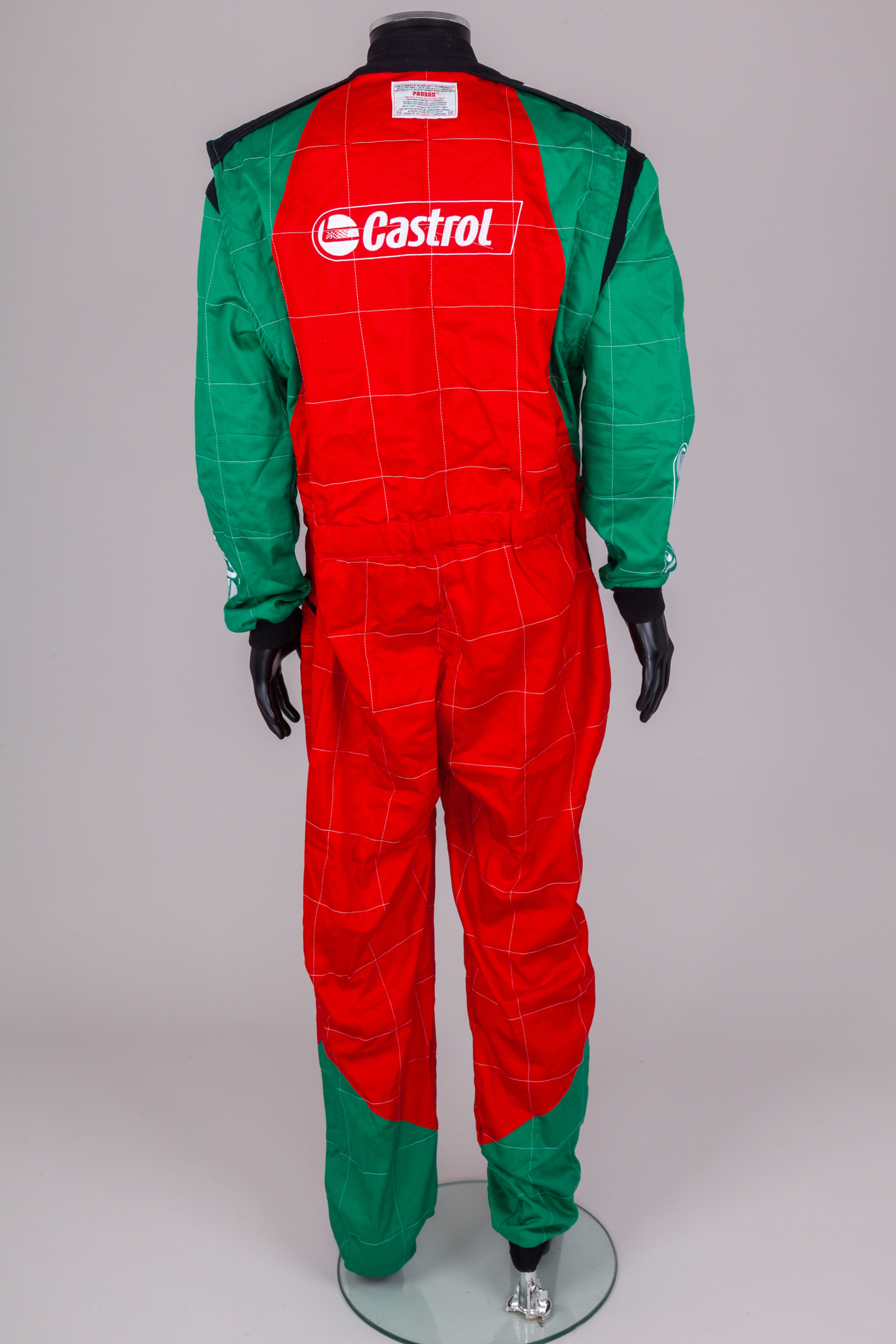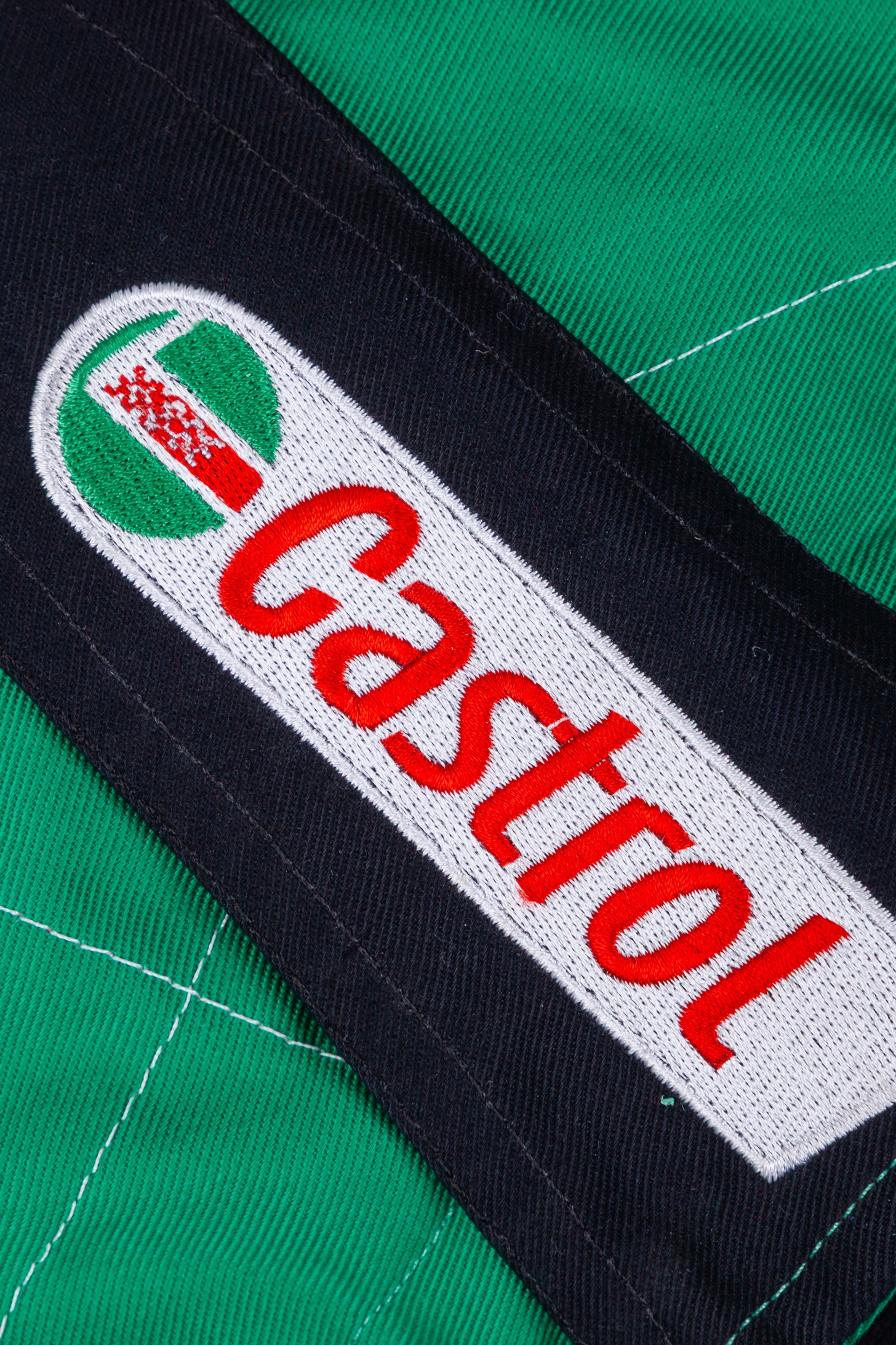 Authentic 1997 Castrol racing overalls featuring bold red, green, and black colour blocking with Castrol logos throughout.