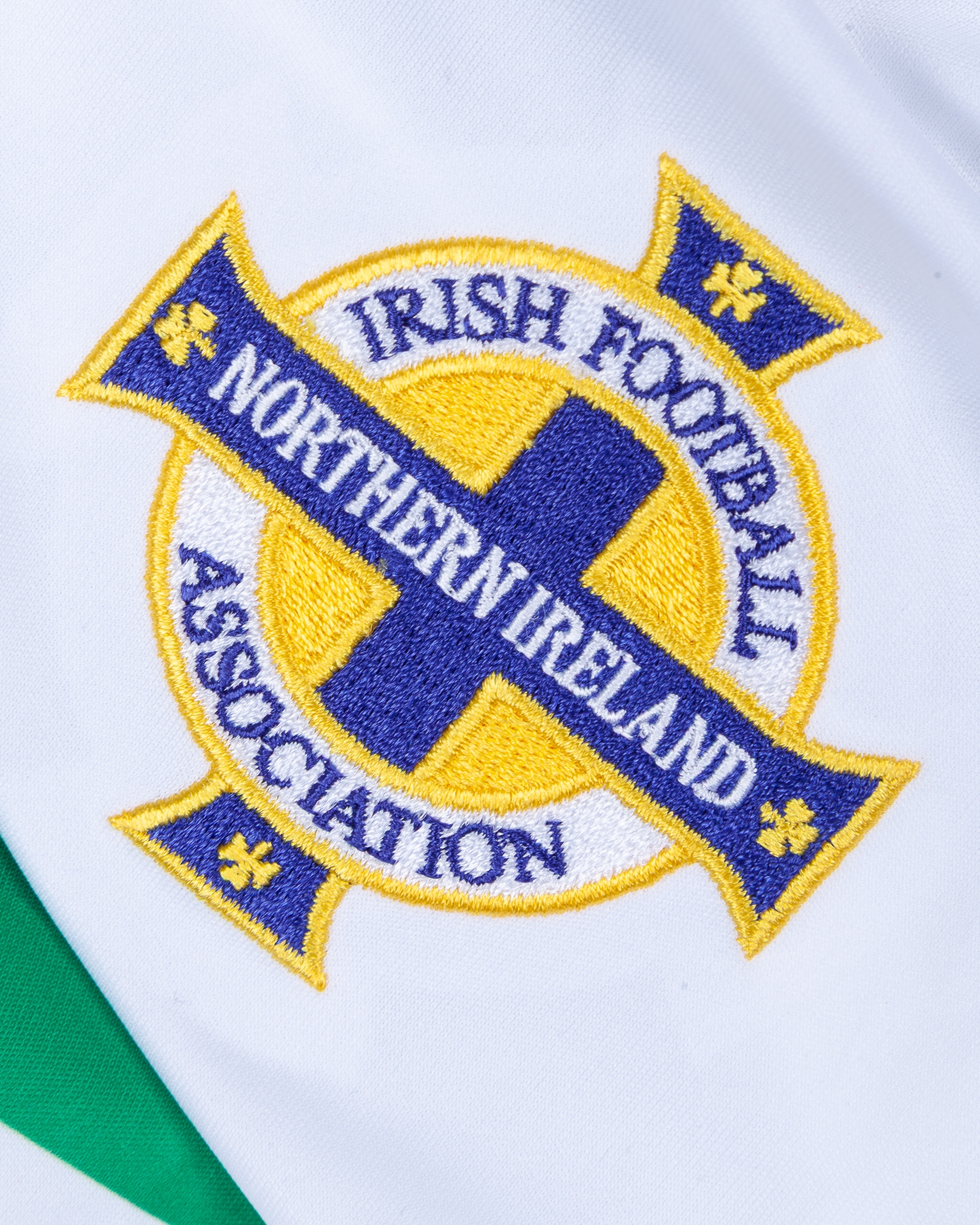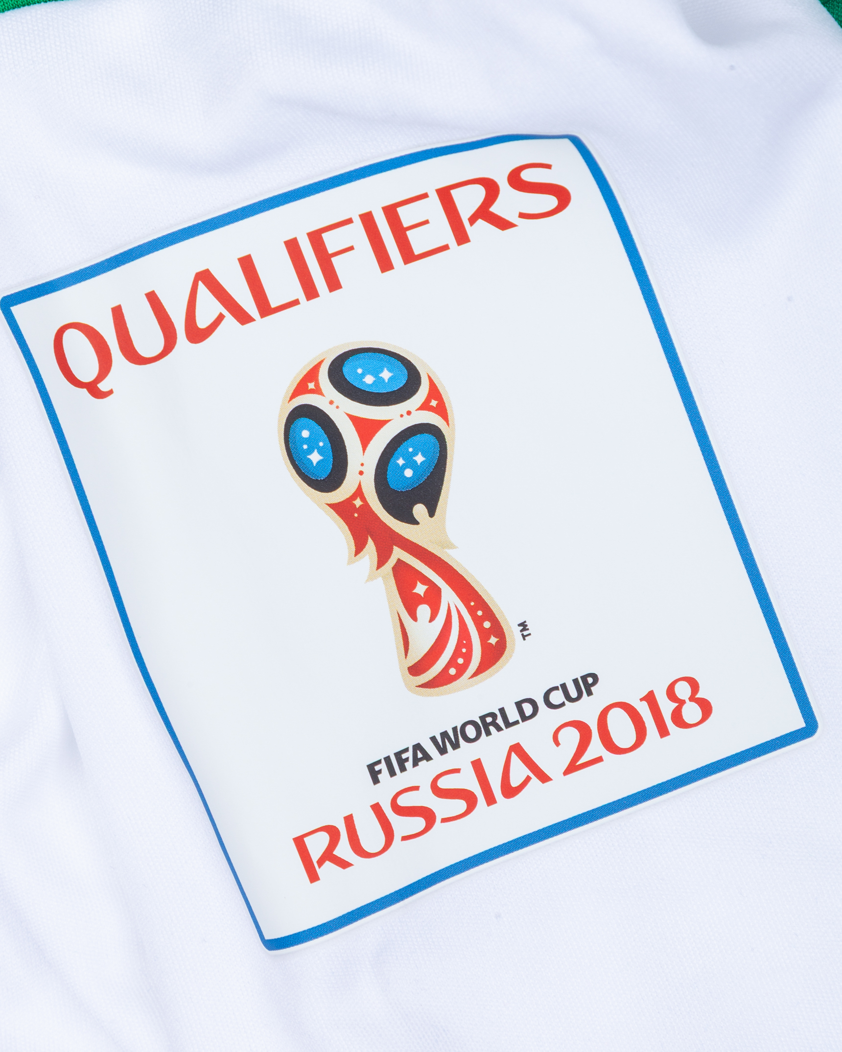 Kyle Lafferty white and green No.10 Northern Ireland v. Azerbaijan match worn short-sleeved shirt, 2017, Adidas, M, with v-neck collar and embroidered badge inscribed NORTHERN IRELAND IRISH FOOTBALL ASSOCIATION, with AZERBAIJAN V NORTHERN IRELAND 10th JUNE 2017 TOFIQ BAHRAMOV STADIUM BAKU decal, the reverse lettered K. LAFFERTY, the right sleeve with qualifiers Russia 2018 flash and the left sleeve with respect flash