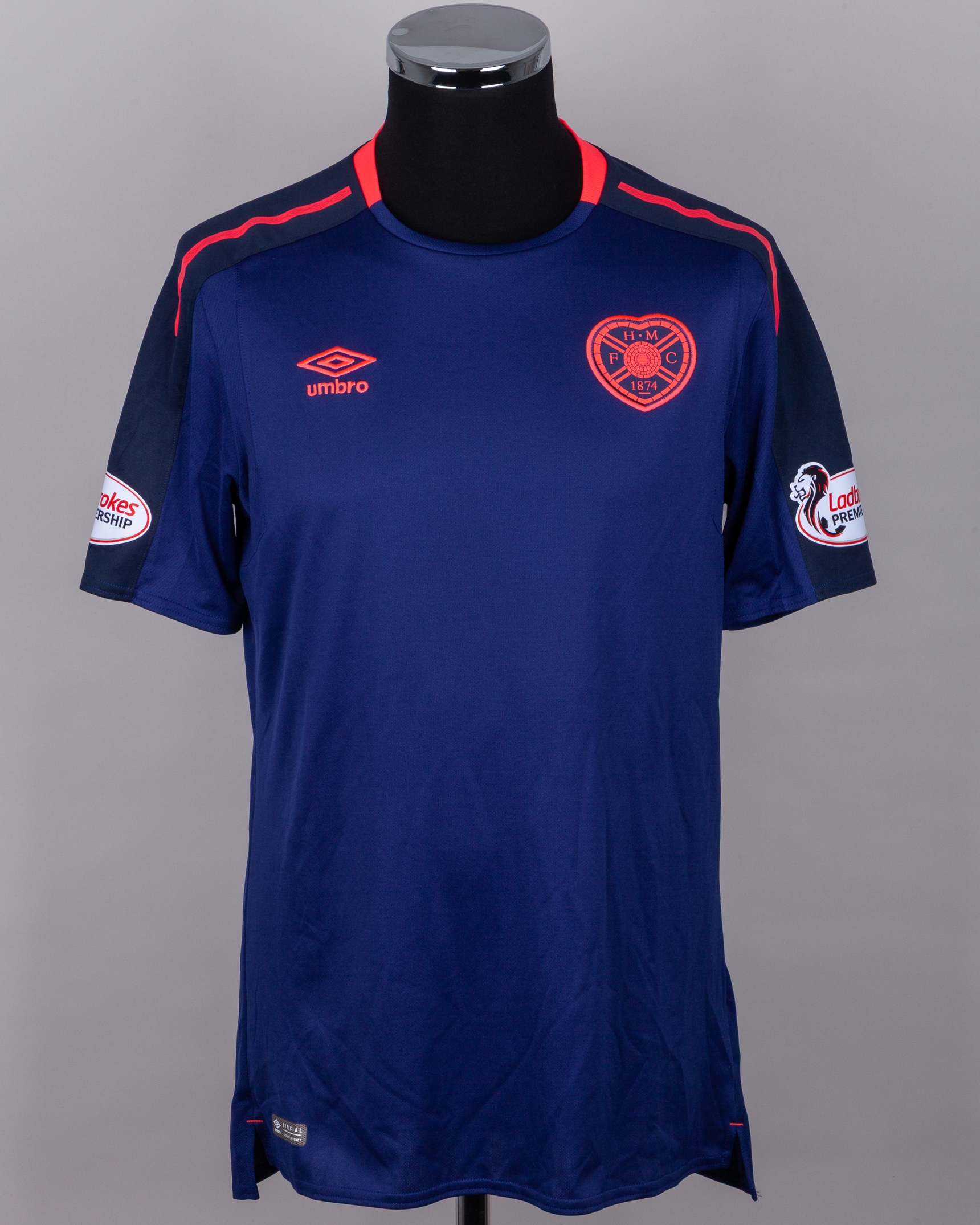 Kyle Lafferty blue and pink No.9 Hearts of Midlothian short-sleeved shirt, 2017-18, Umbro, L, with crew-neck collar and embroidered cloth badge inscribed H.M FC 1874, the reverse lettered LAFFERTY, the sleeves with Ladbrokes Premiership flashes